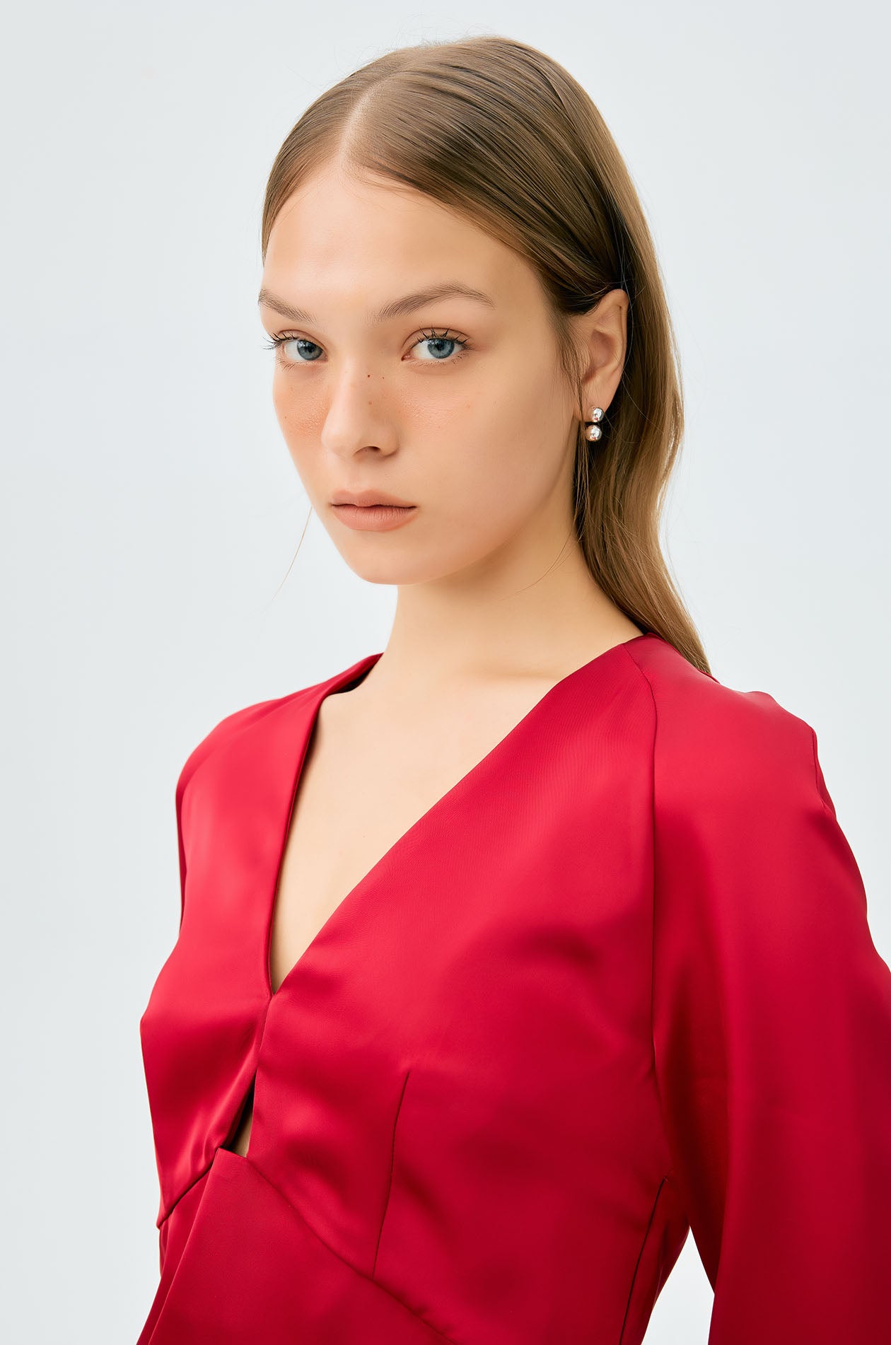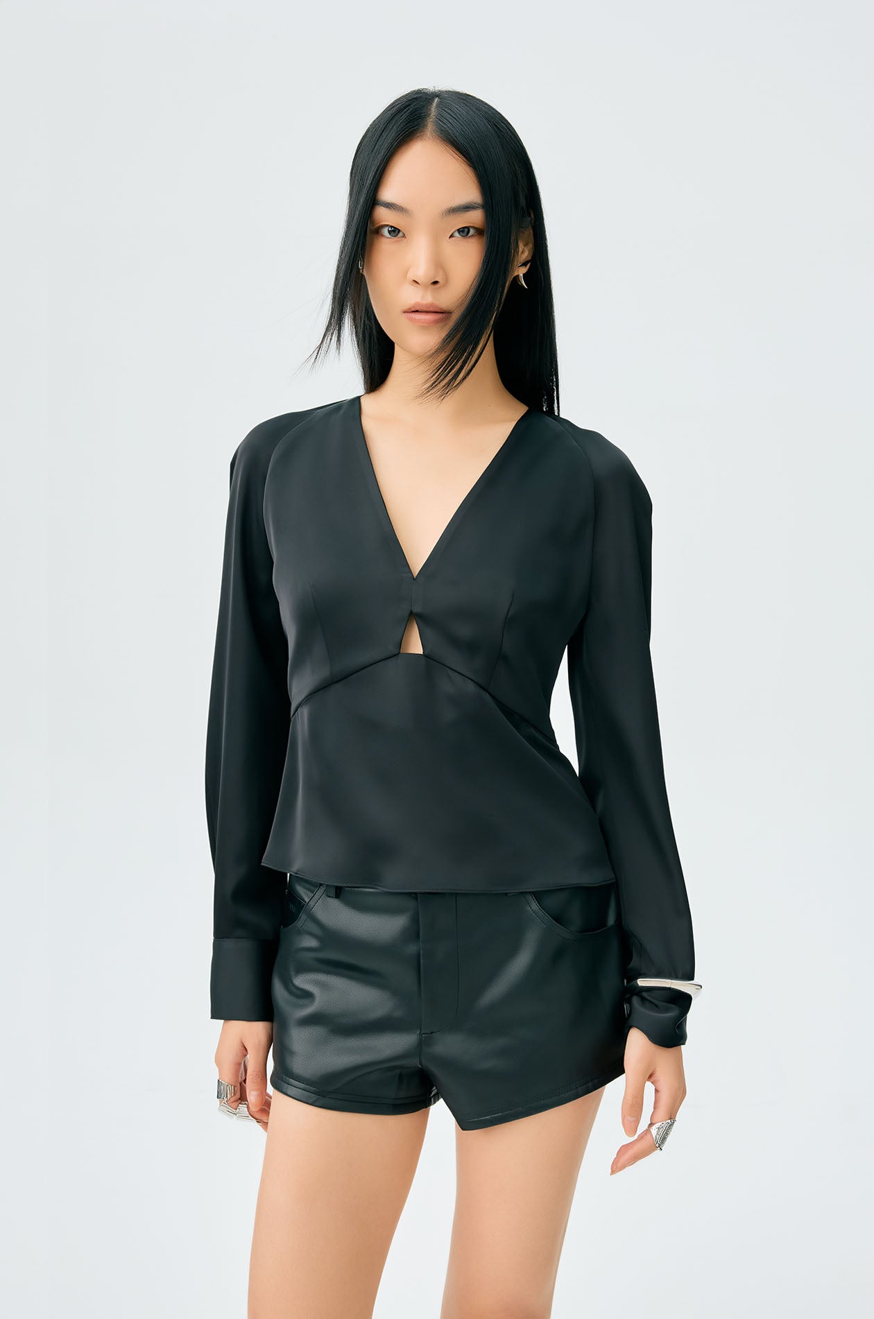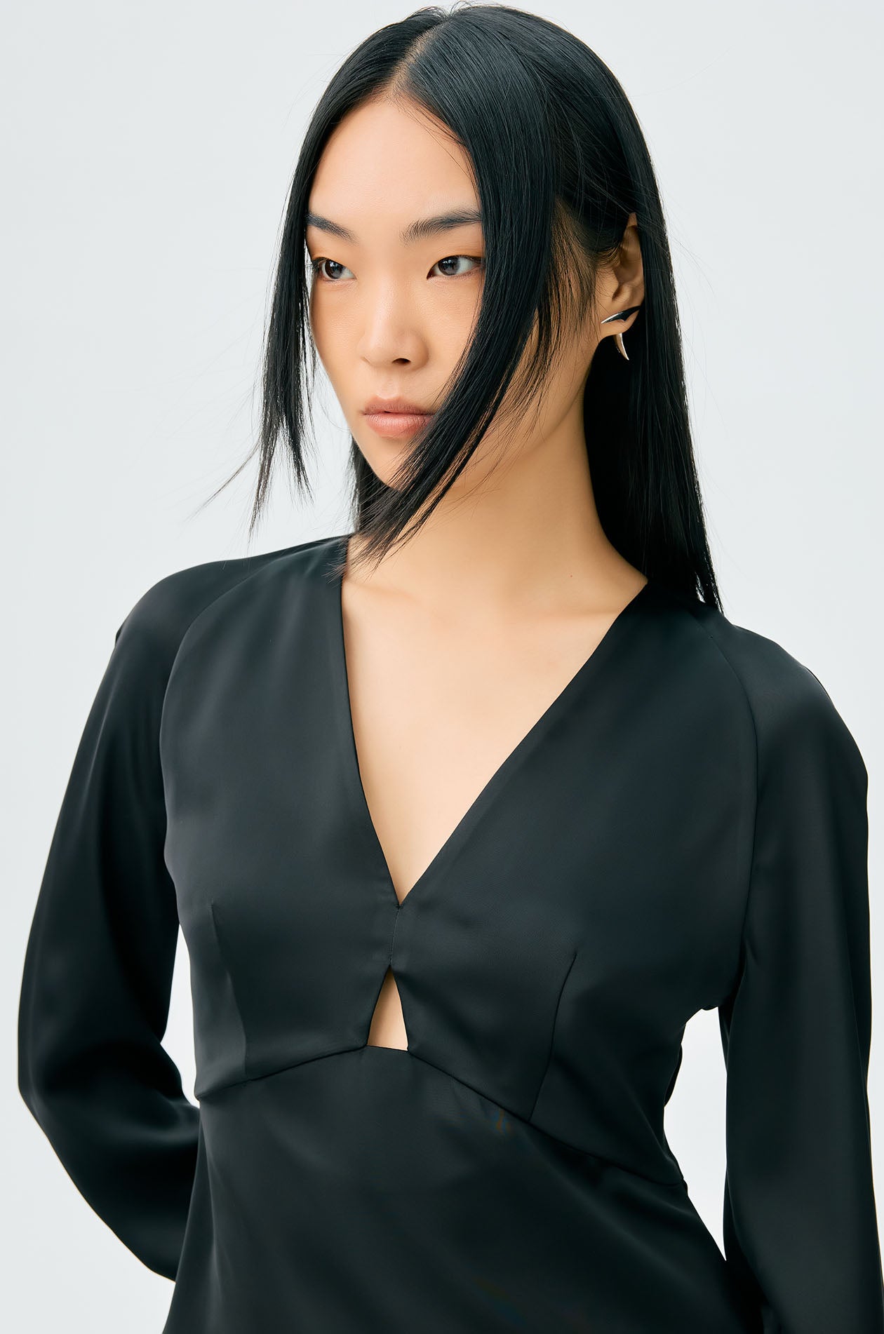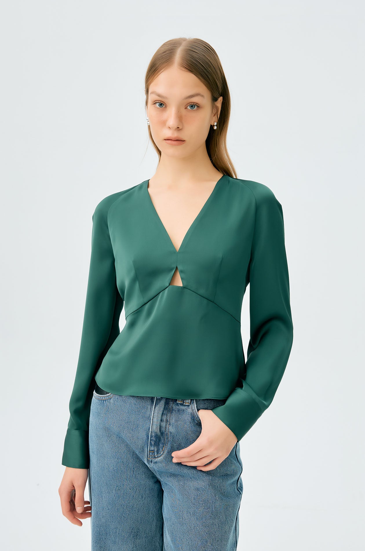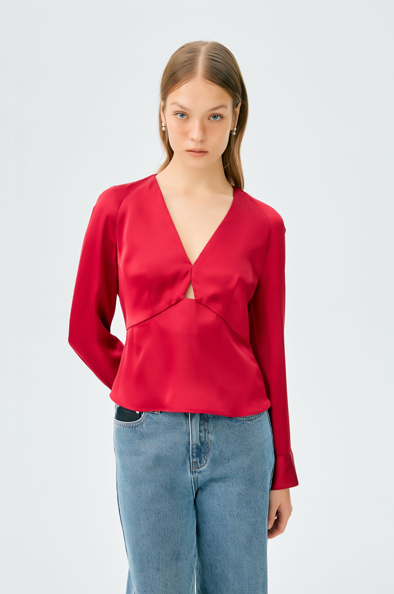 Long-sleeved blouse in satin. Slim fit with plunging neckline, chest cut-out detailing, and oversized cuffs. Available in black, haute red, and forest biome.