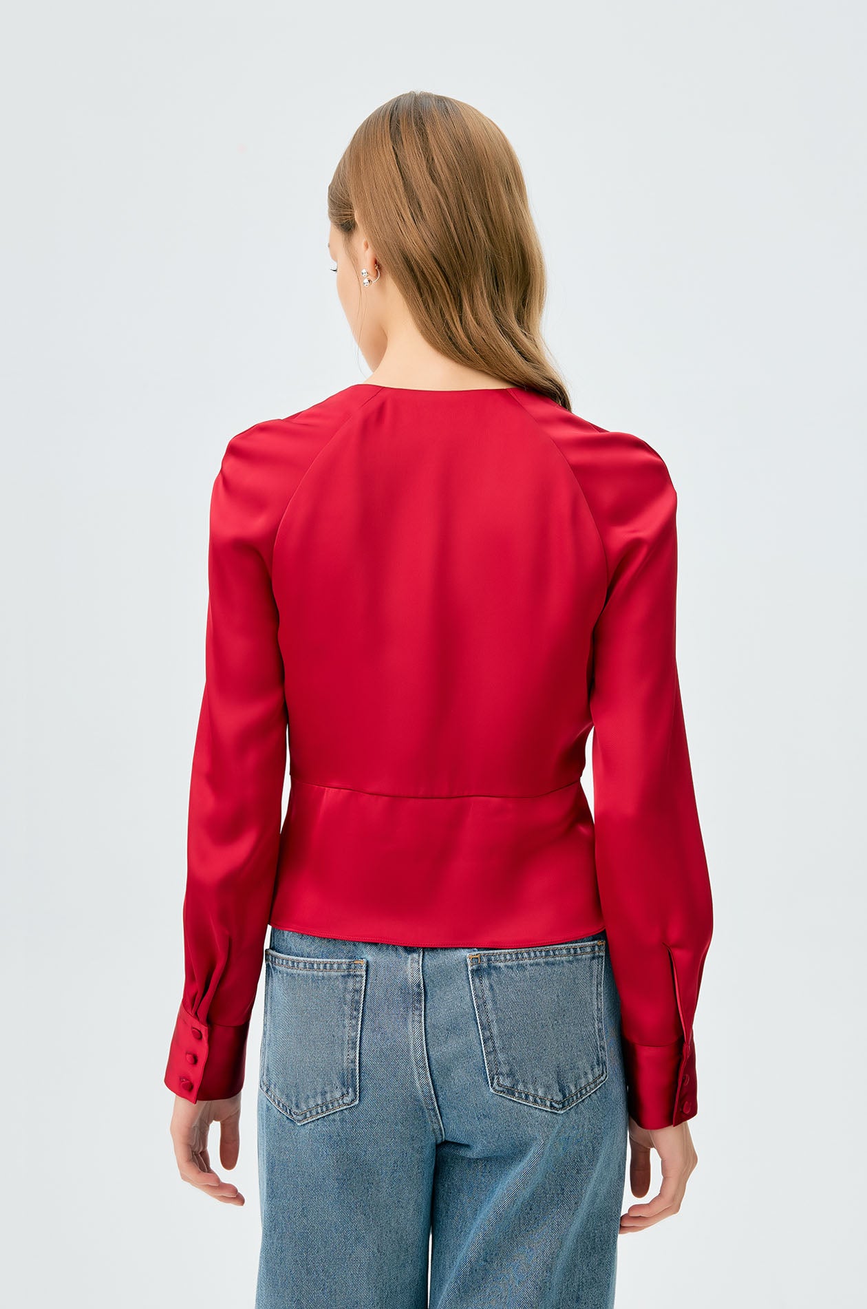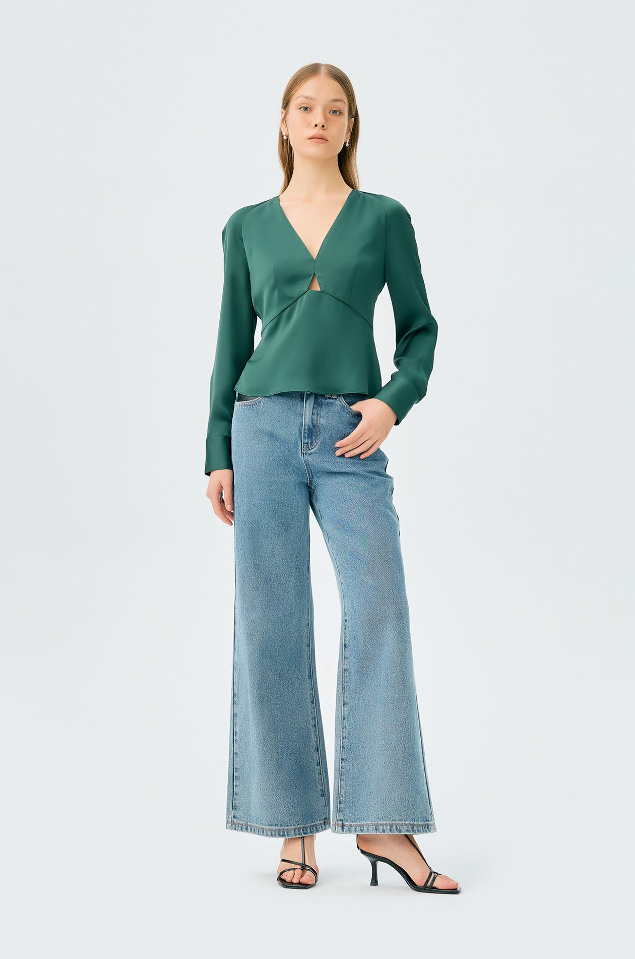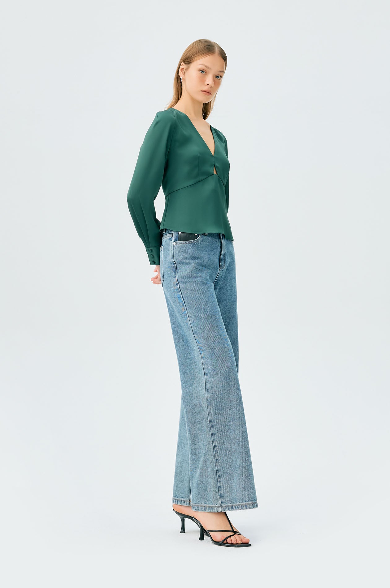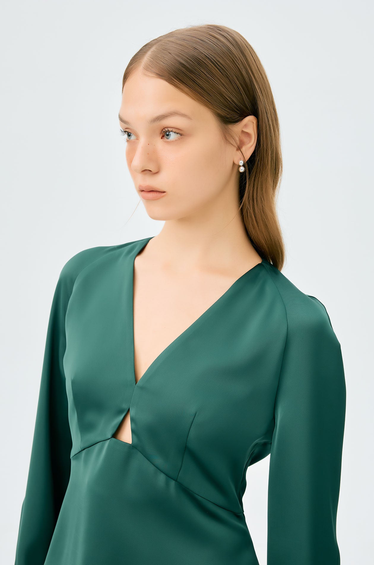 Long-sleeved blouse in satin. Slim fit with plunging neckline, chest cut-out detailing, and oversized cuffs. Available in black, haute red, and forest biome.