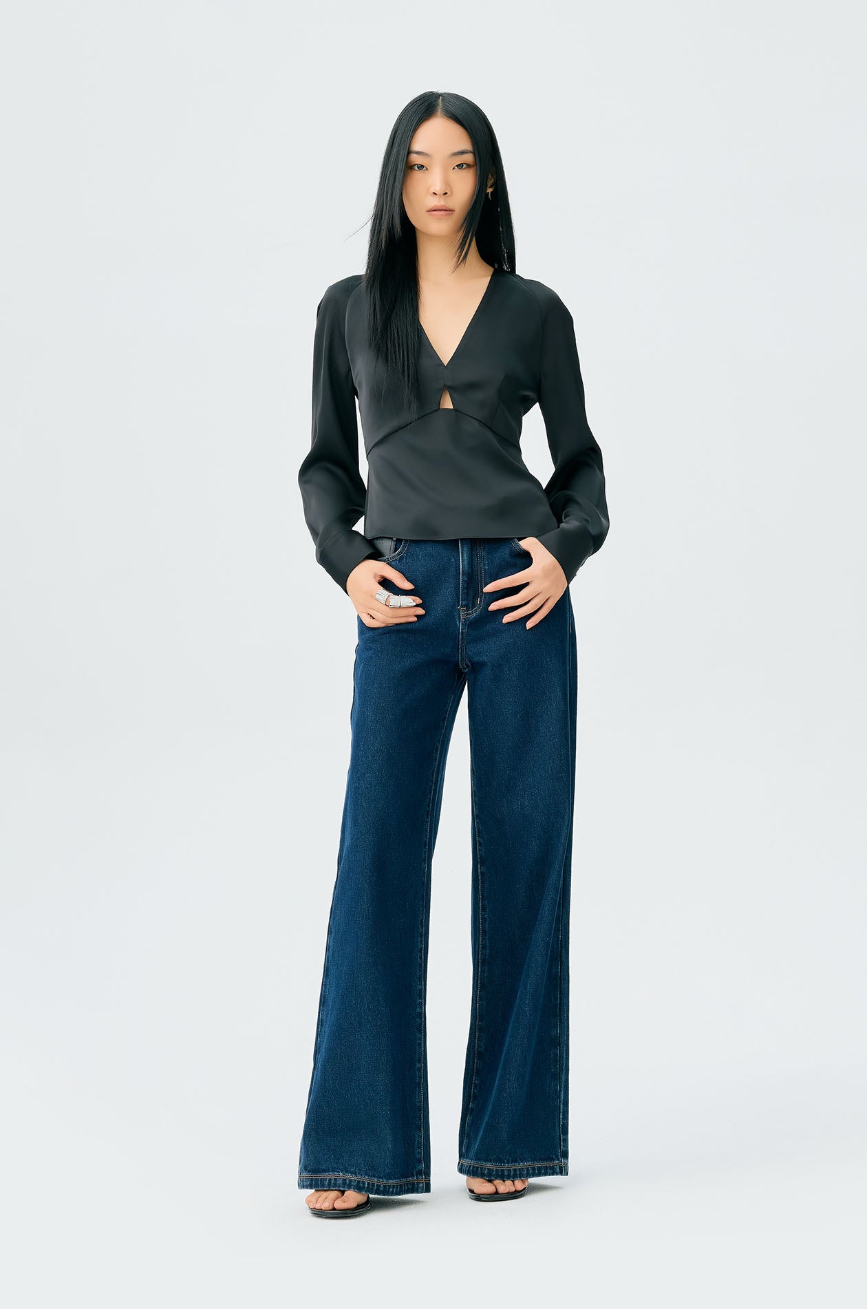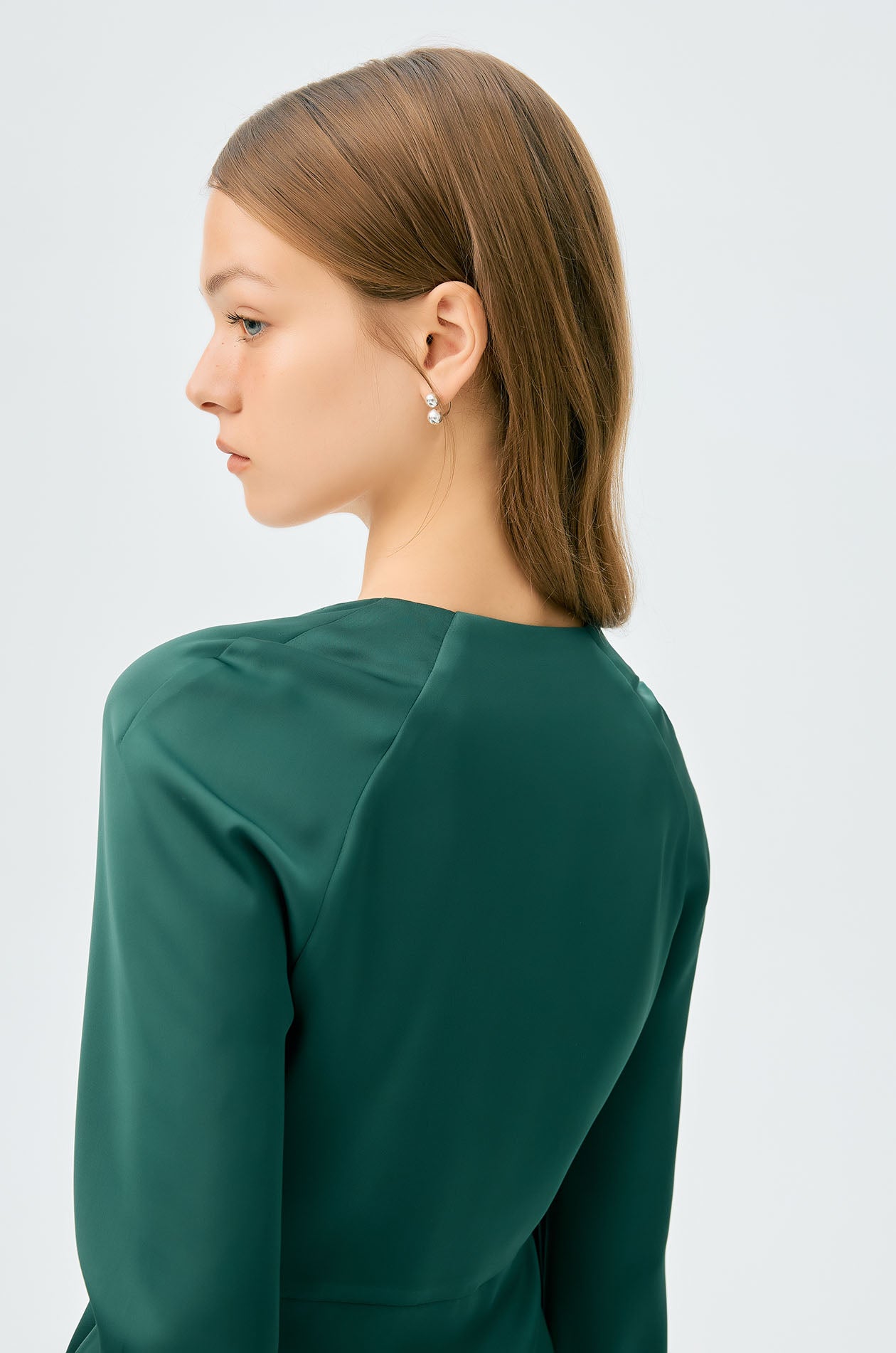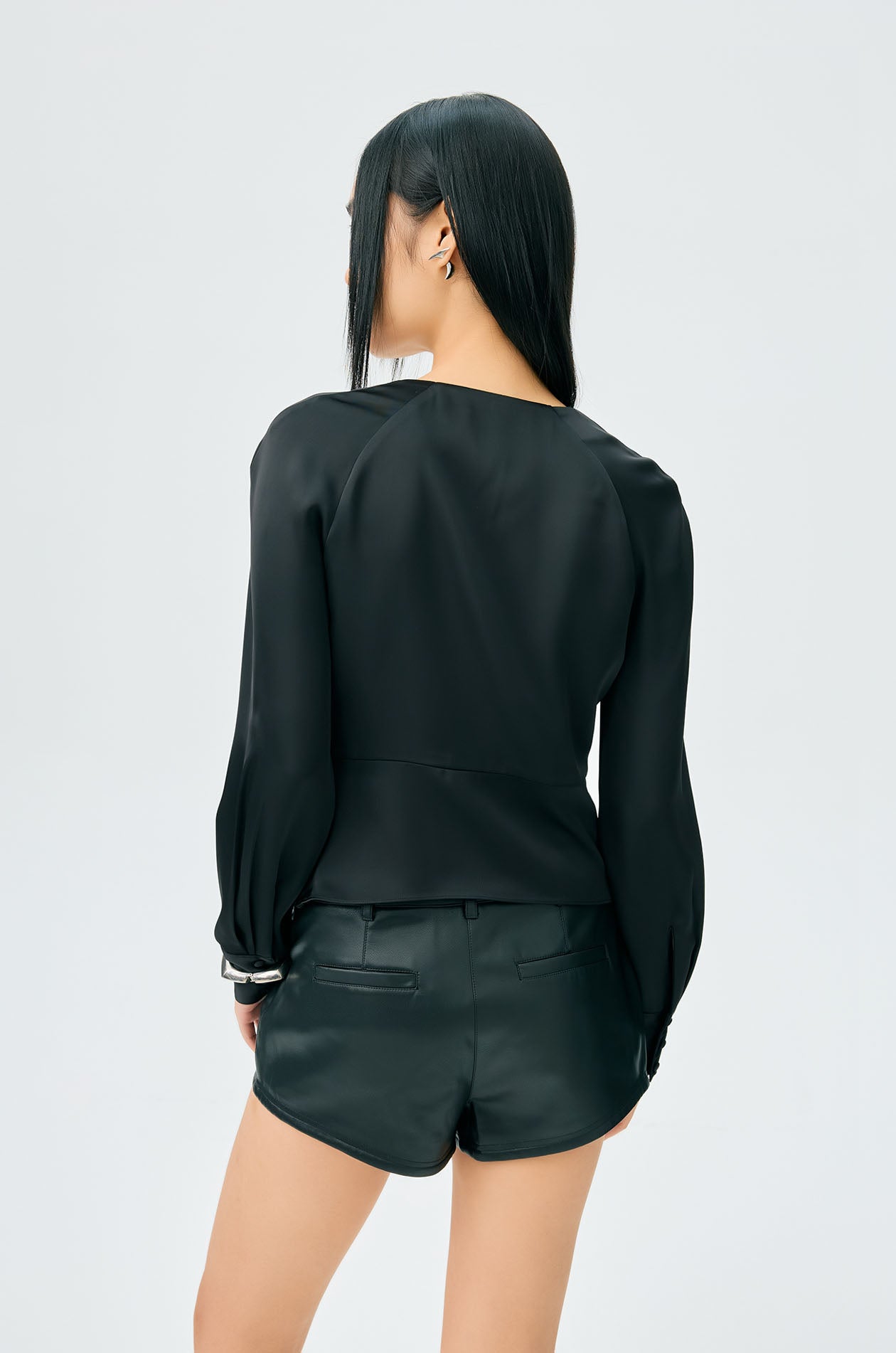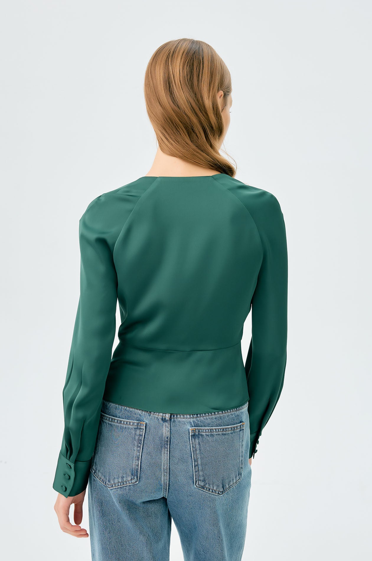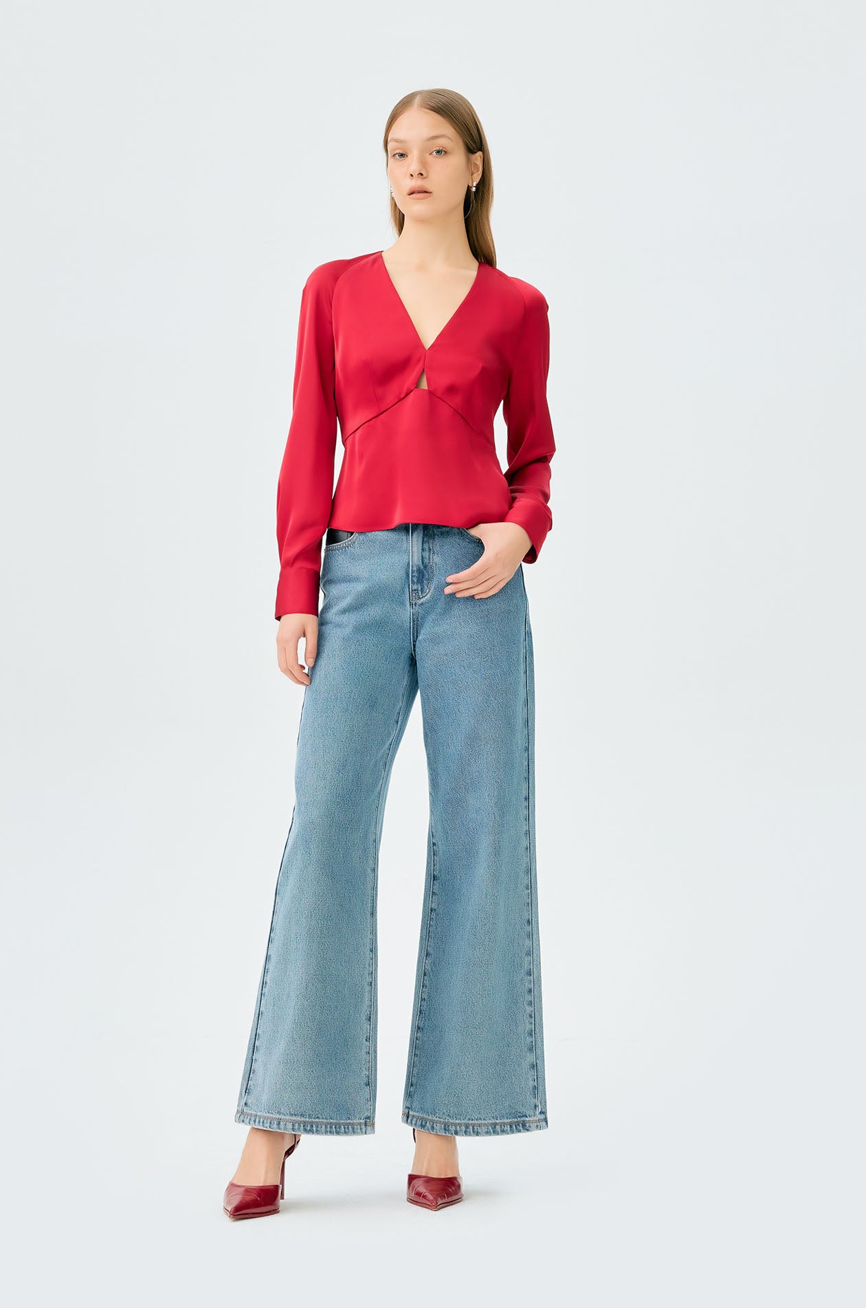 Long-sleeved blouse in satin. Slim fit with plunging neckline, chest cut-out detailing, and oversized cuffs. Available in black, haute red, and forest biome.