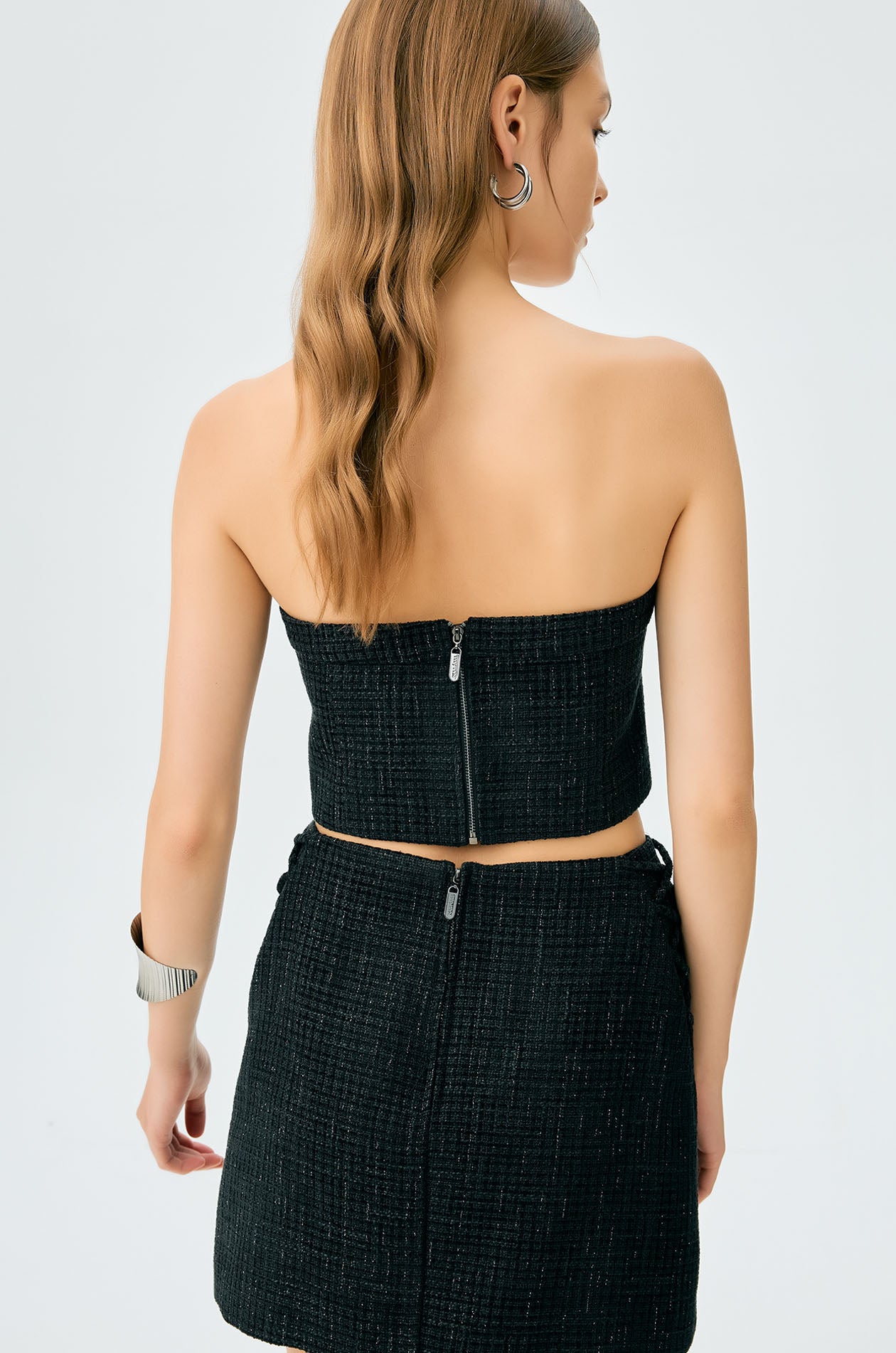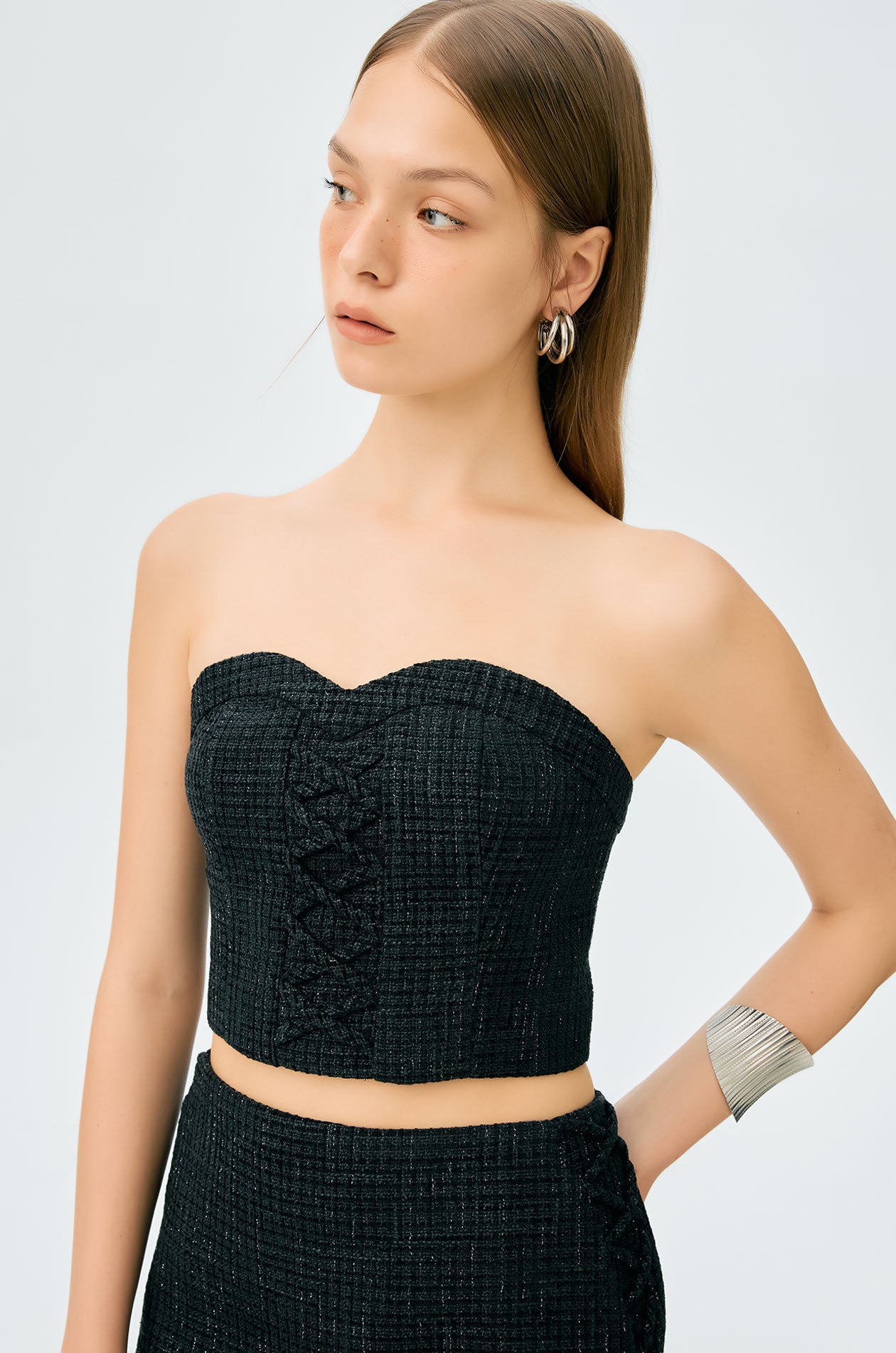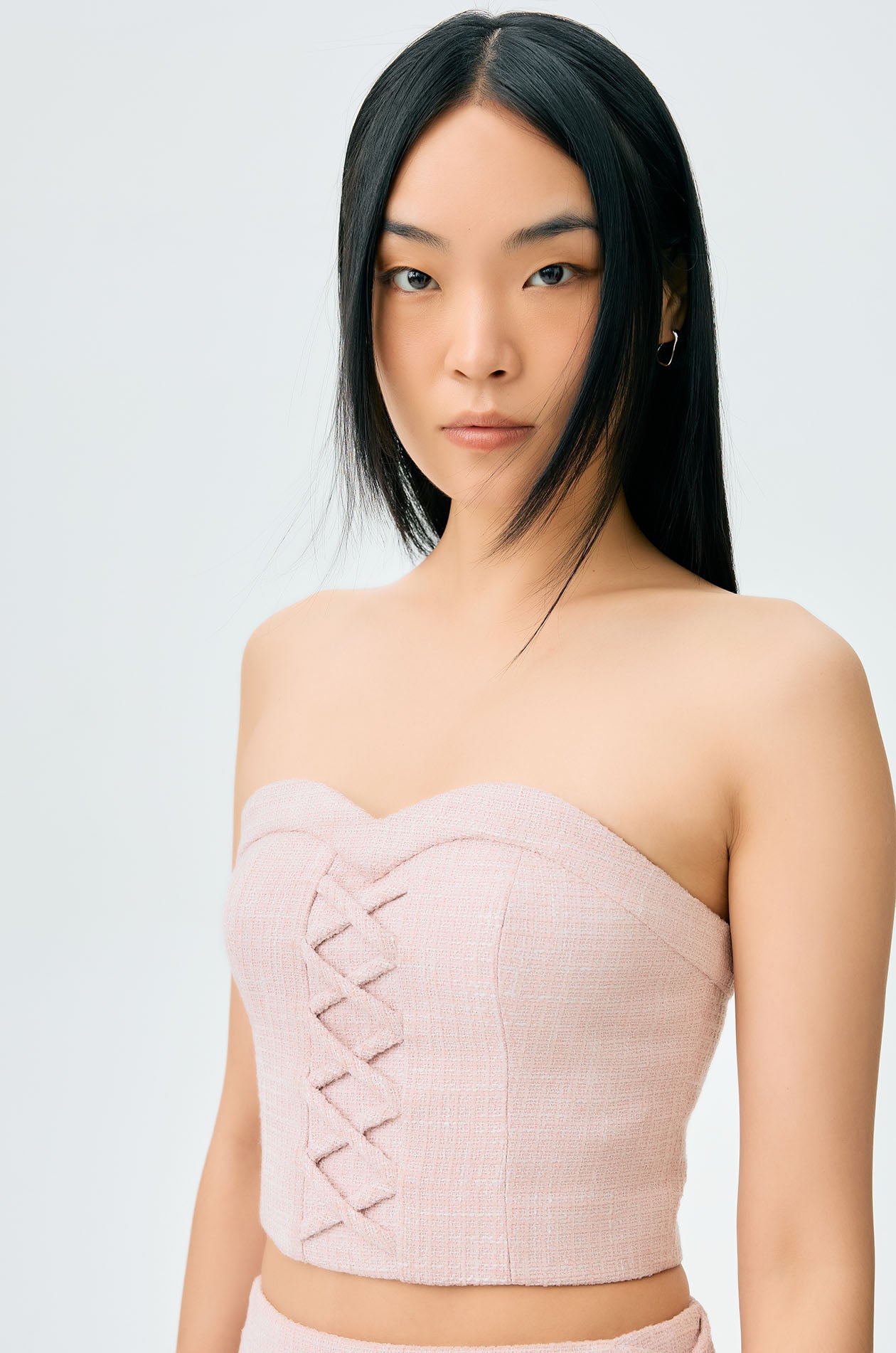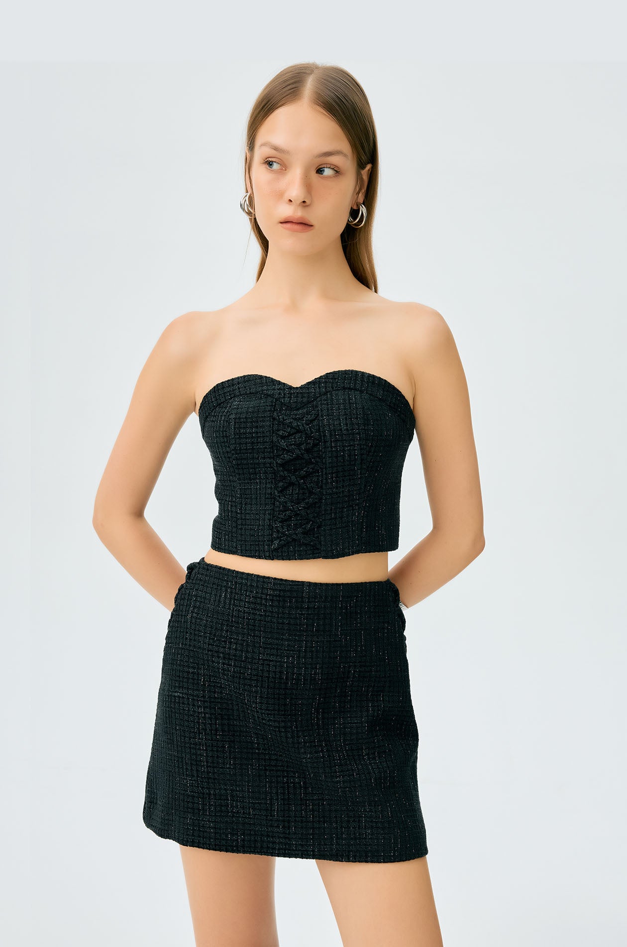 Strapless crop top in tweed. Bandeau style with sweetheart neckline and lace-up detail. Back zip closure. Available in black and spanish villa.