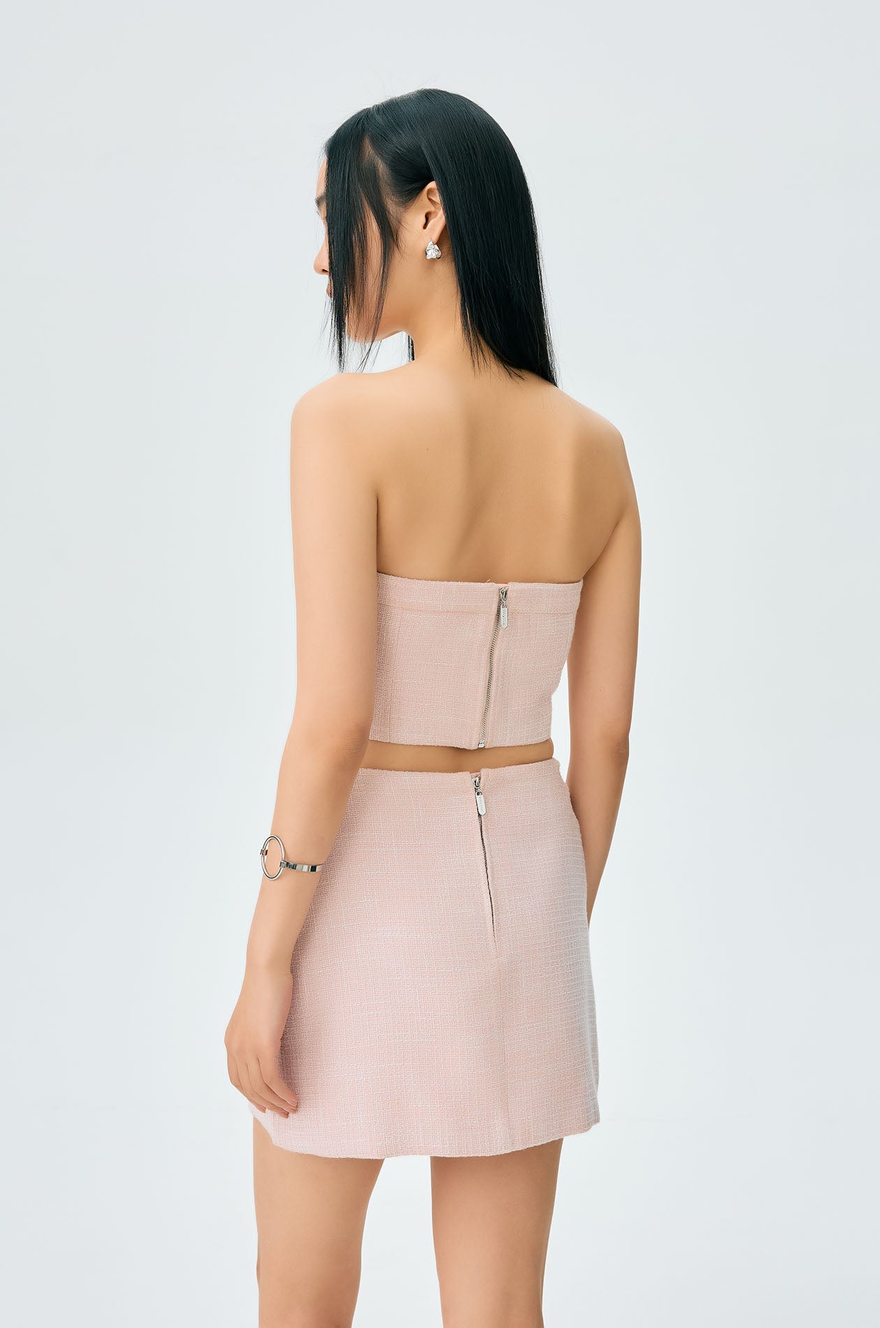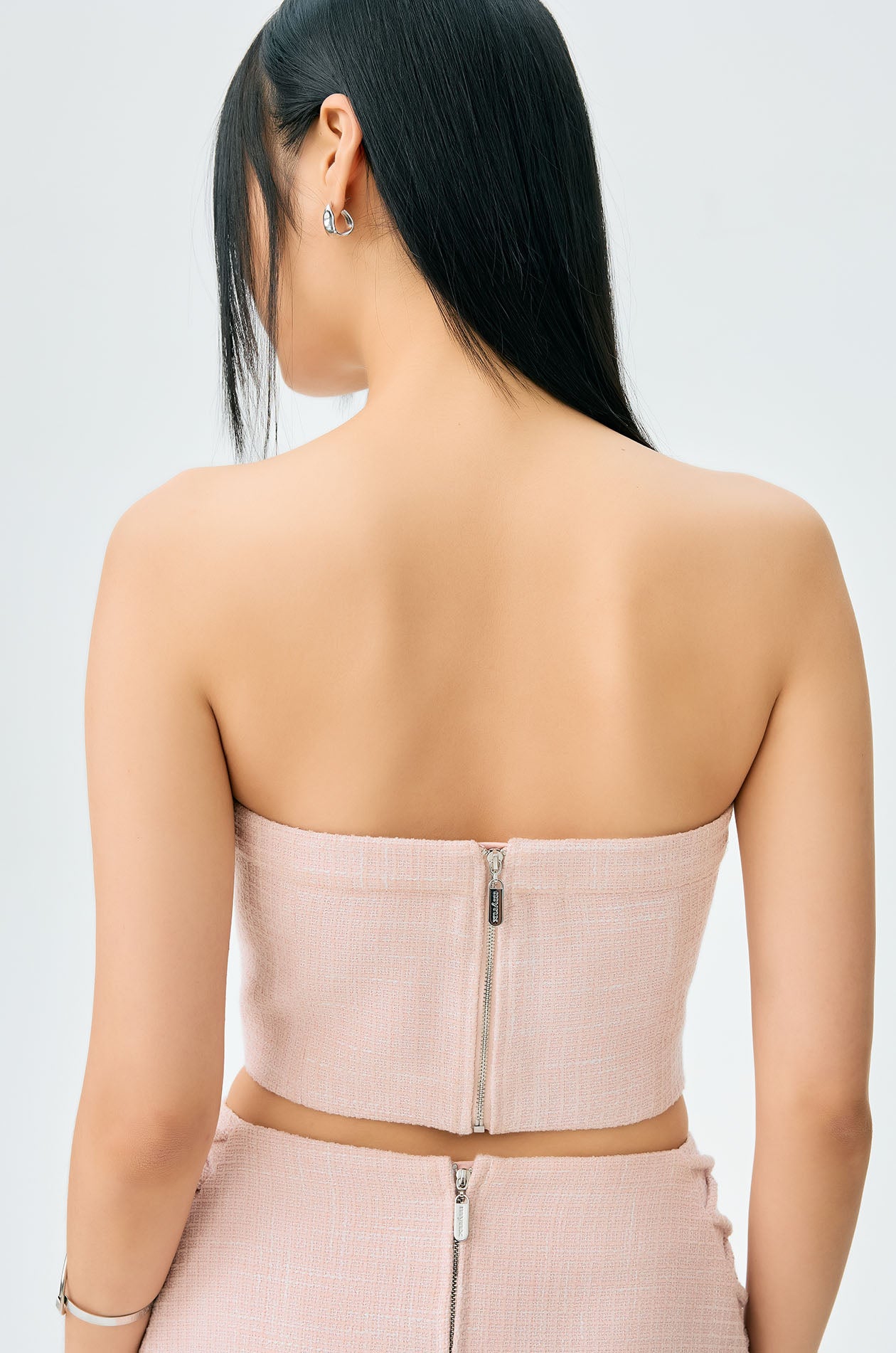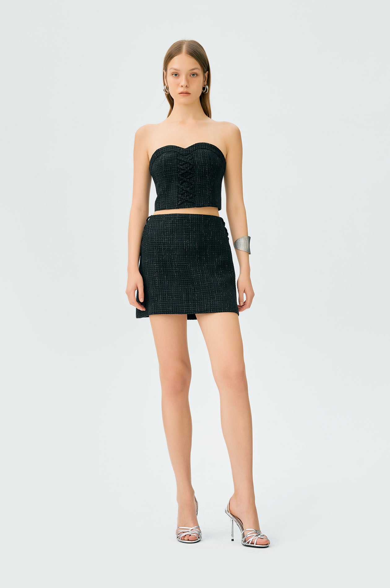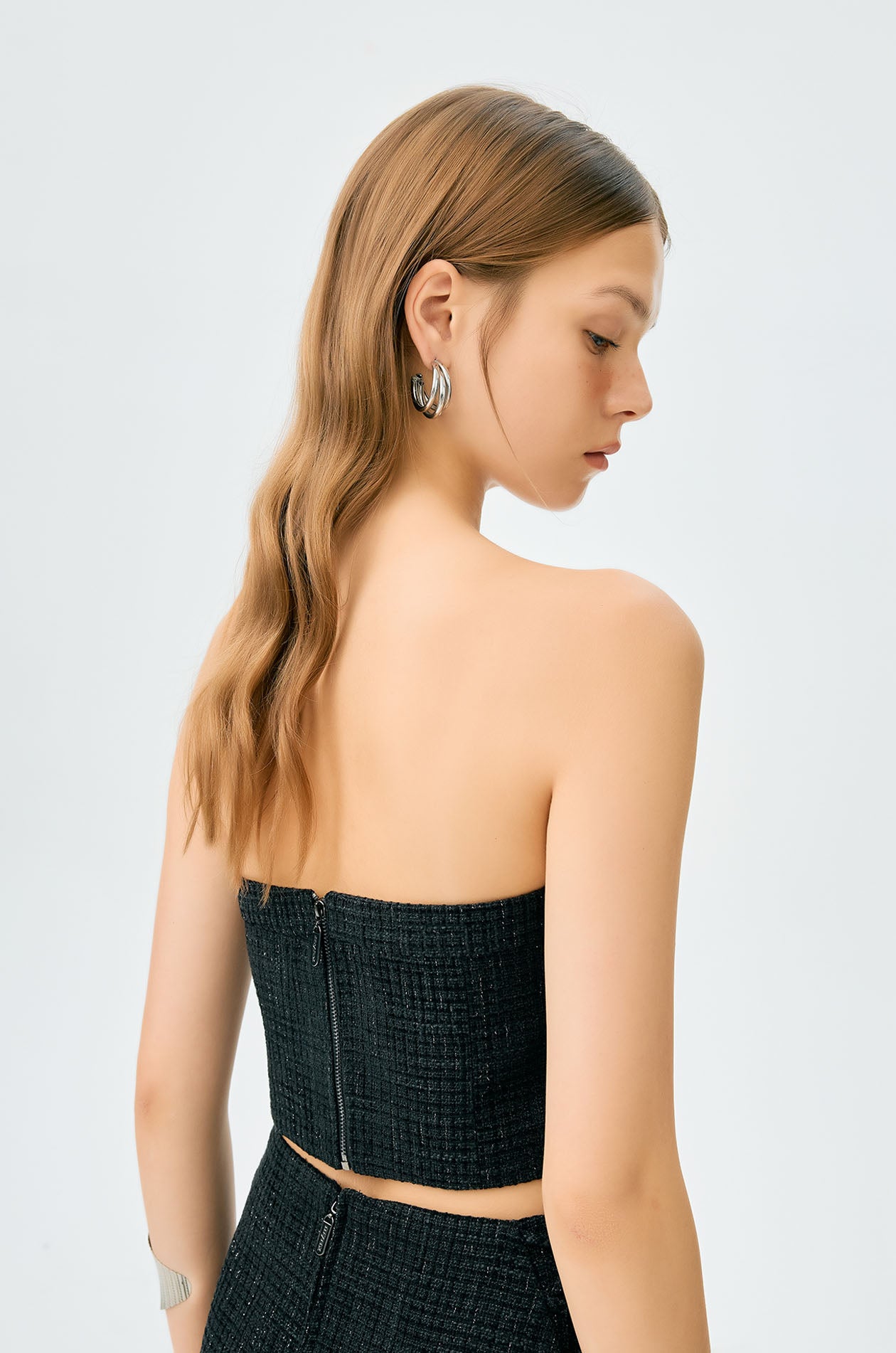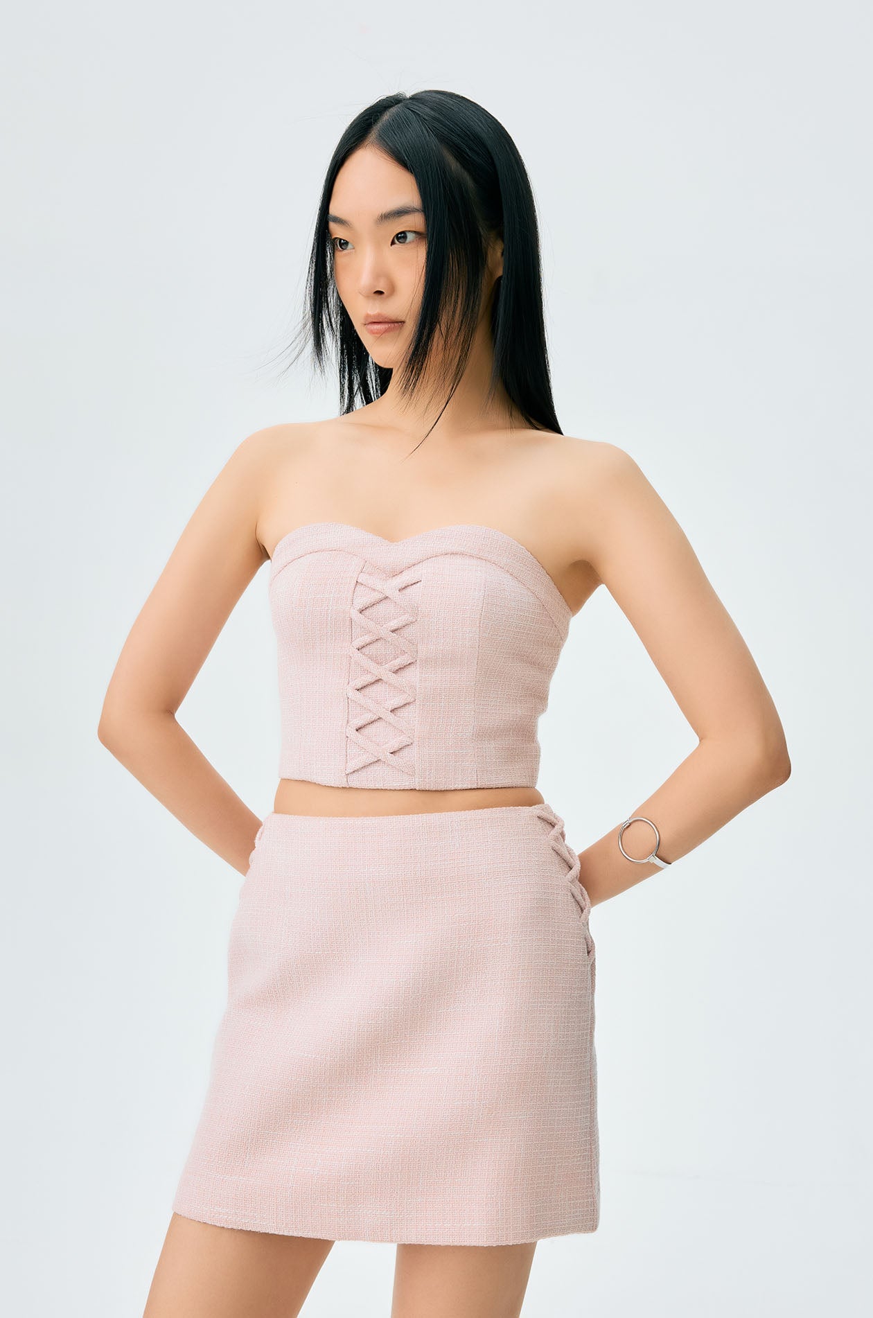 Strapless crop top in tweed. Bandeau style with sweetheart neckline and lace-up detail. Back zip closure. Available in black and spanish villa.