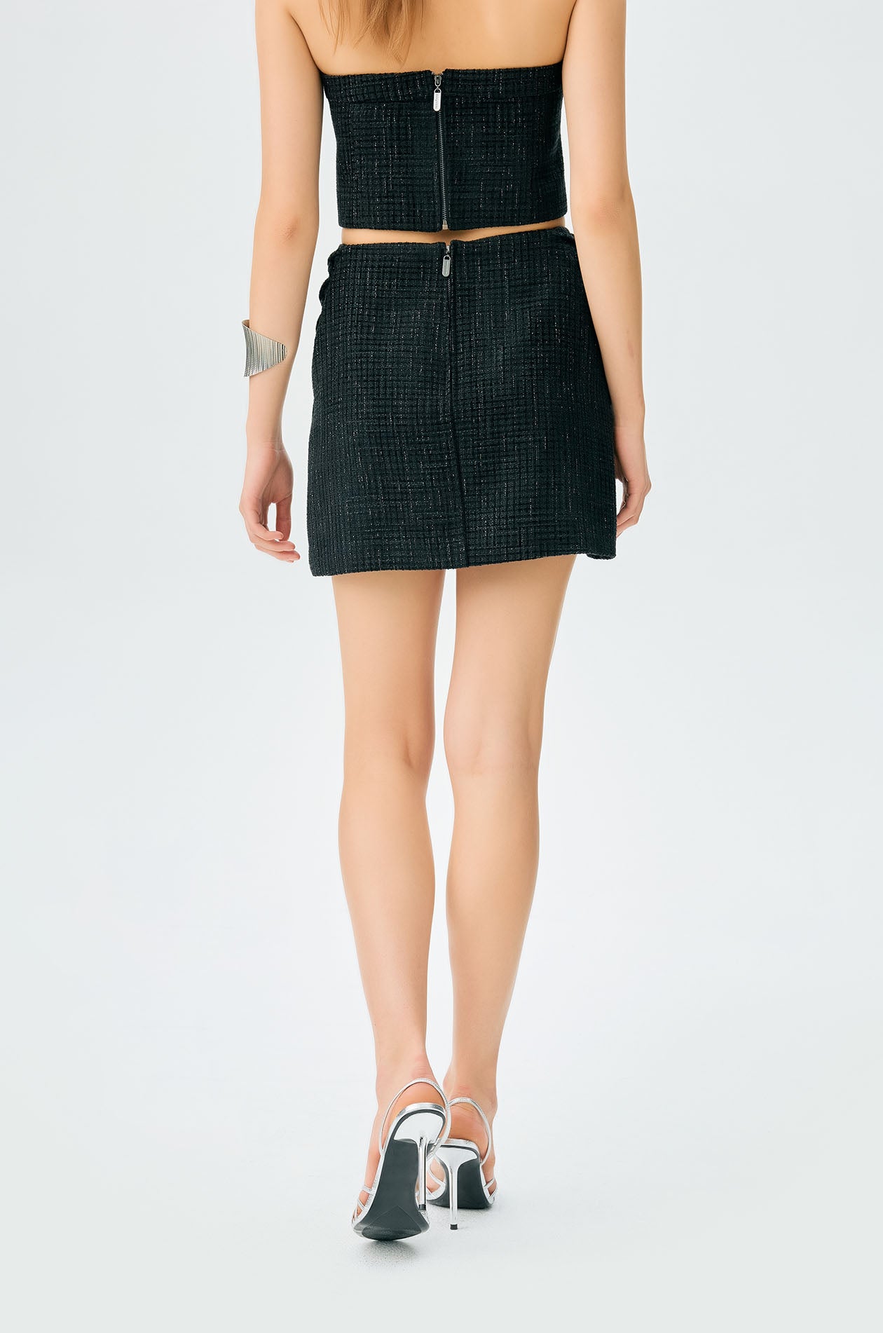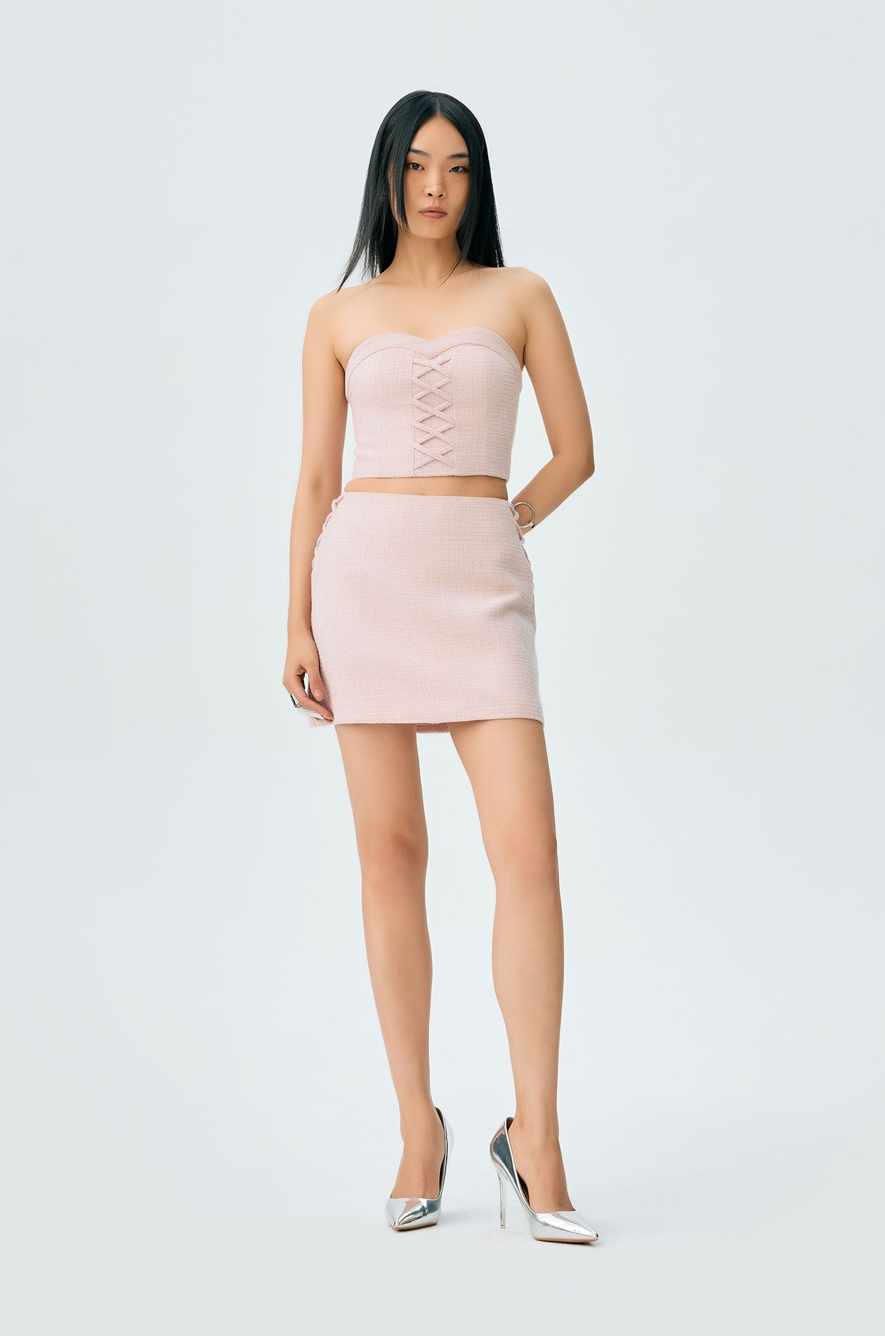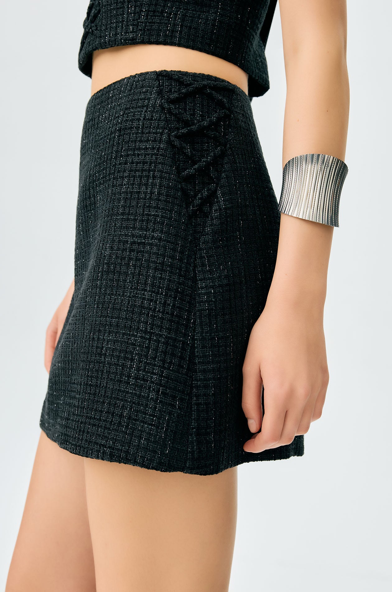 Mid-rise mini skirt in tweed. Column silhouette with lace-up detail. Back zip closure. Available in black and spanish villa.