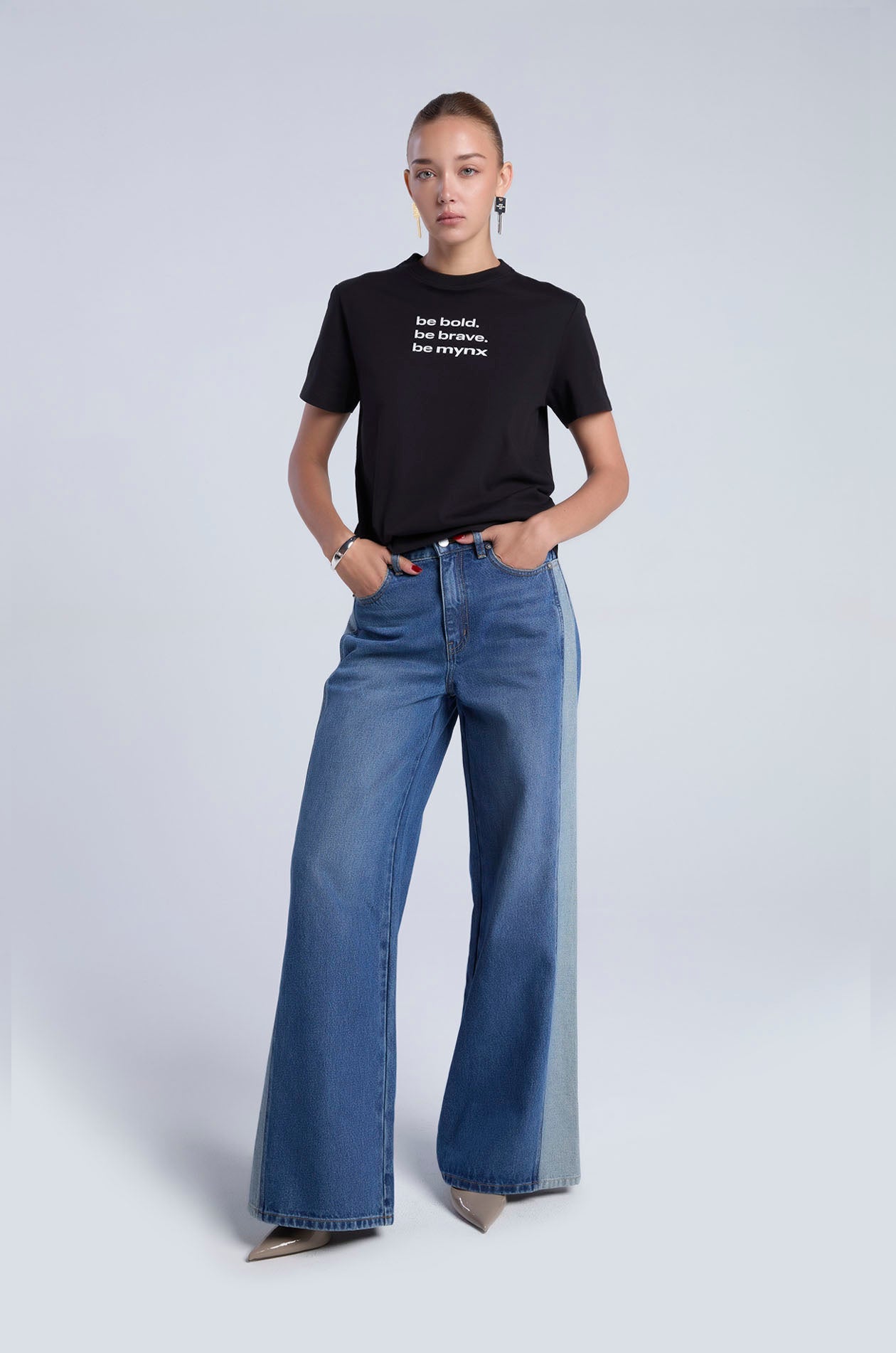 High-rise jeans in cotton denim. Wide legs and five-pocket style with faux leather trim. Front button and zip closure. Available in dark blue.