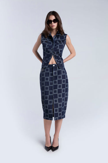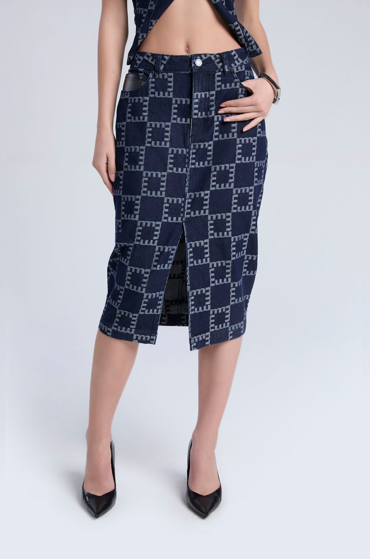 Mid-rise midi skirt in jacquard denim with monogram motif. Pencil silhouette with front slit and five-pocket style with faux leather patch. Front button and zip closure. Available in indigo.