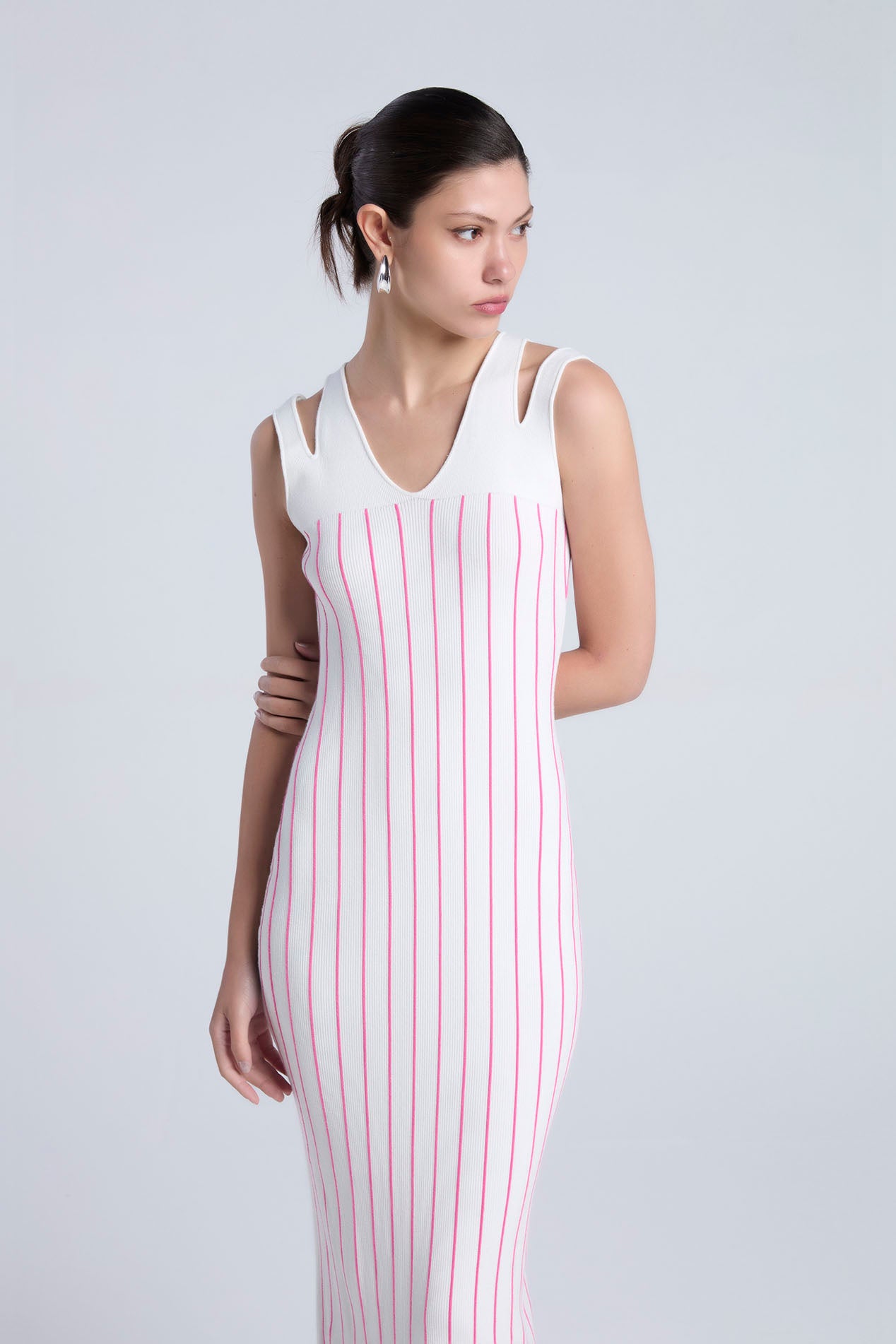 Maxi tank dress in ribbed knit with stripes. Fitted silhouette with V-neck and chunky shoulder straps with cut-out. Available in black and white.