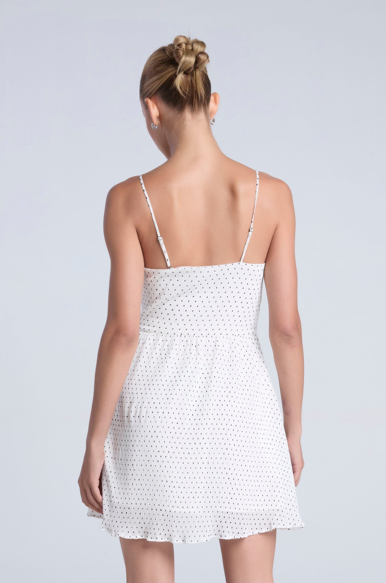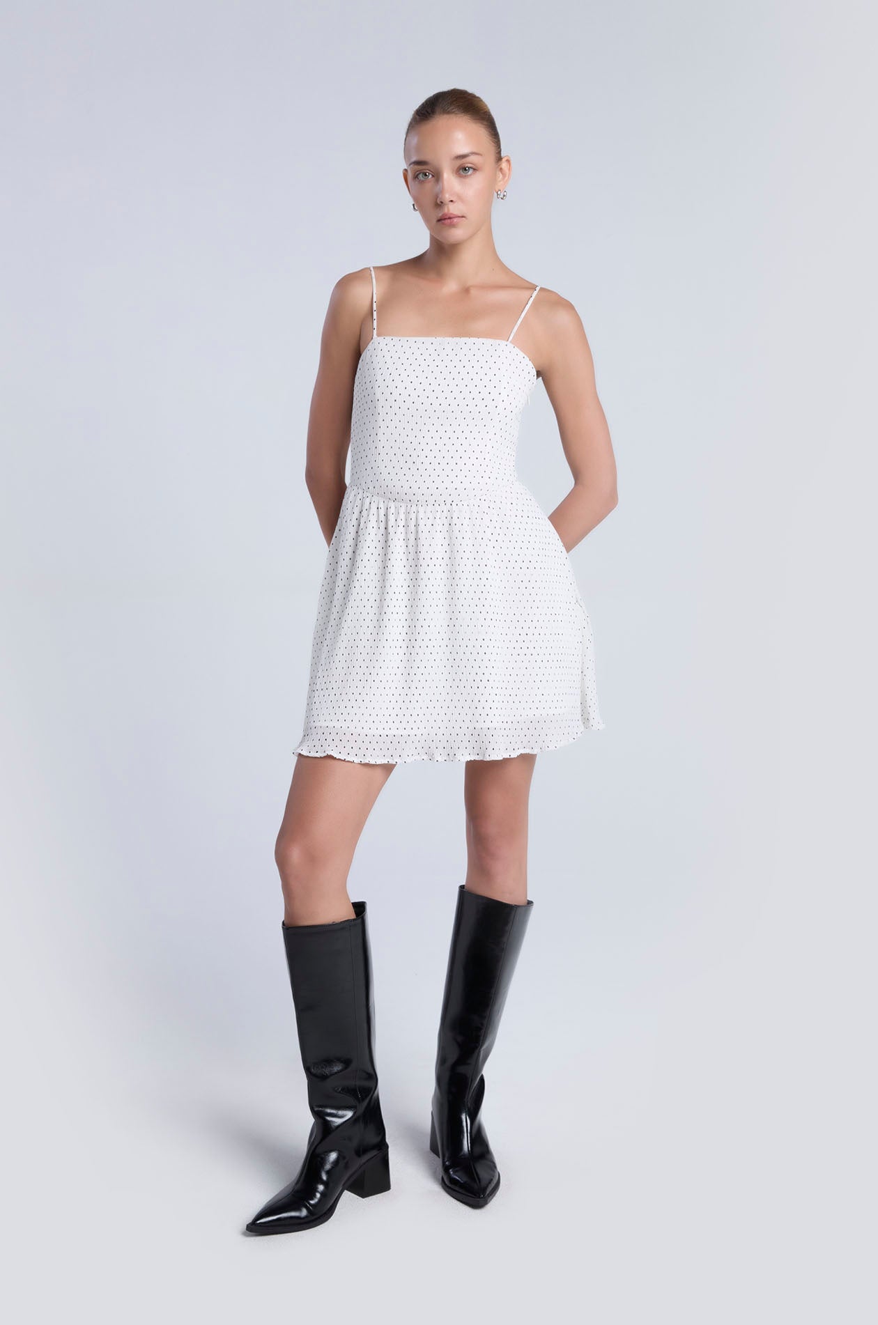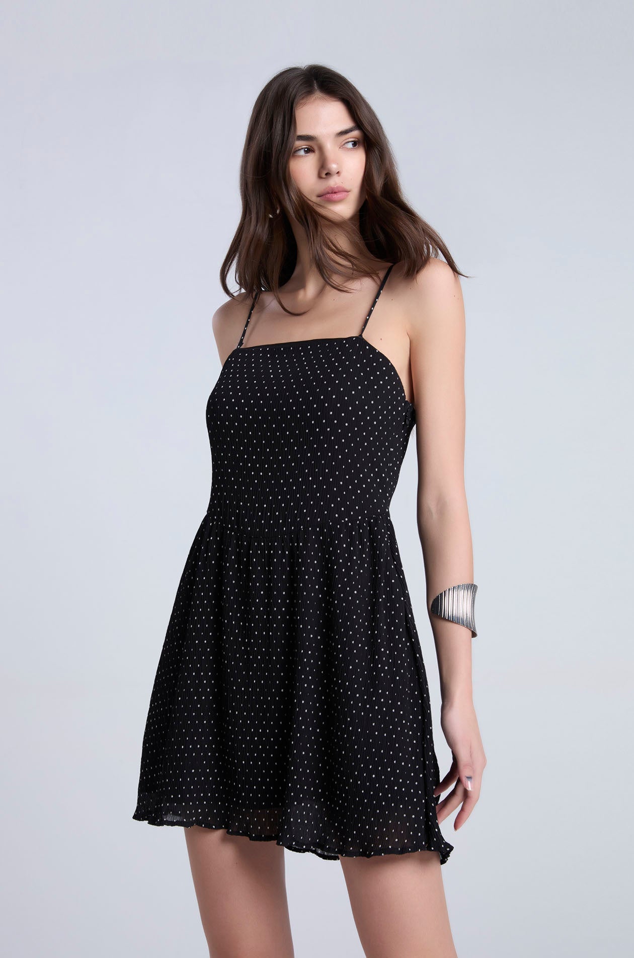 Strappy mini dress in plissé chiffon with contrast dot. Fit and flare silhouette with straight neckline and partial lining. Includes removable camisole straps for versatile styling options. Side zip closure. Available in black and white.