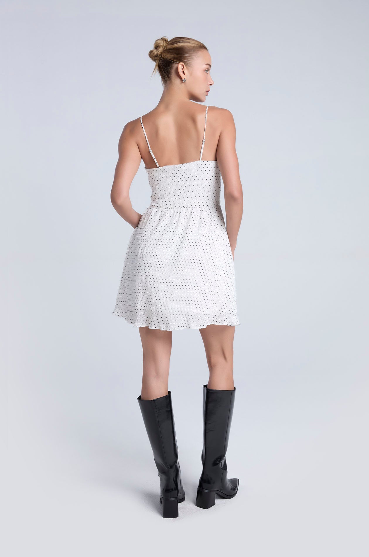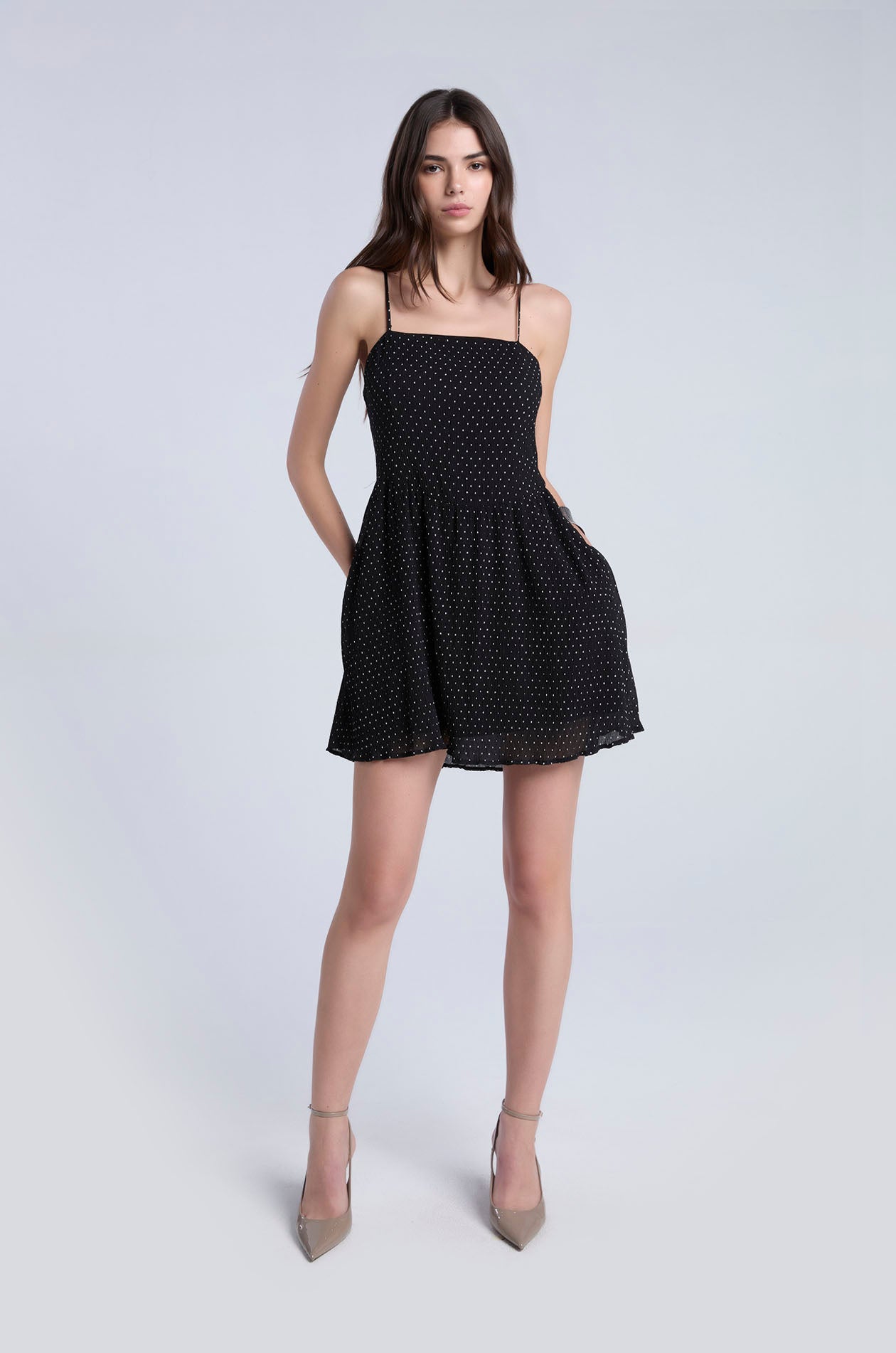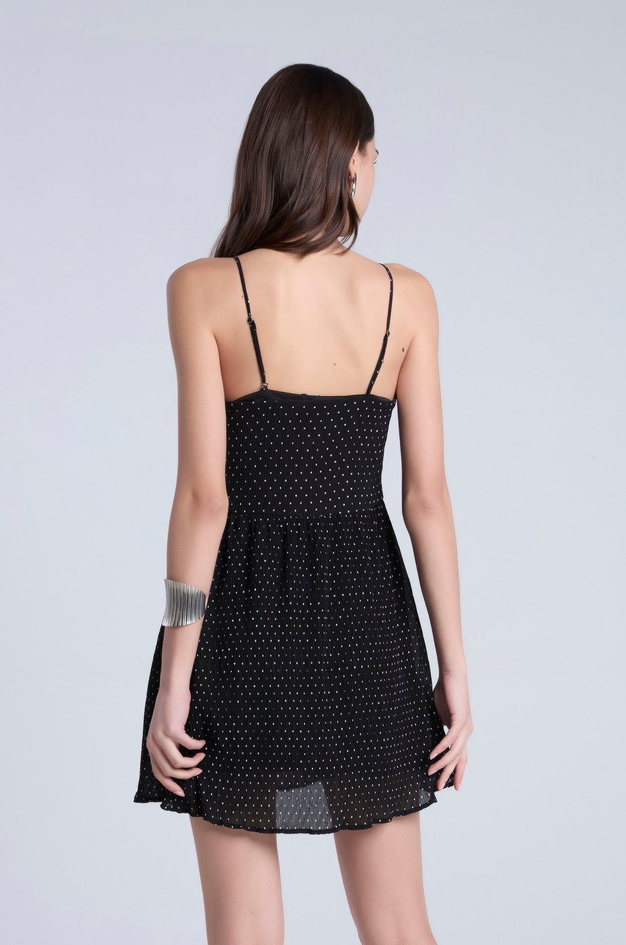 Strappy mini dress in plissé chiffon with contrast dot. Fit and flare silhouette with straight neckline and partial lining. Includes removable camisole straps for versatile styling options. Side zip closure. Available in black and white.