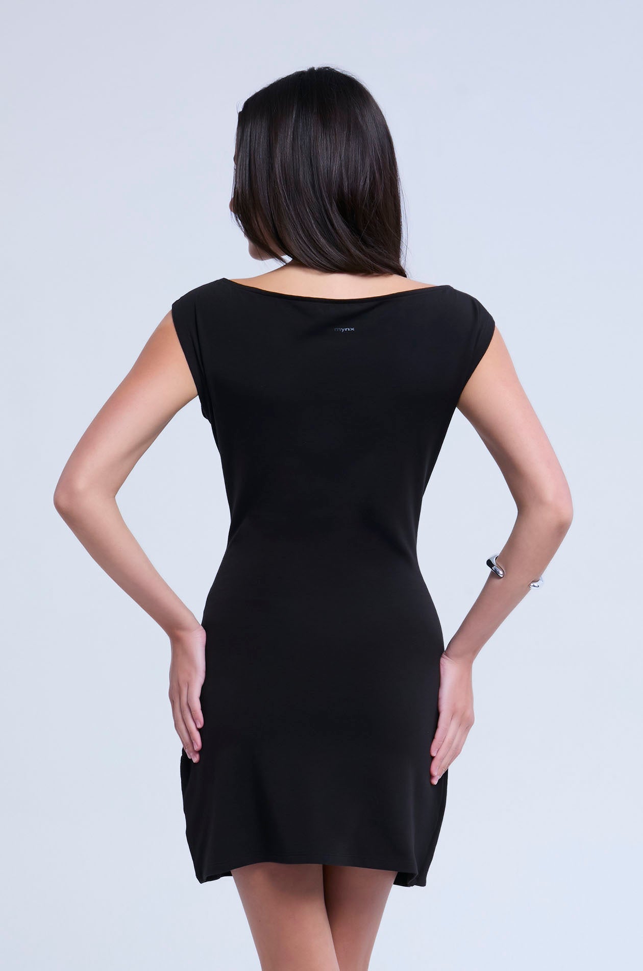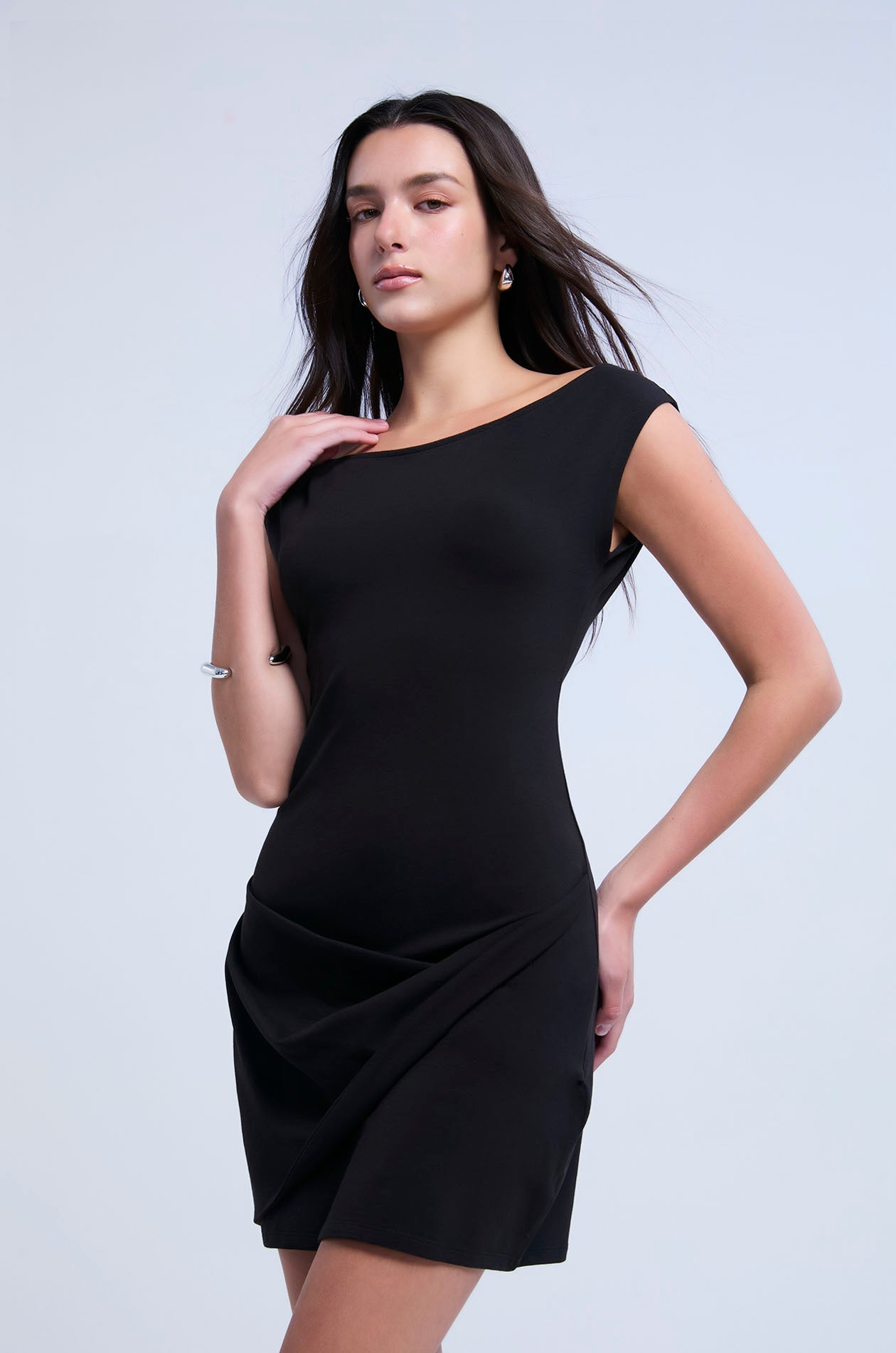 Off-shoulder mini dress crafted from soft-finish jersey. Designed with a fitted silhouette and sculptural draping throughout, featuring a side twist for a modern, effortless look. Available in black and Loden Green.