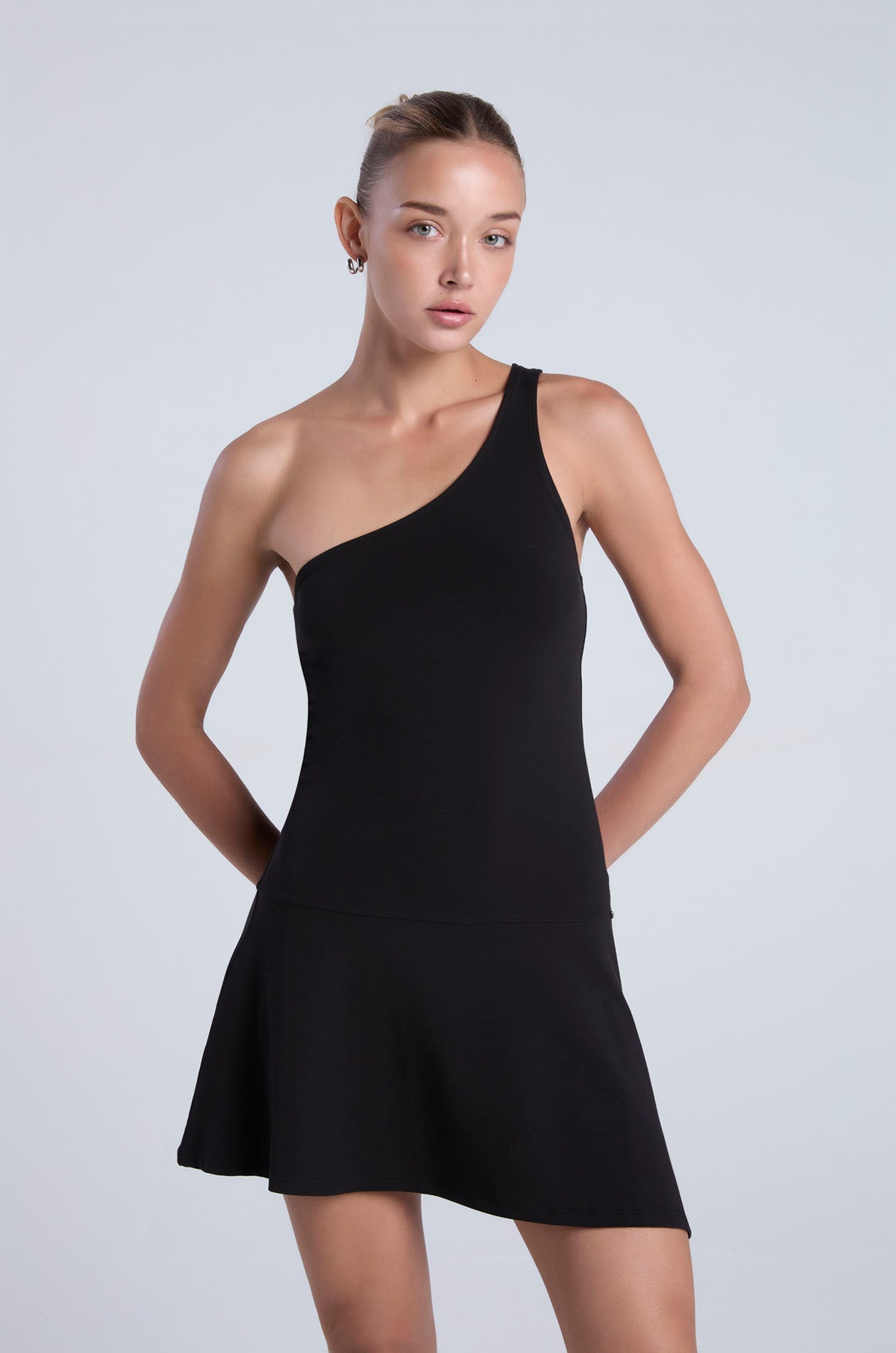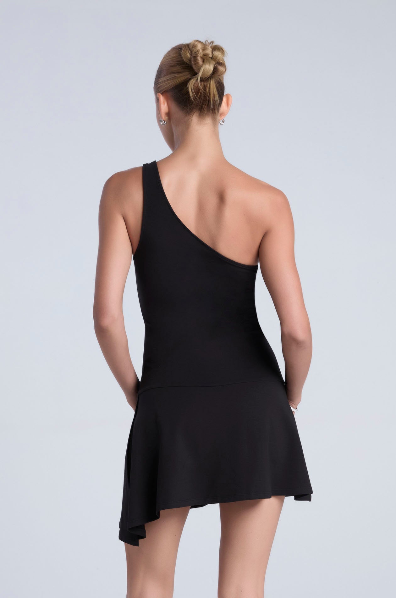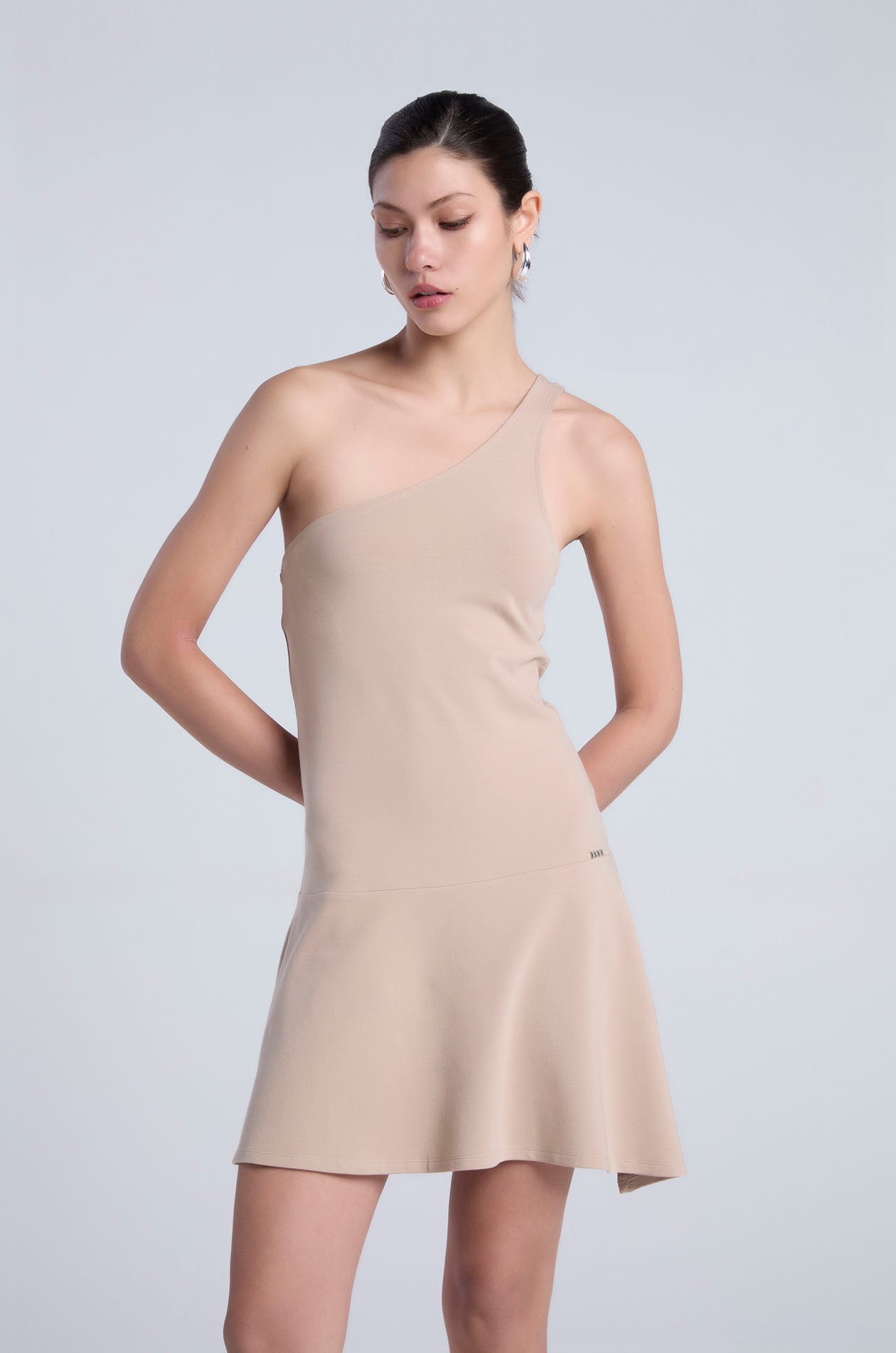One-shoulder mini dress in stretchy jersey. Drop waist silhouette with asymmetric design, flutter hemline, and side slit. Available in black and light taupe.