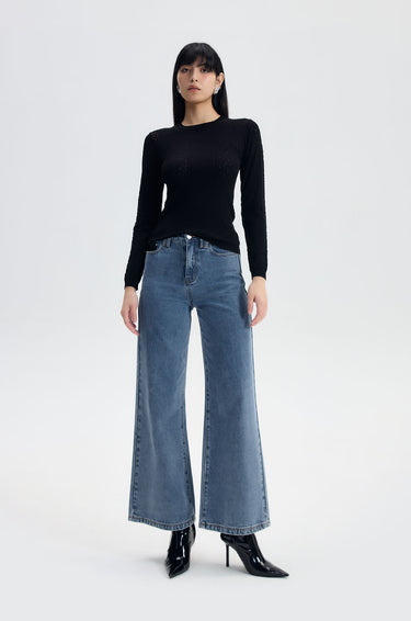 Long-sleeved top in knit fabric with an abstract burnout pattern for sheer sections. Slim fit with ribbed round neck, cuffs, and hem. Available in black, white, and peach blush.
