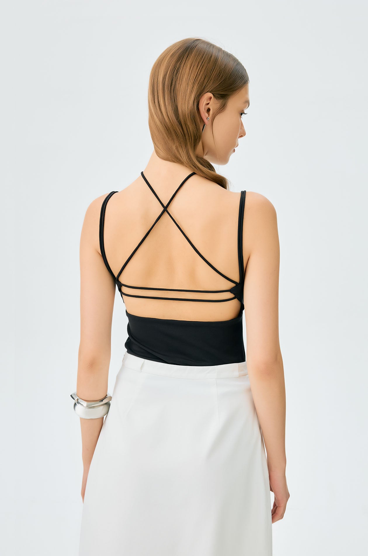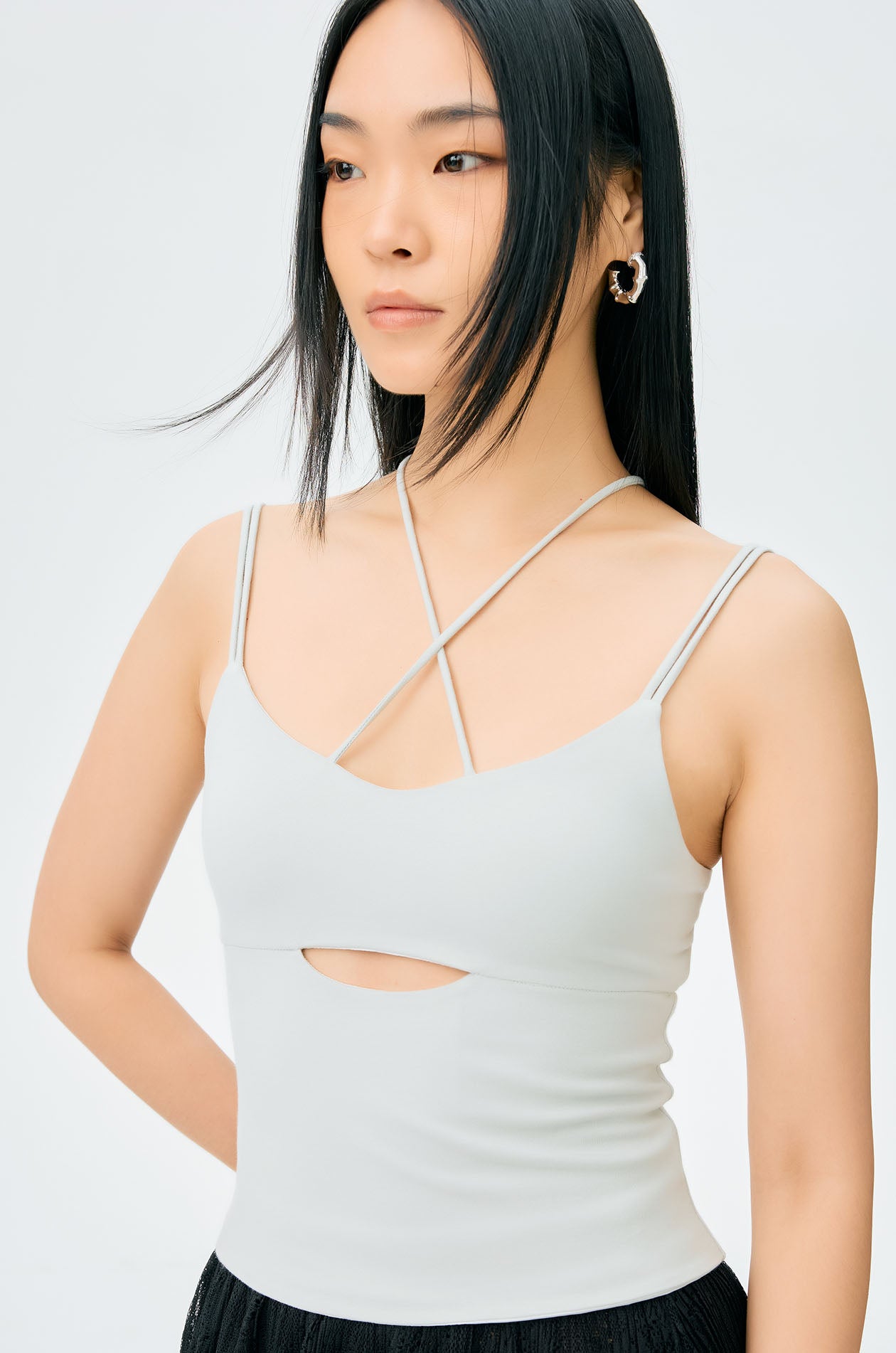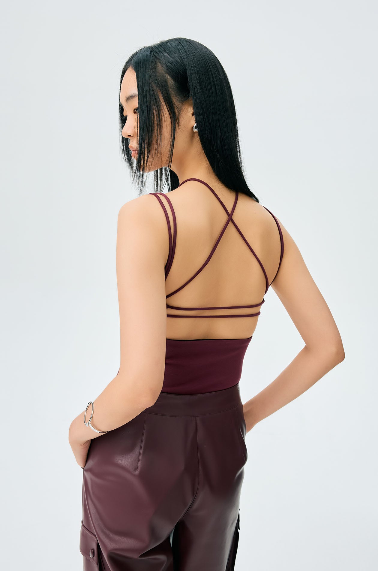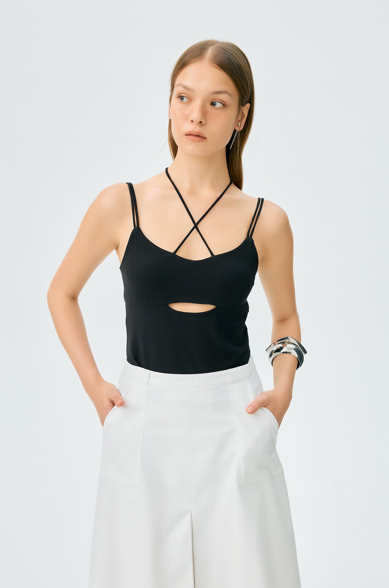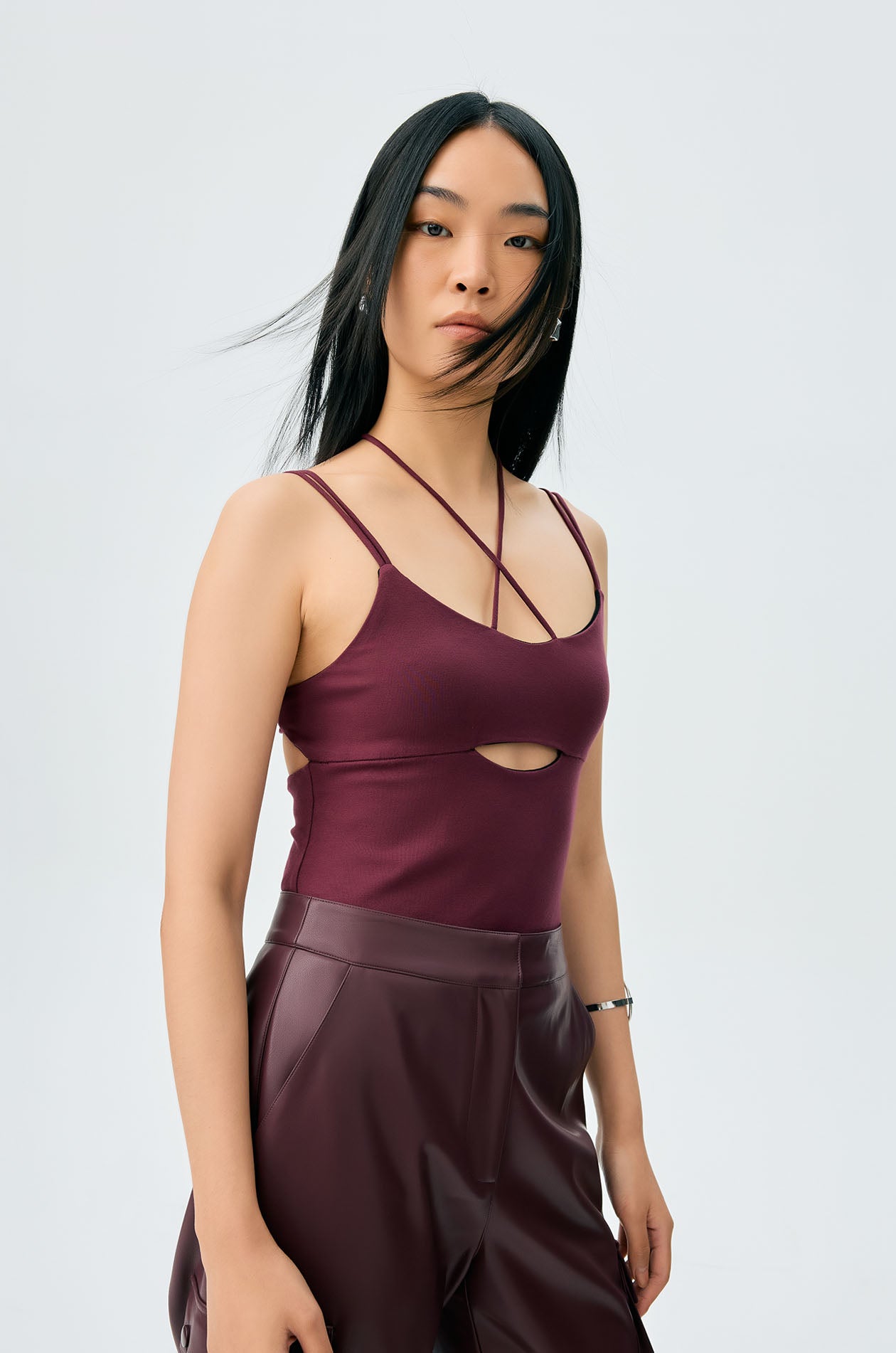 Strappy tank top in double jersey. Fitted silhouette with twin shoulder straps and crisscross halter straps. Front cut-out detail. Available in black, metal grey, and cherry lacquer.