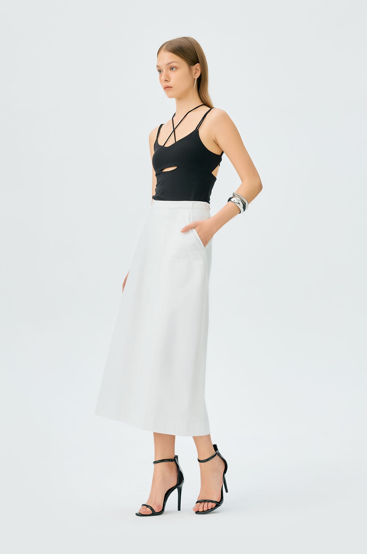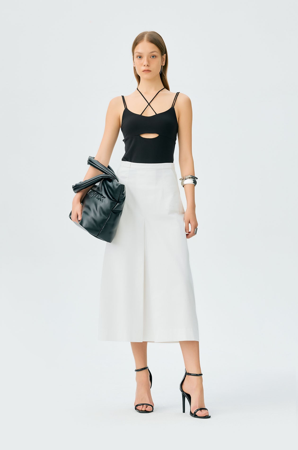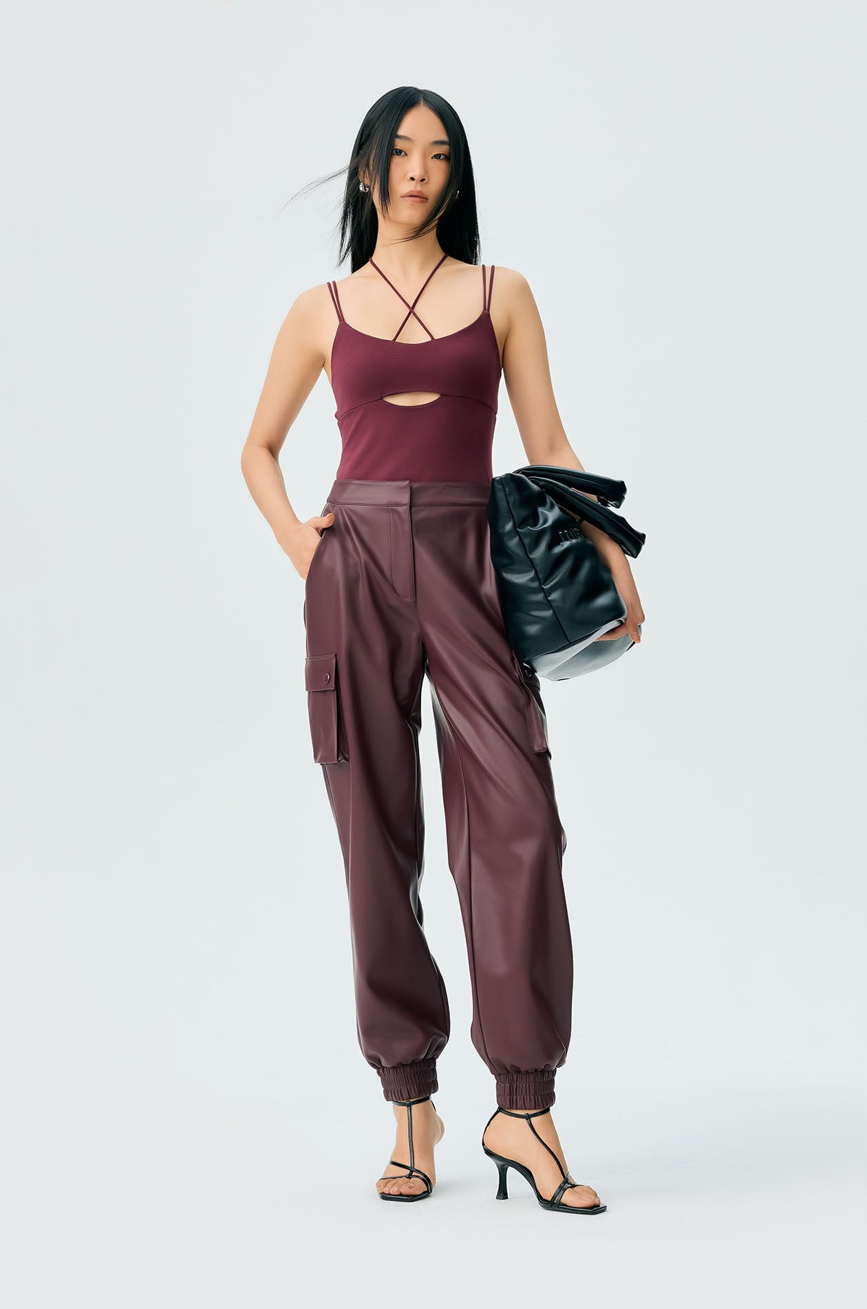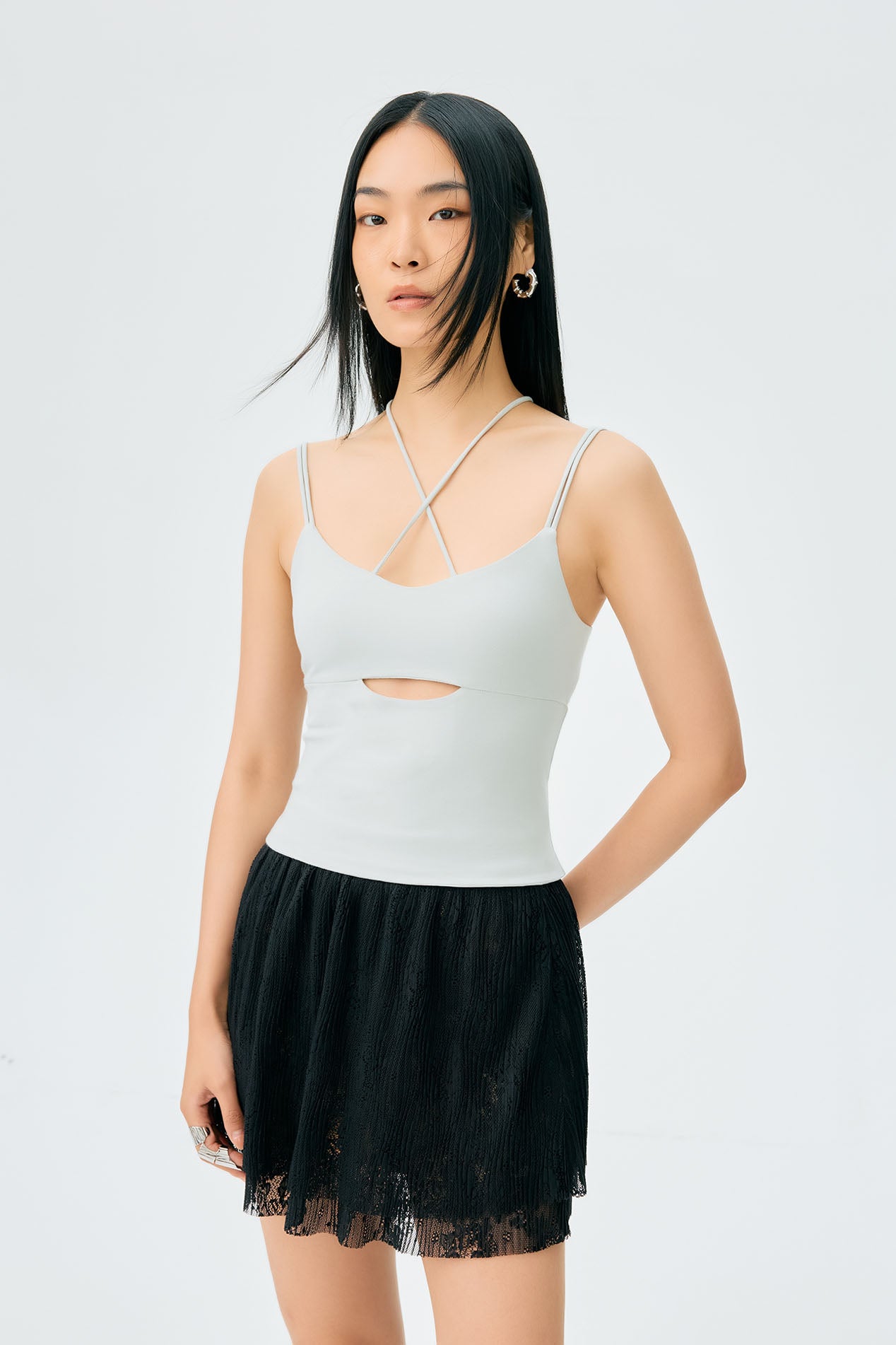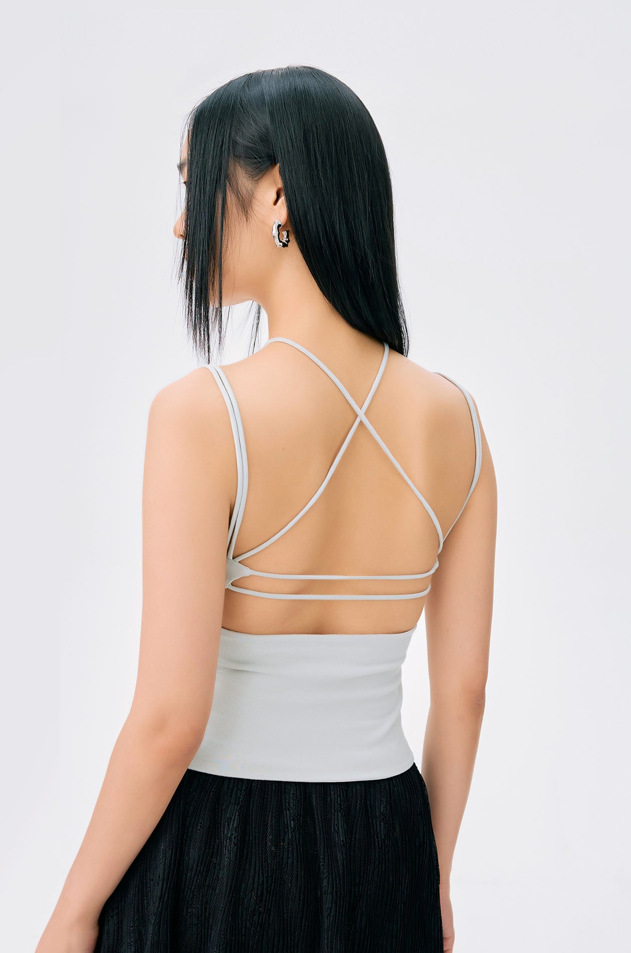 Strappy tank top in double jersey. Fitted silhouette with twin shoulder straps and crisscross halter straps. Front cut-out detail. Available in black, metal grey, and cherry lacquer.