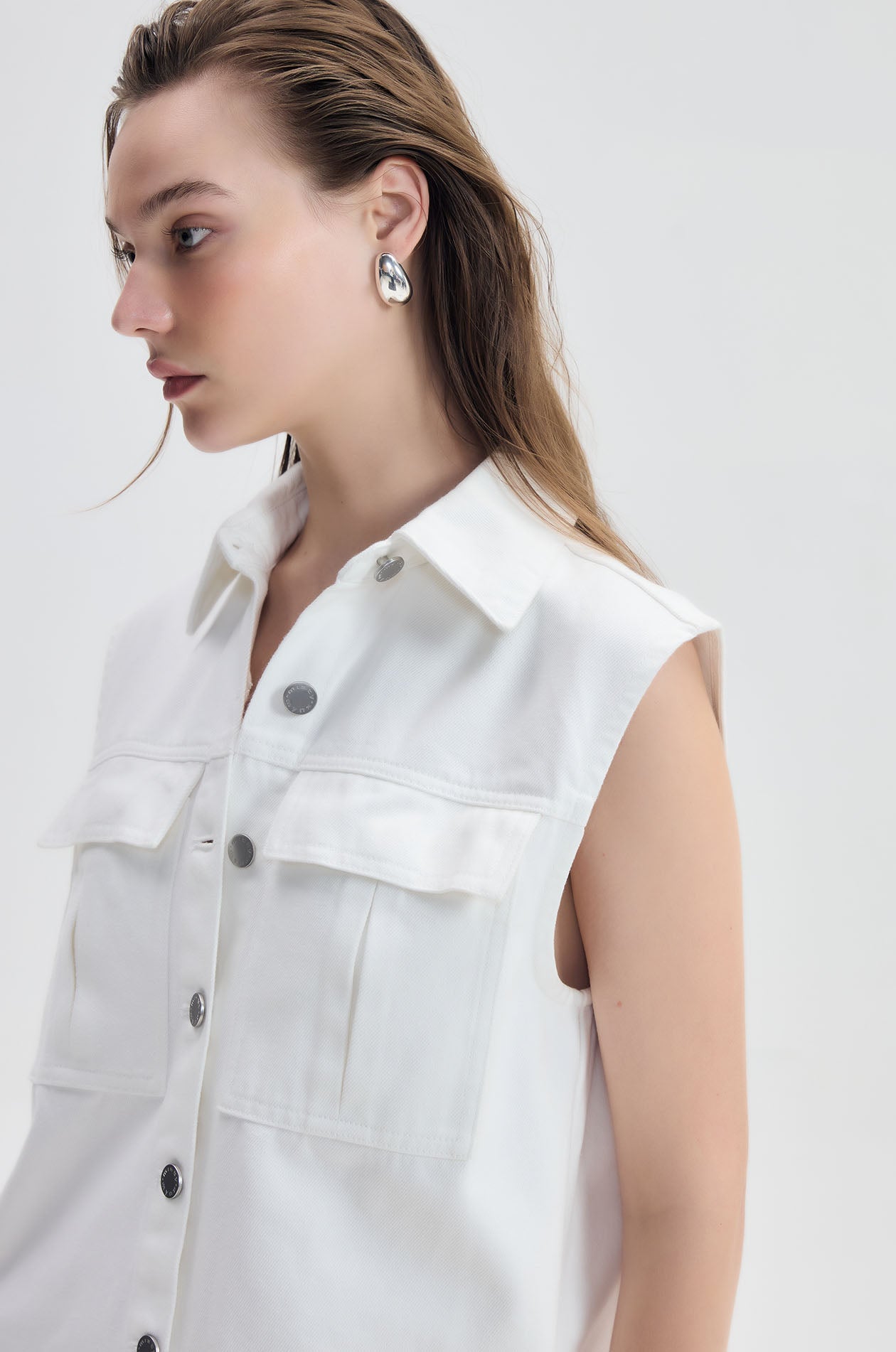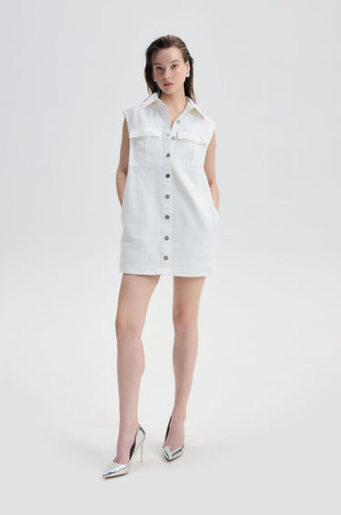 Sleeveless mini dress in cotton denim. Shift silhouette with classic collar, chest pockets, and side pockets. Front button closure. Available in white.