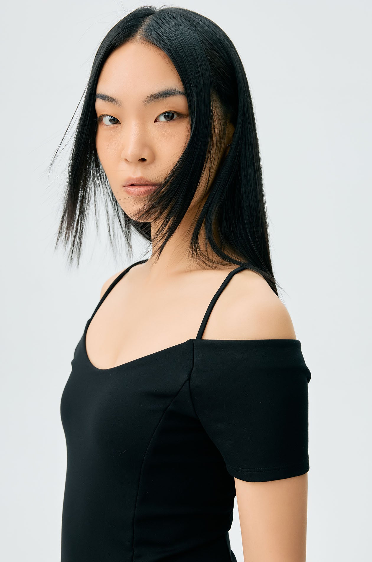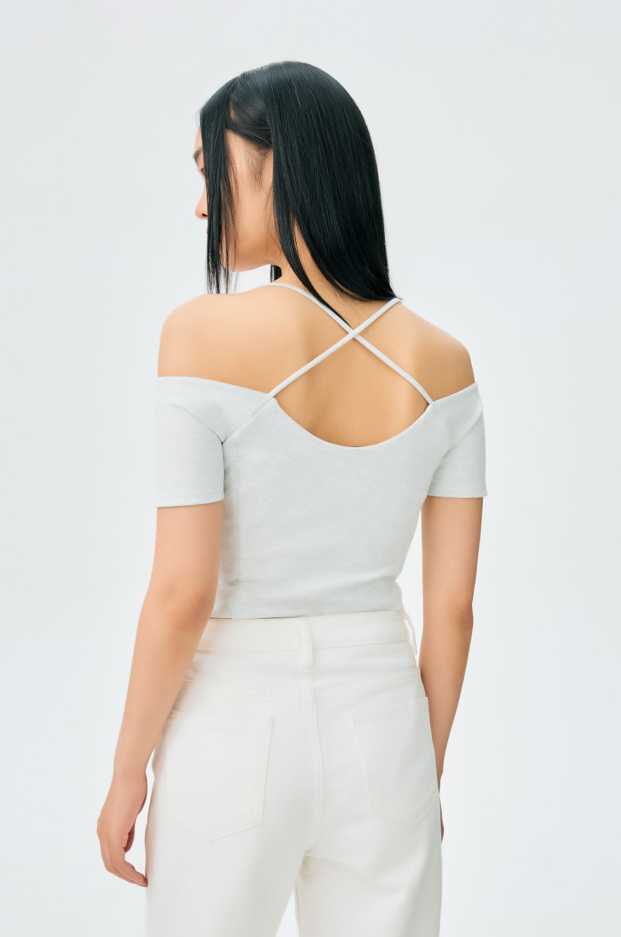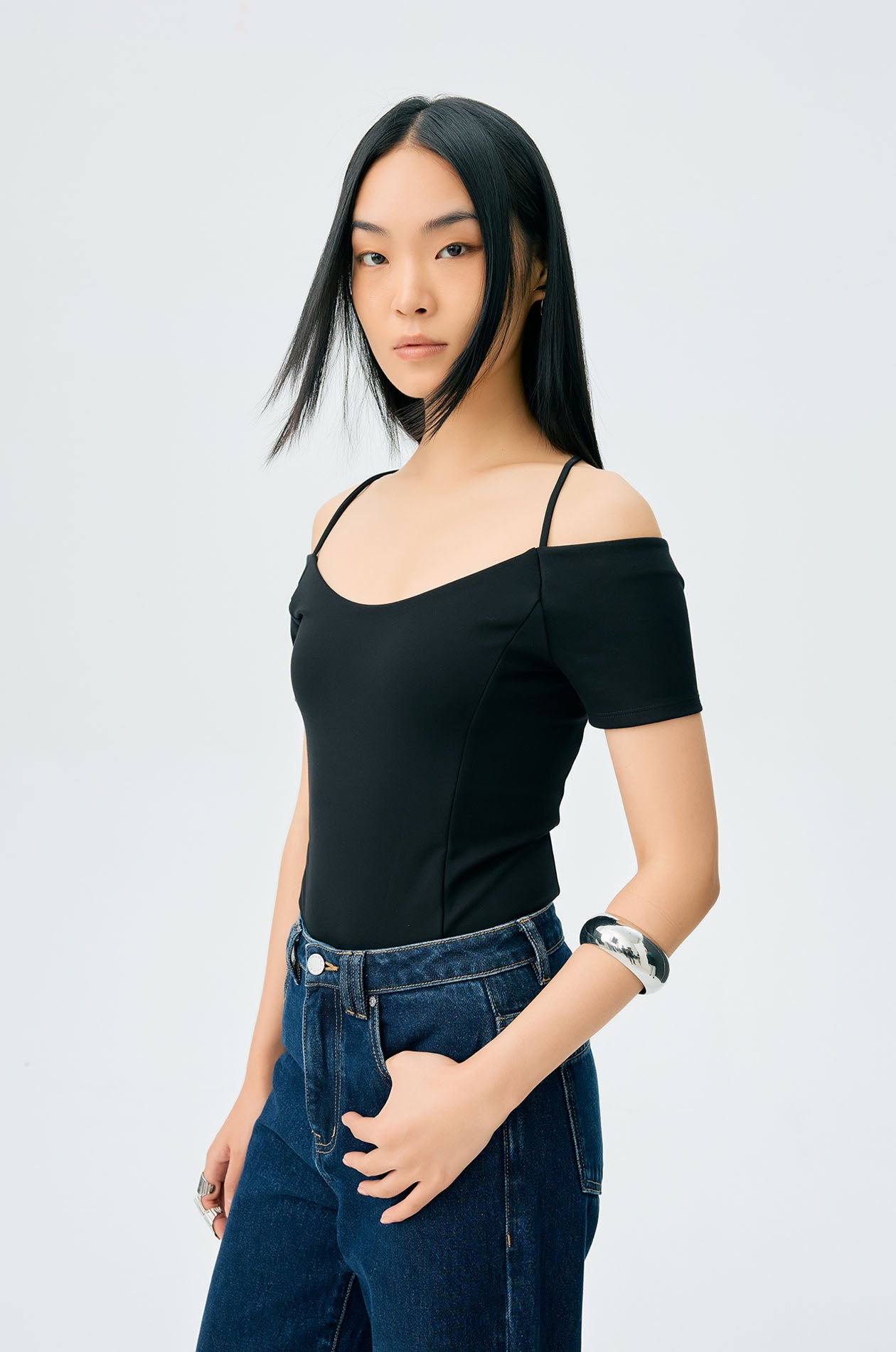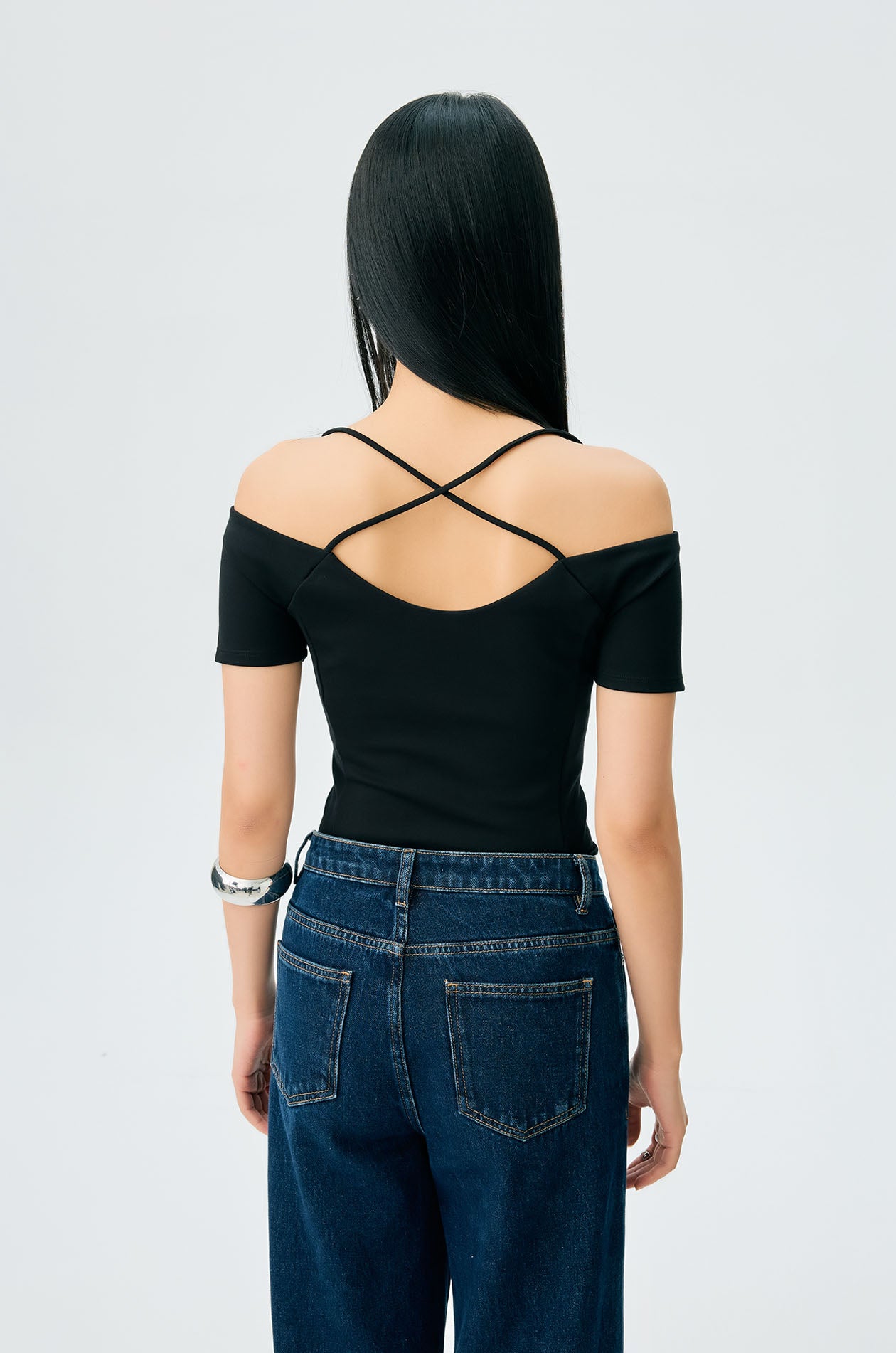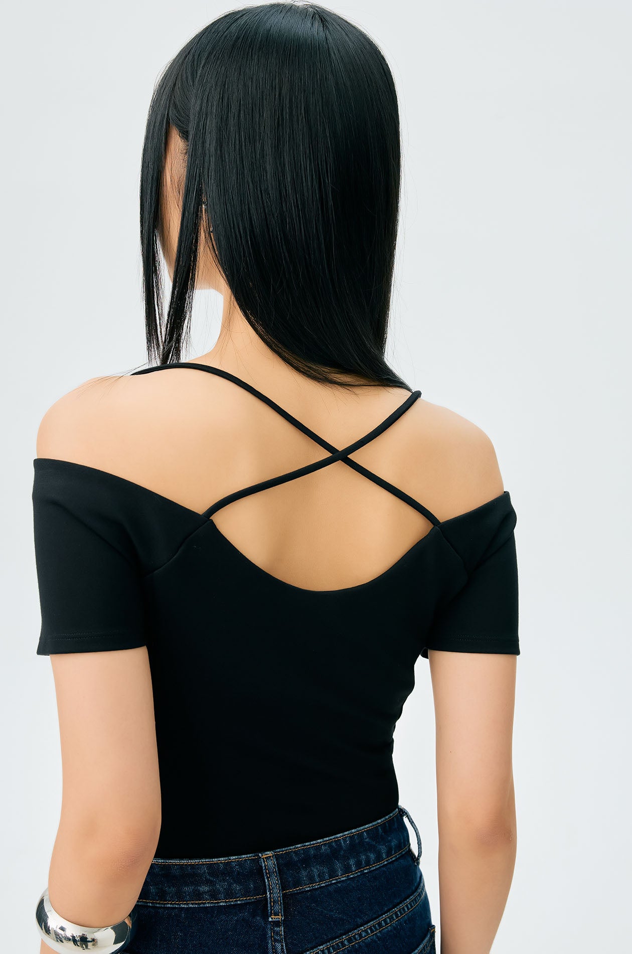 Off-shoulder bodysuit in stretchy jersey fabric. Slim fit with back-crisscross straps. Available in black and white.
