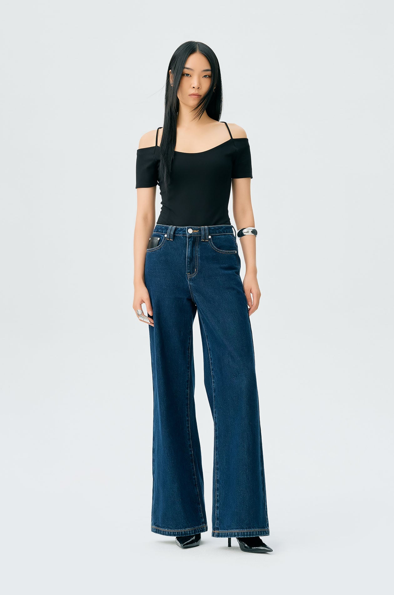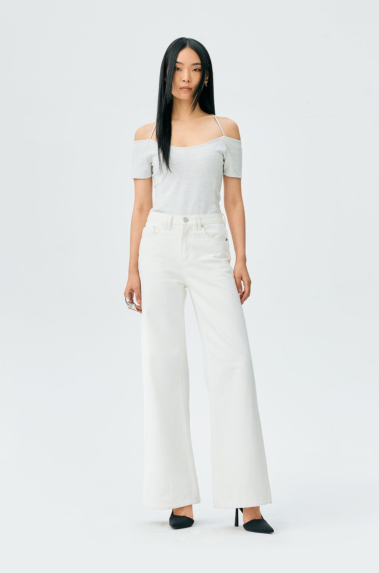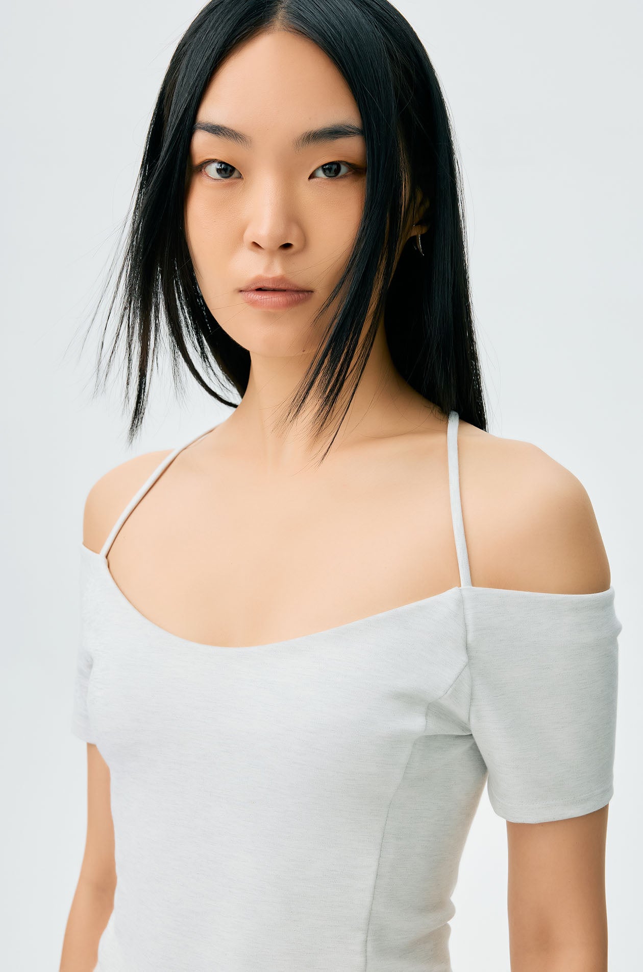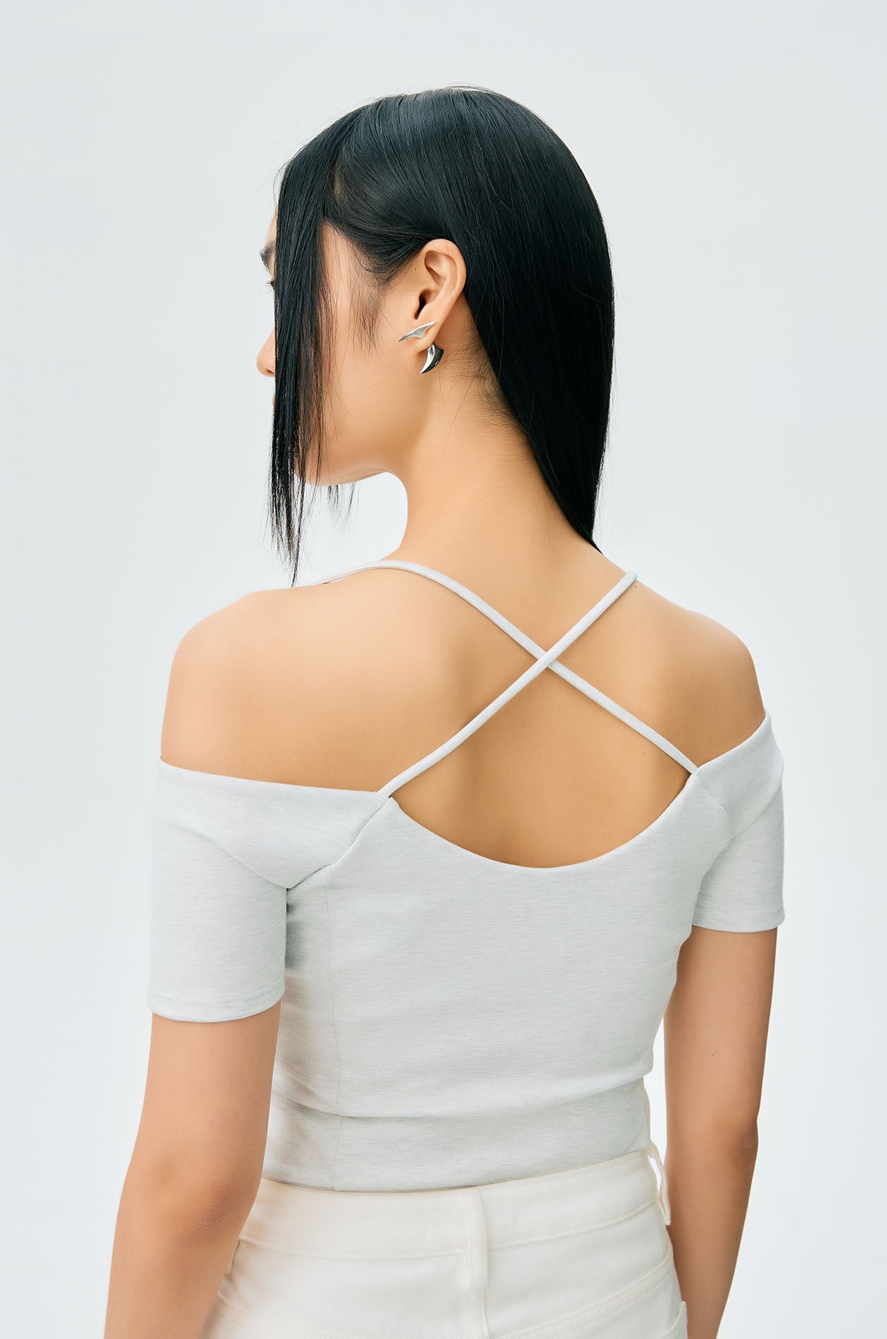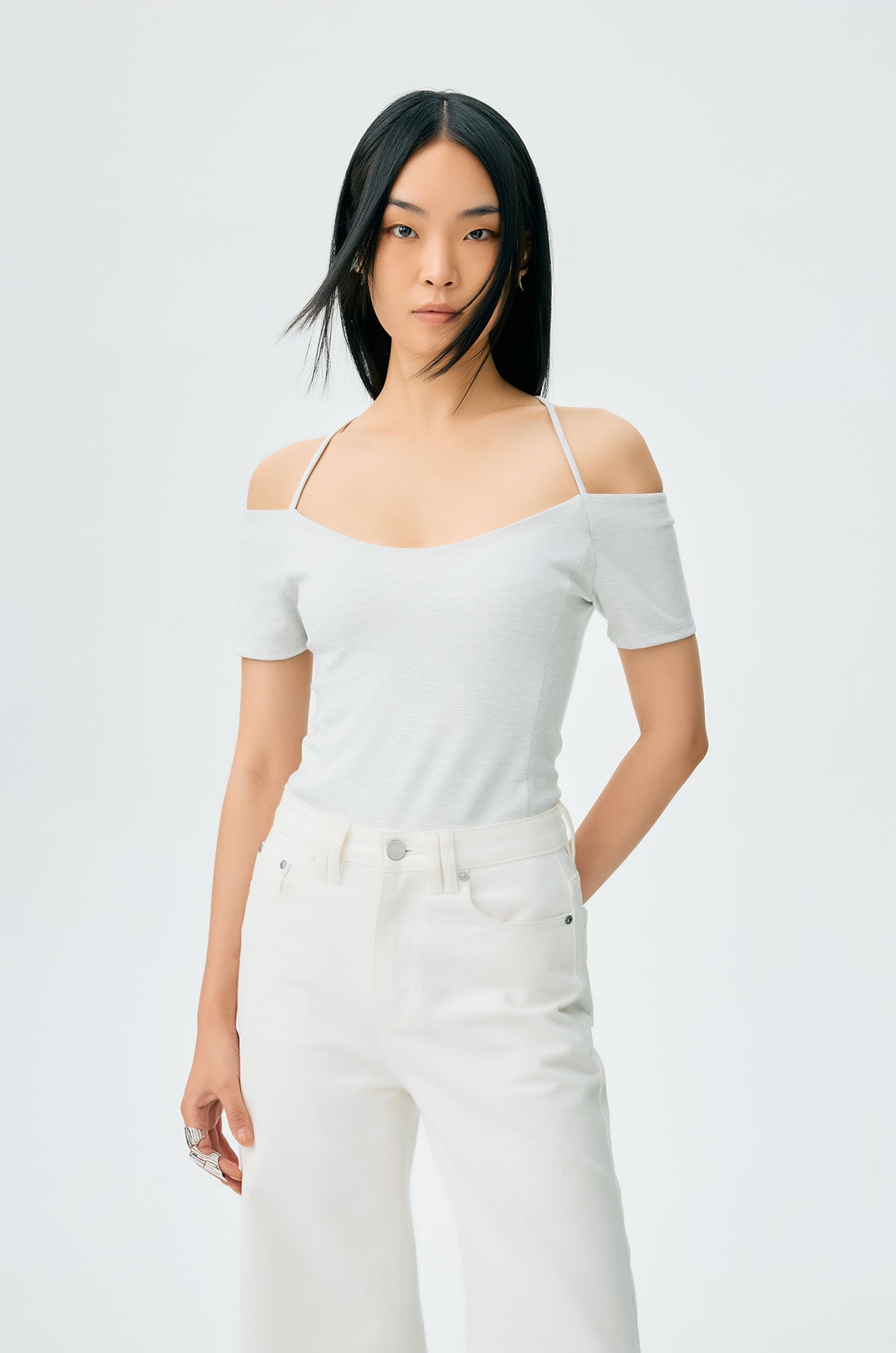 Off-shoulder bodysuit in stretchy jersey fabric. Slim fit with back-crisscross straps. Available in black and white.