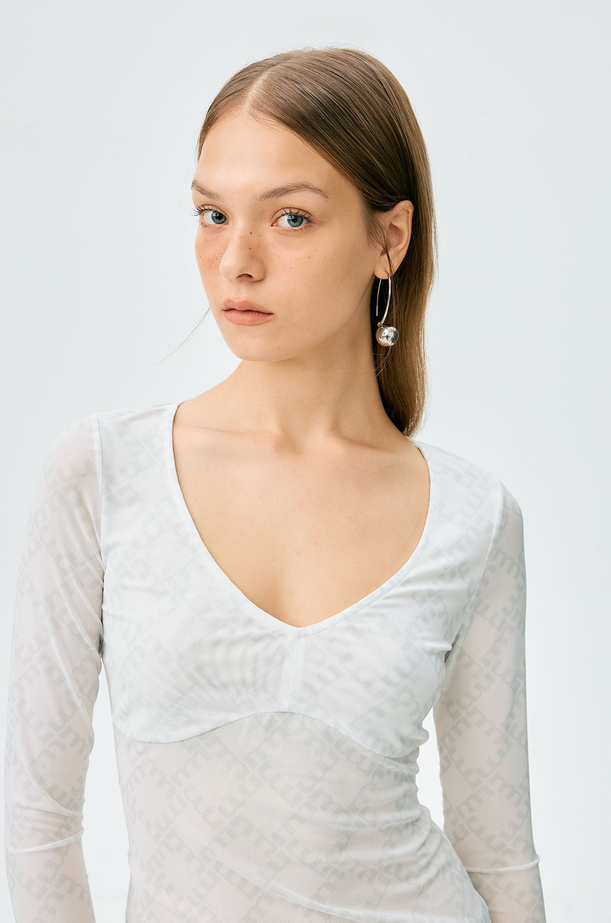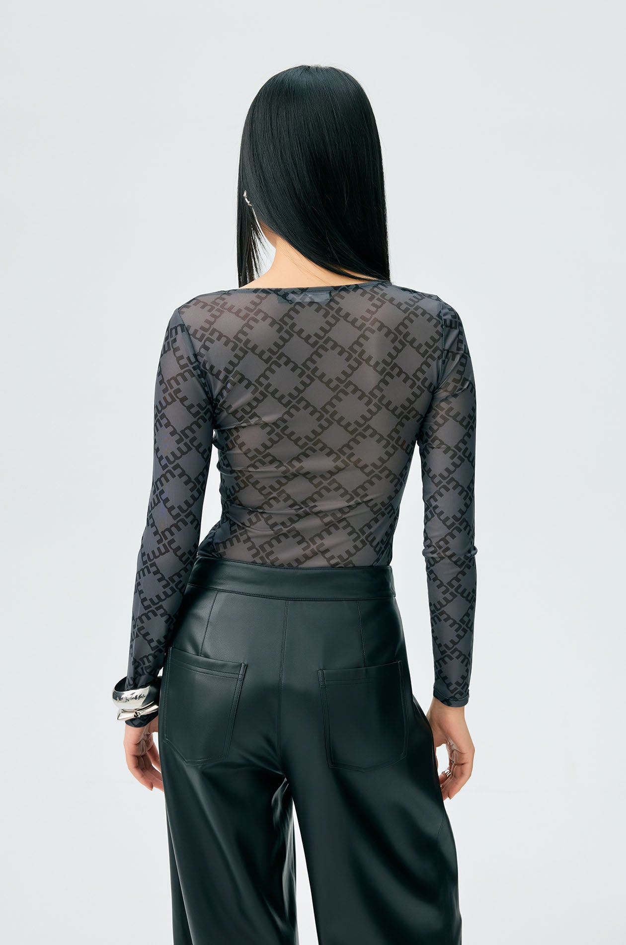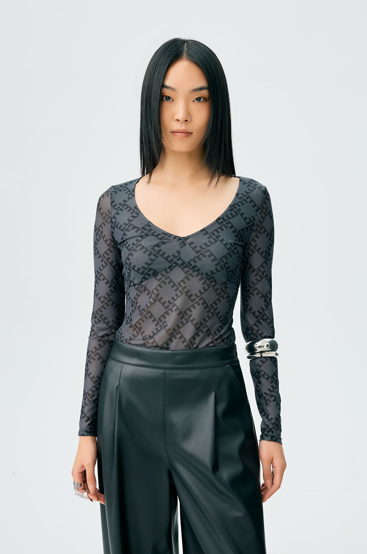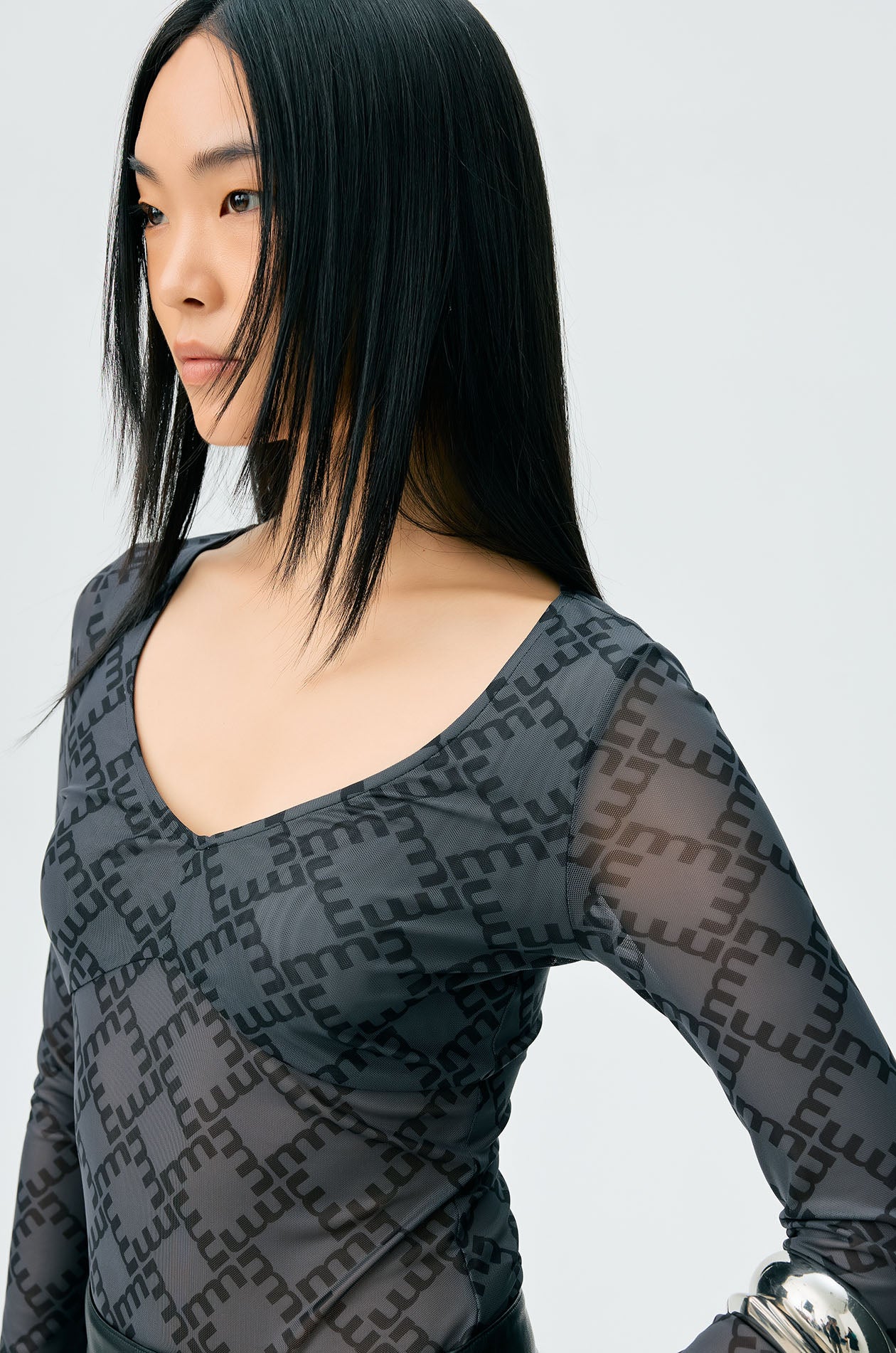 Long-sleeved second skin top in mesh with partial lining. Plunging neckline with allover monogram print. Available in black, white, and slit green.