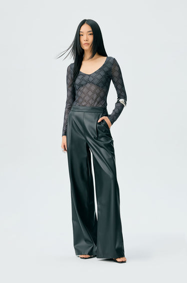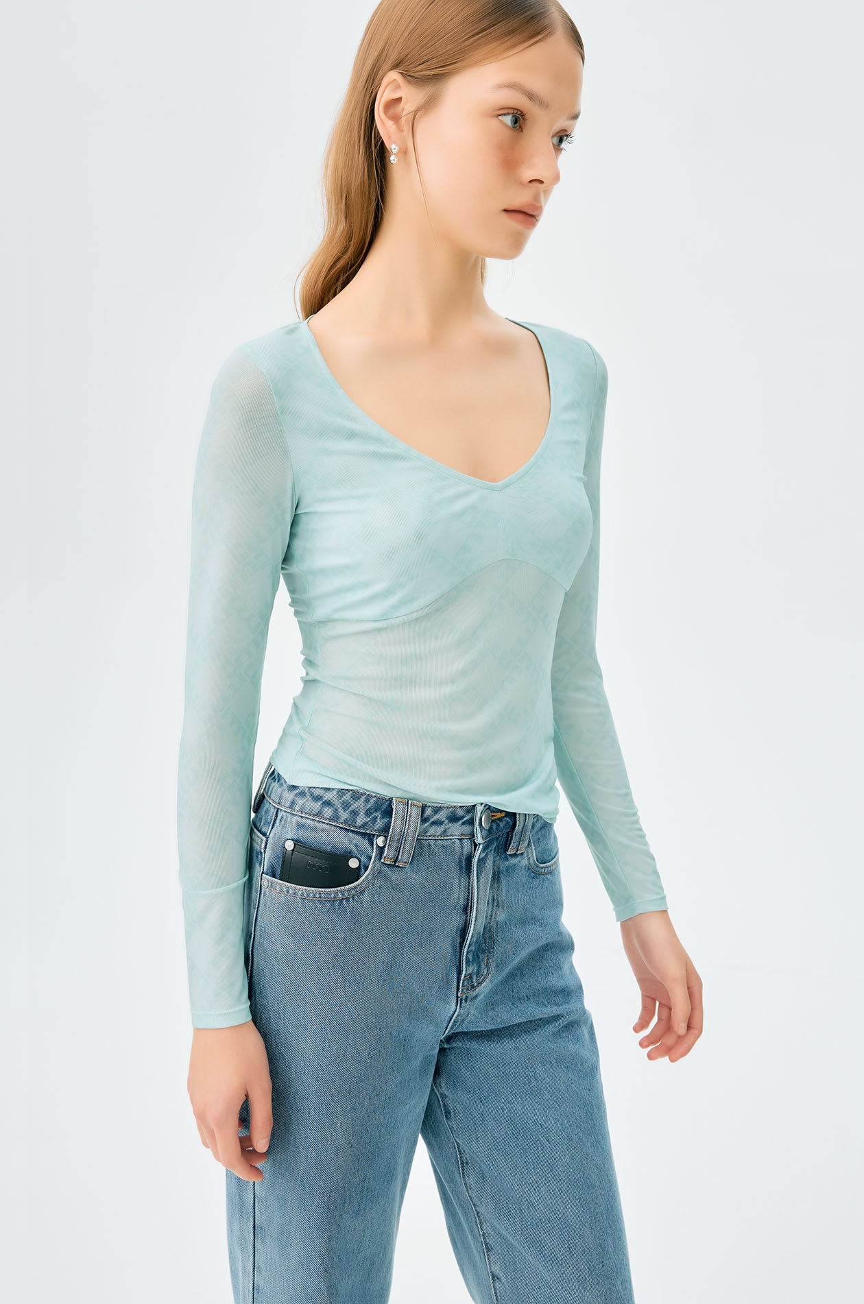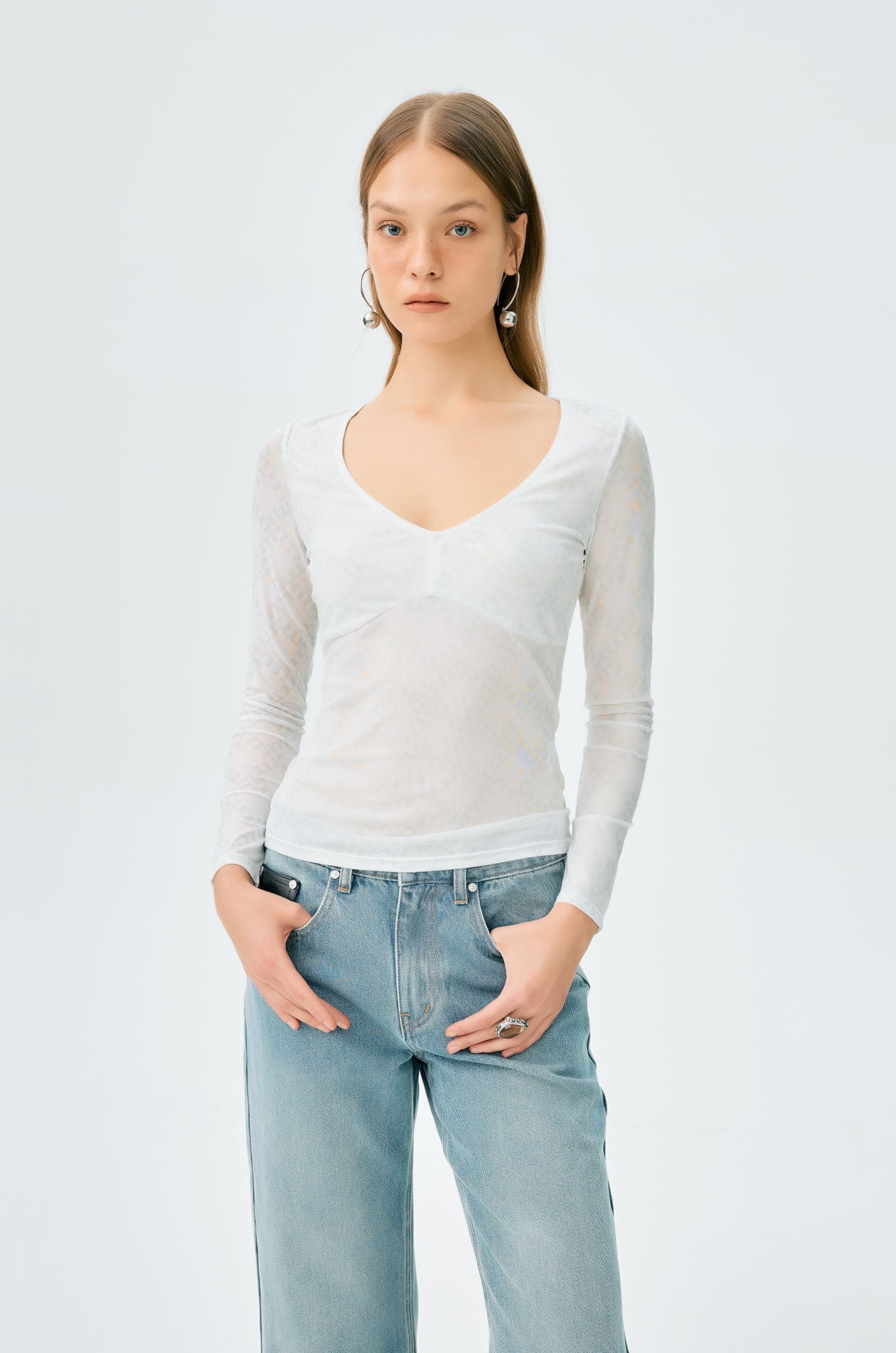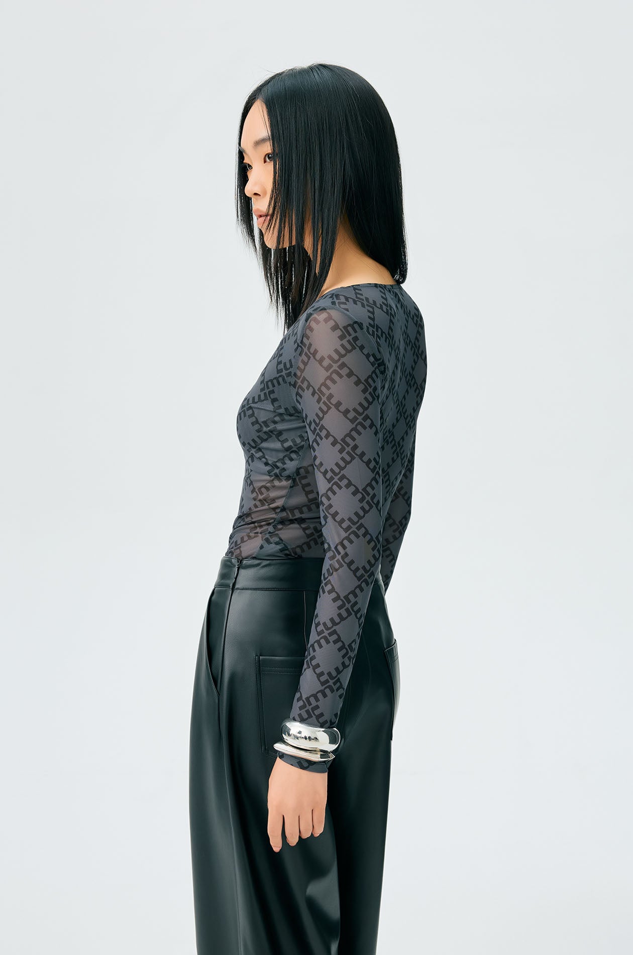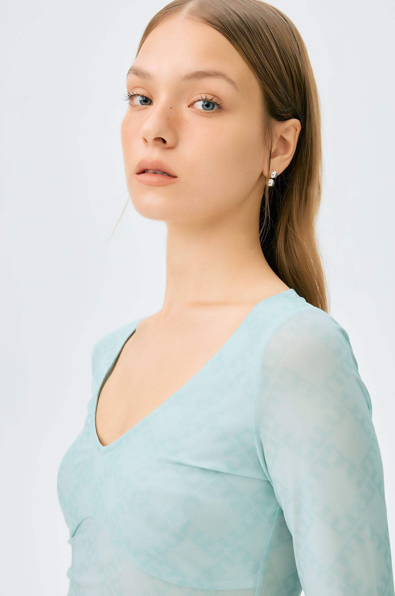 Long-sleeved second skin top in mesh with partial lining. Plunging neckline with allover monogram print. Available in black, white, and slit green.