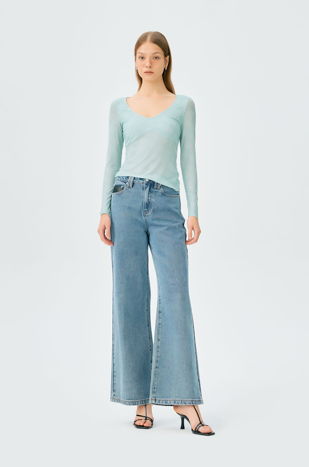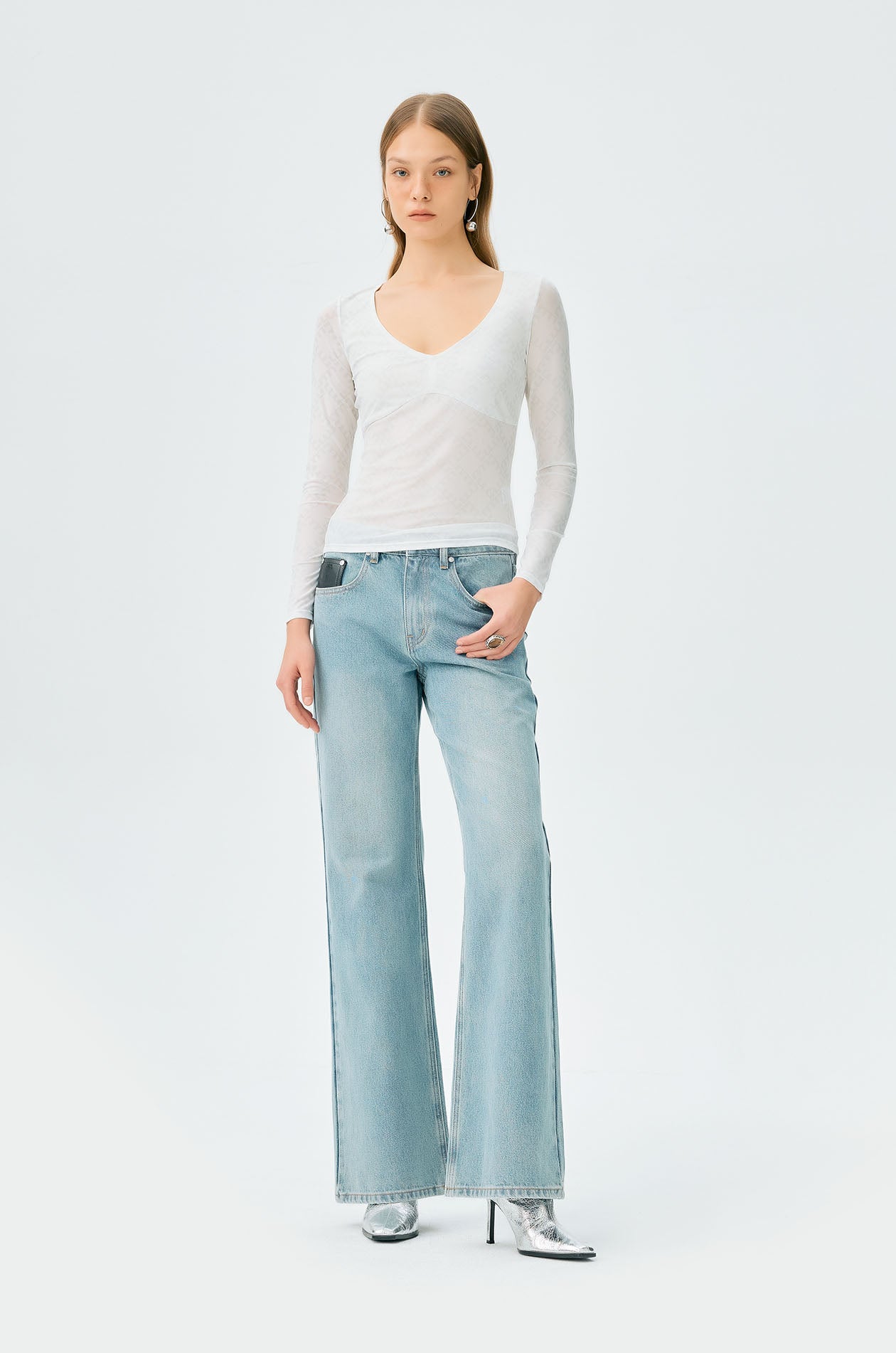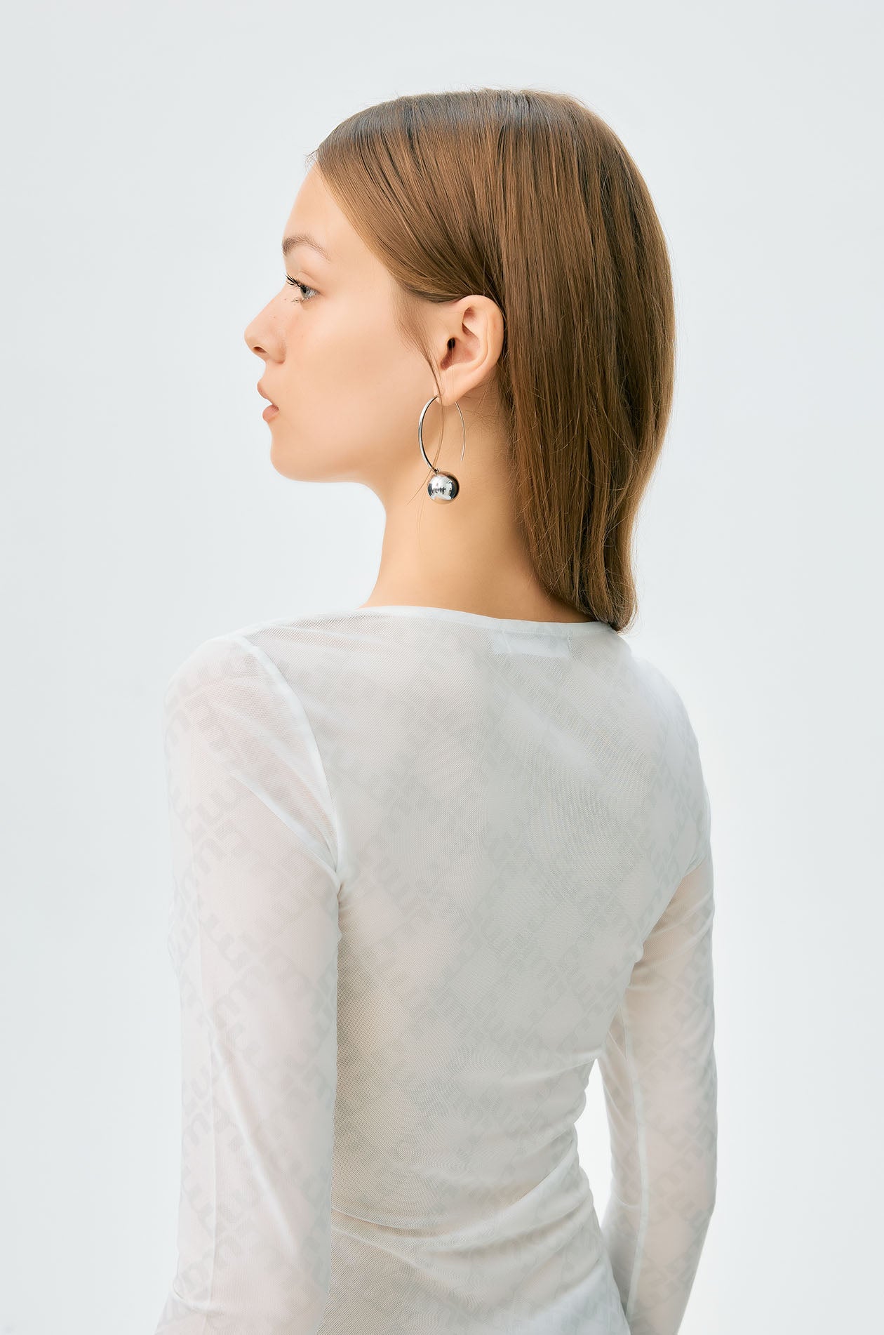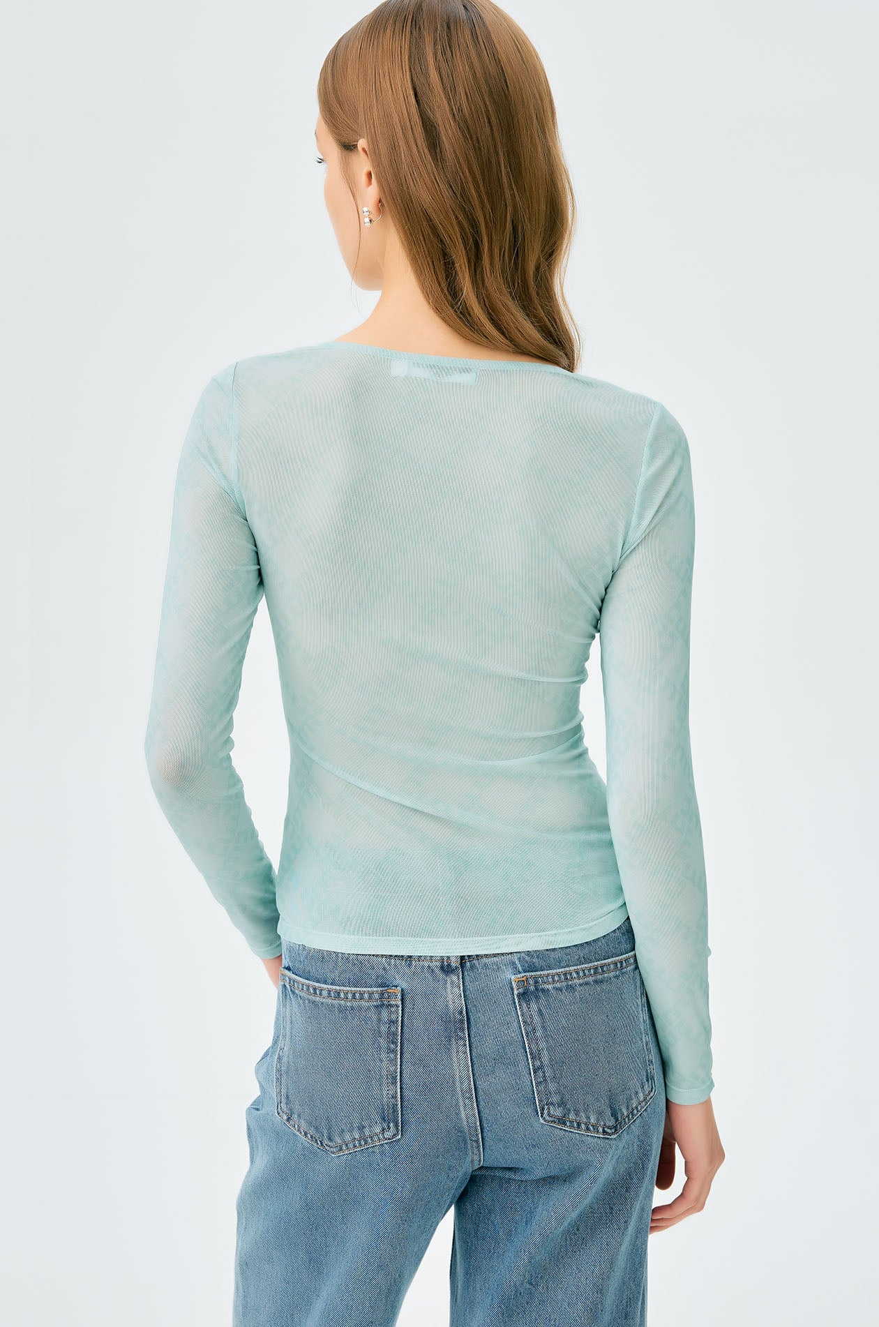 Long-sleeved second skin top in mesh with partial lining. Plunging neckline with allover monogram print. Available in black, white, and slit green.
