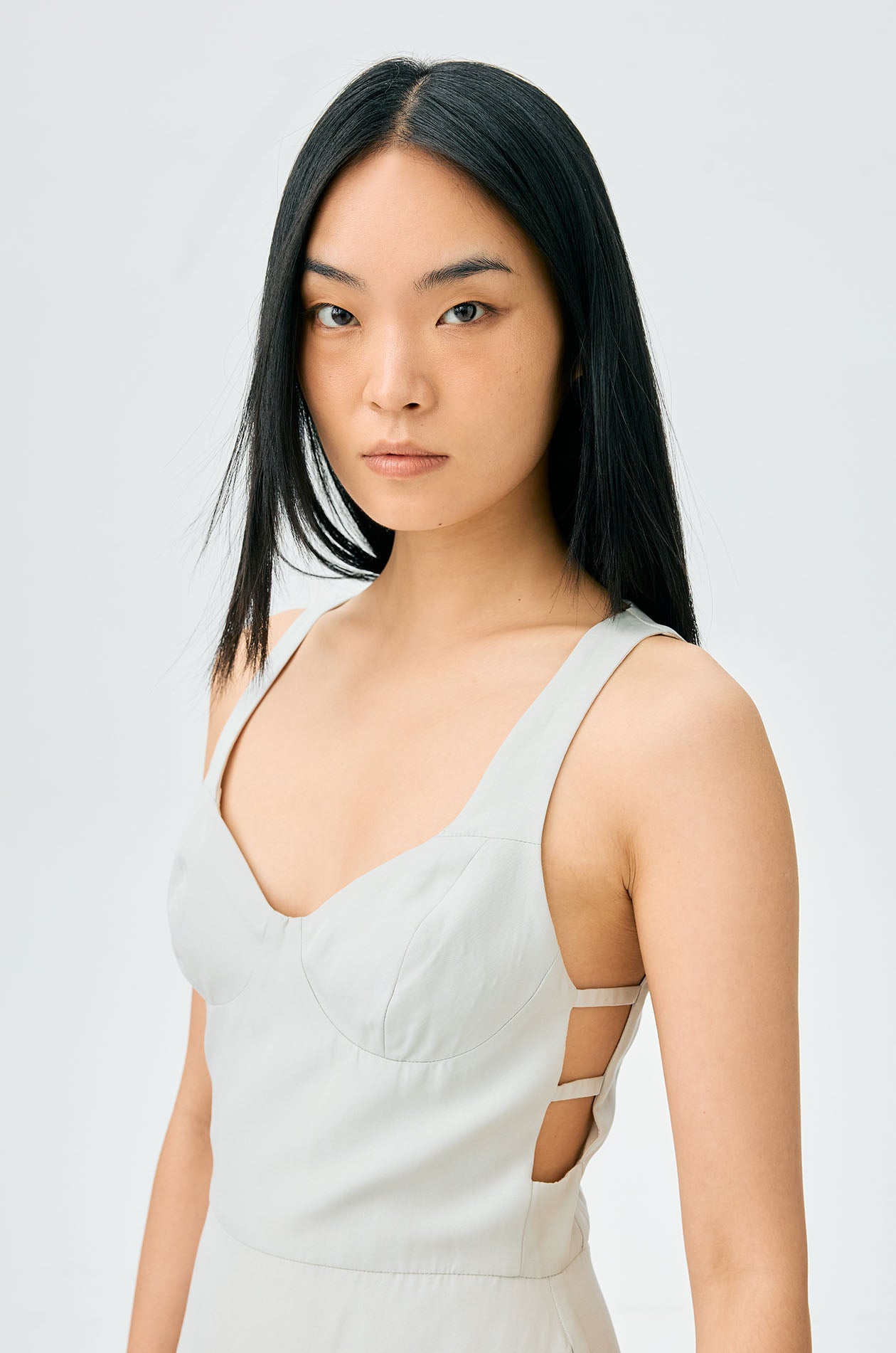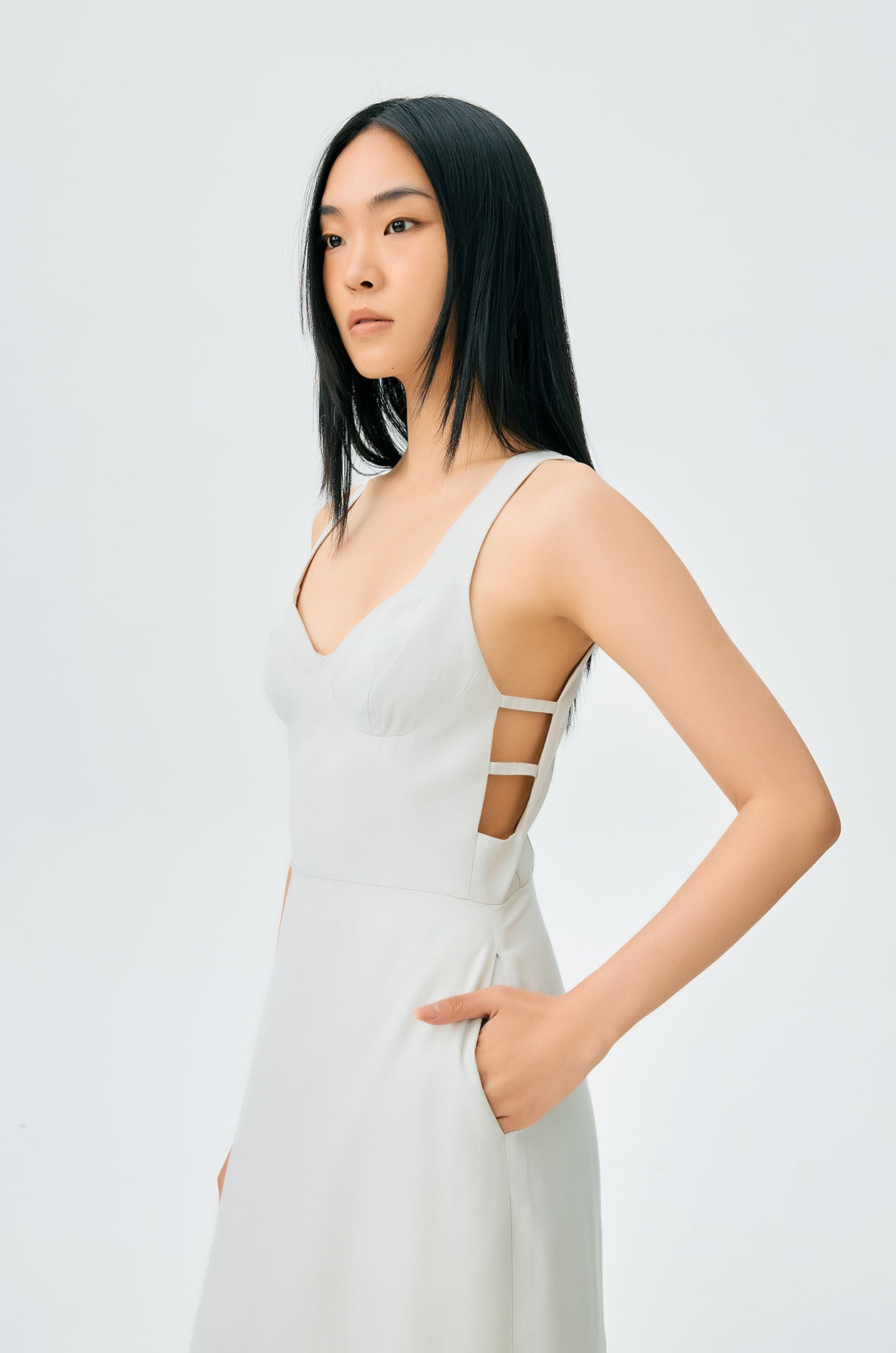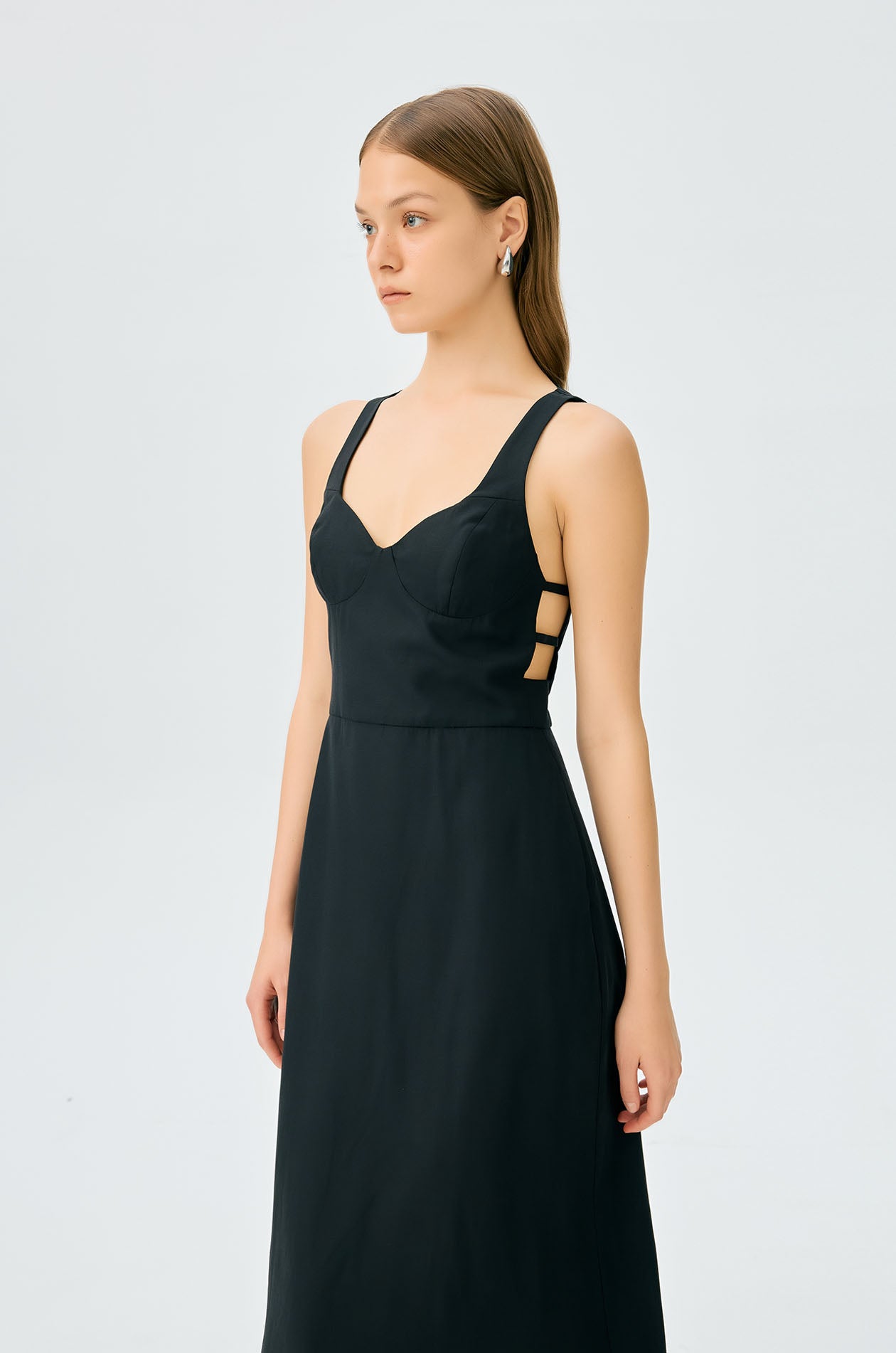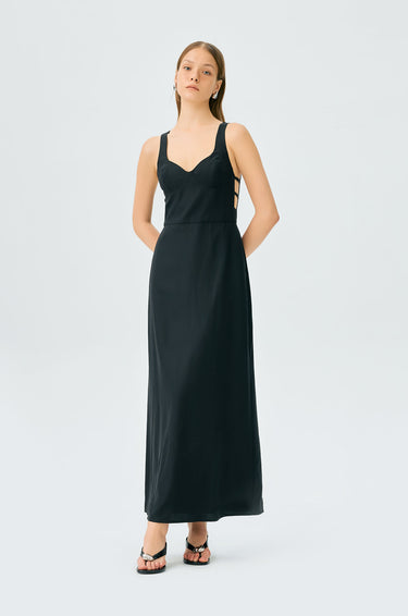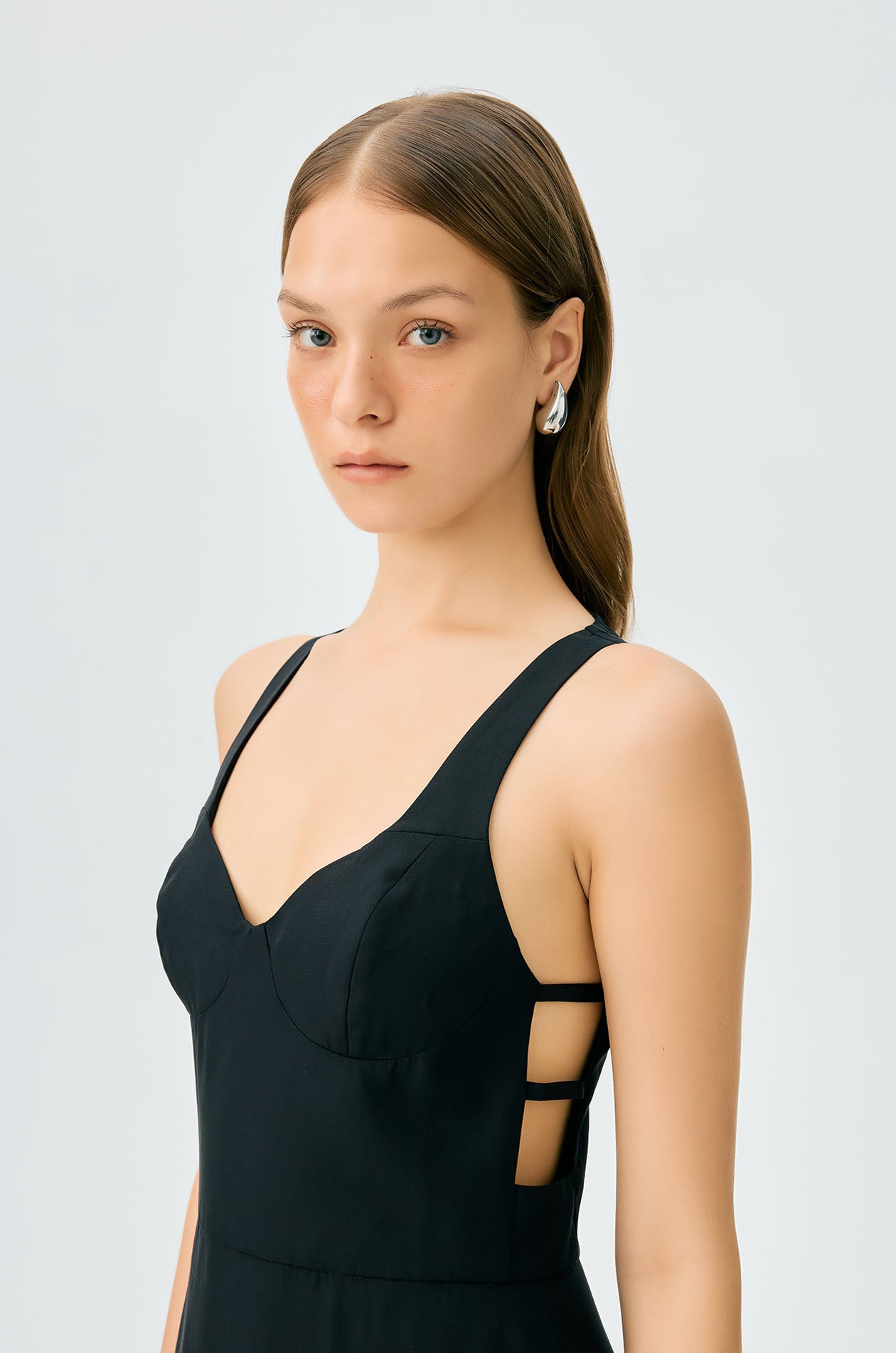 Strappy midi dress in textured cotton fabric. Column silhouette with sweetheart neckline and side cut-out detailing. Back slit and side pockets. Back zip closure. Available in black and metal grey.