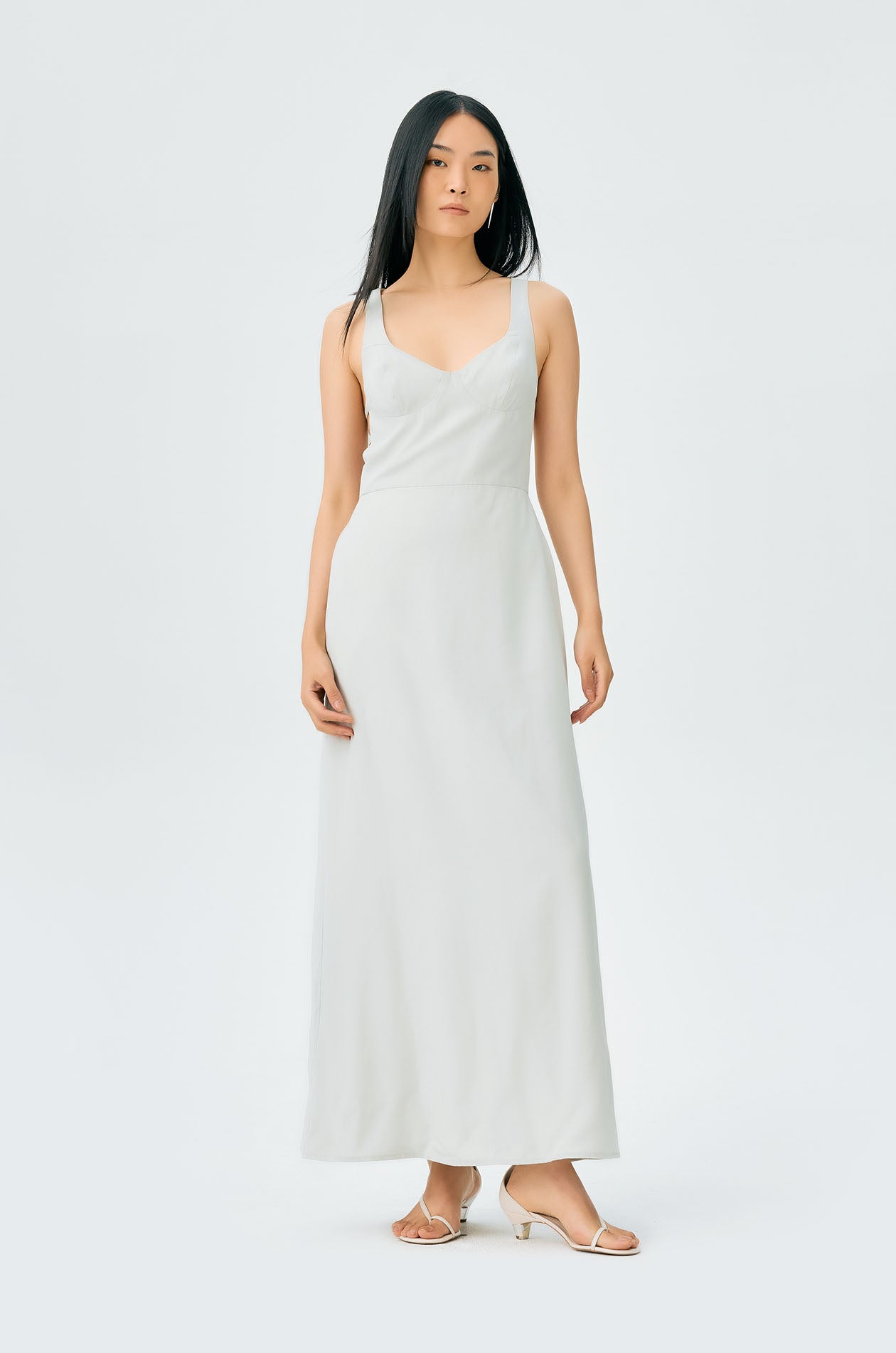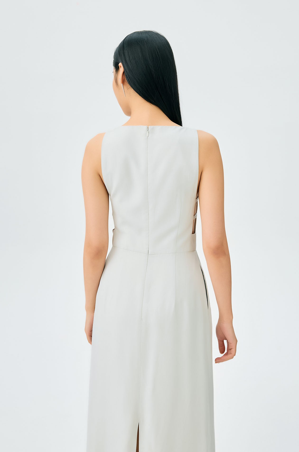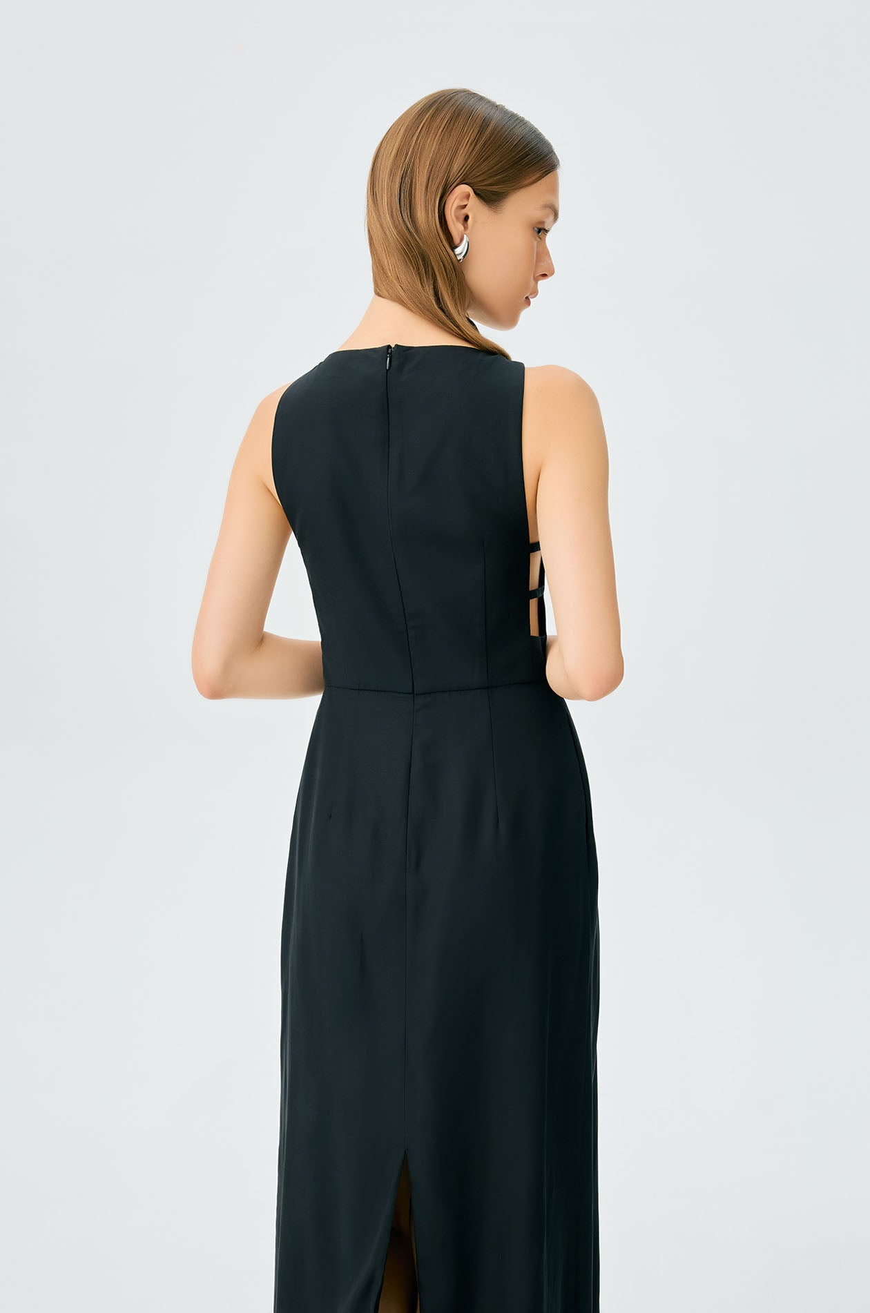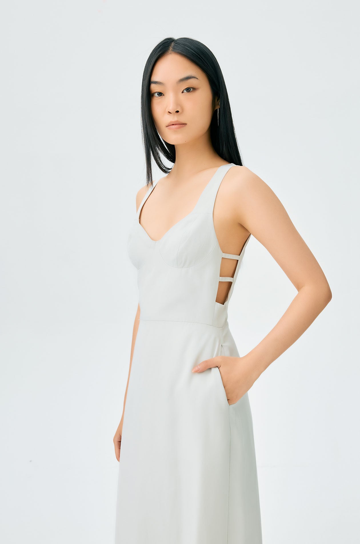 Strappy midi dress in textured cotton fabric. Column silhouette with sweetheart neckline and side cut-out detailing. Back slit and side pockets. Back zip closure. Available in black and metal grey.