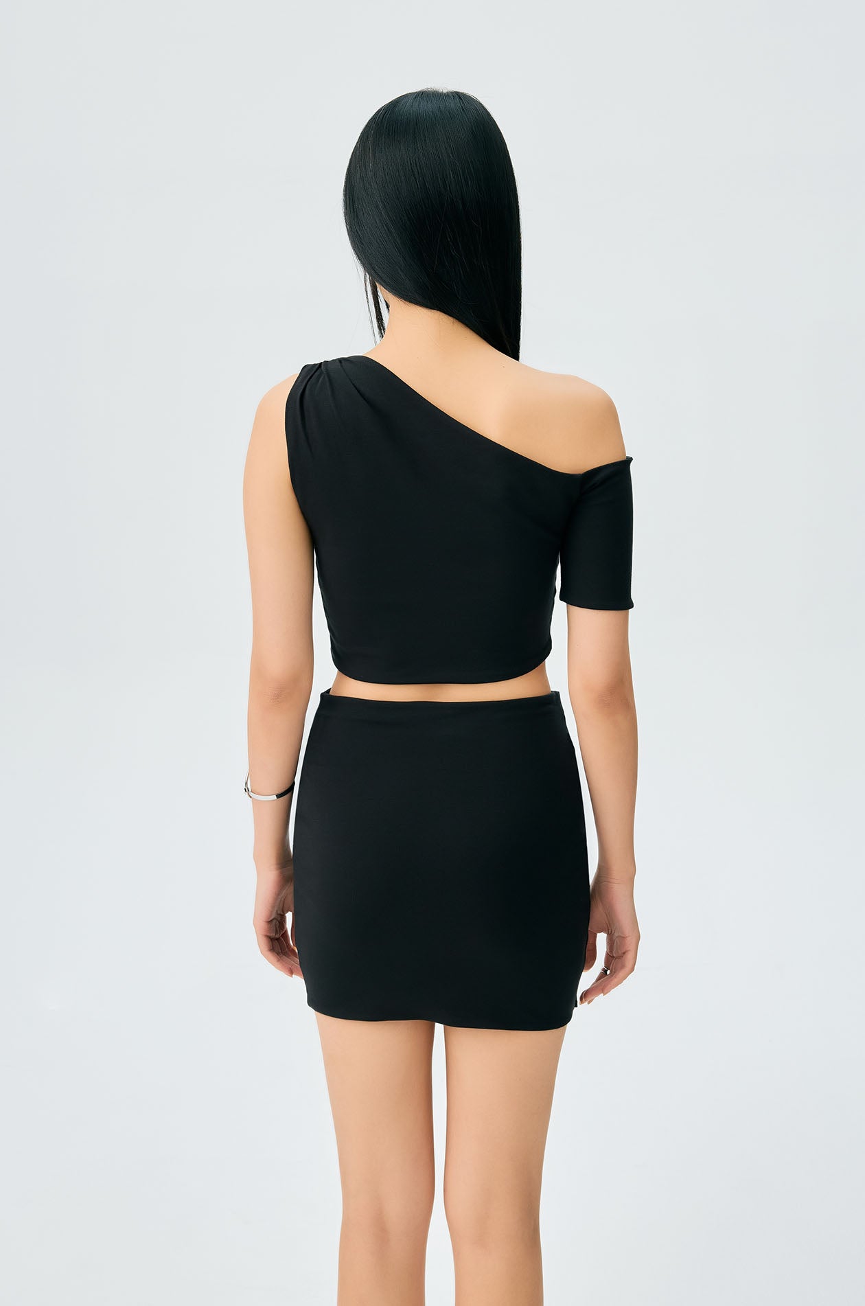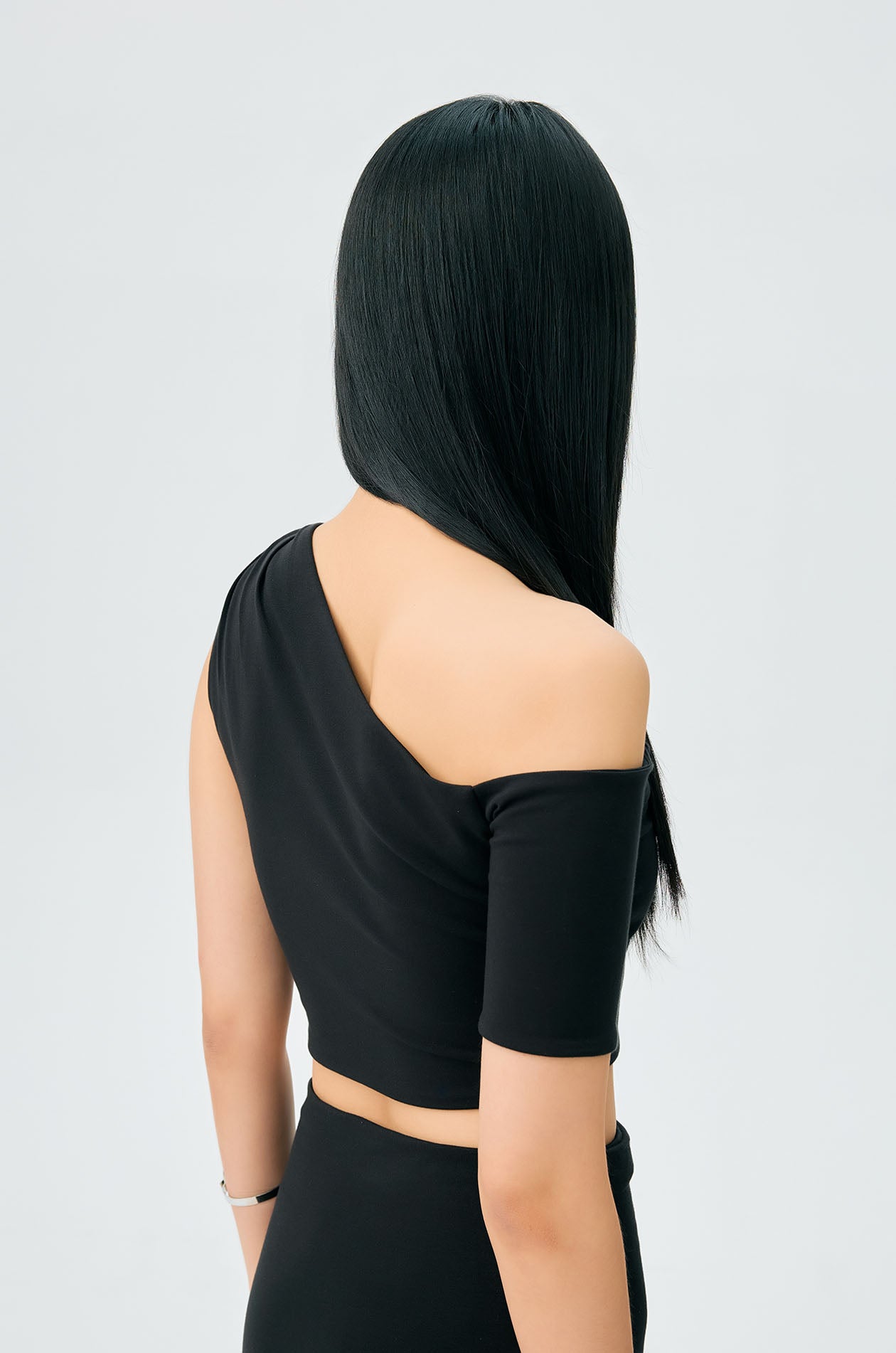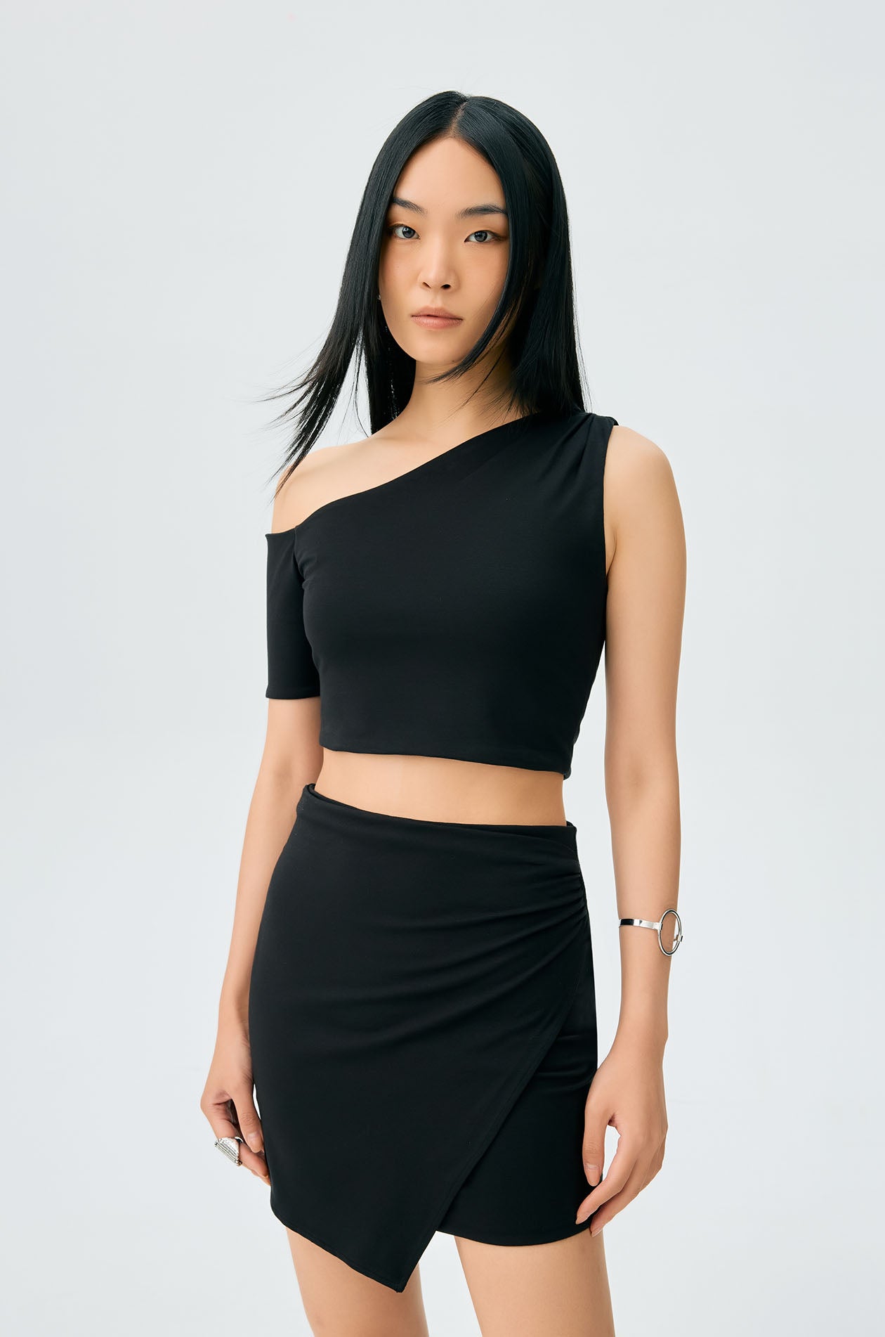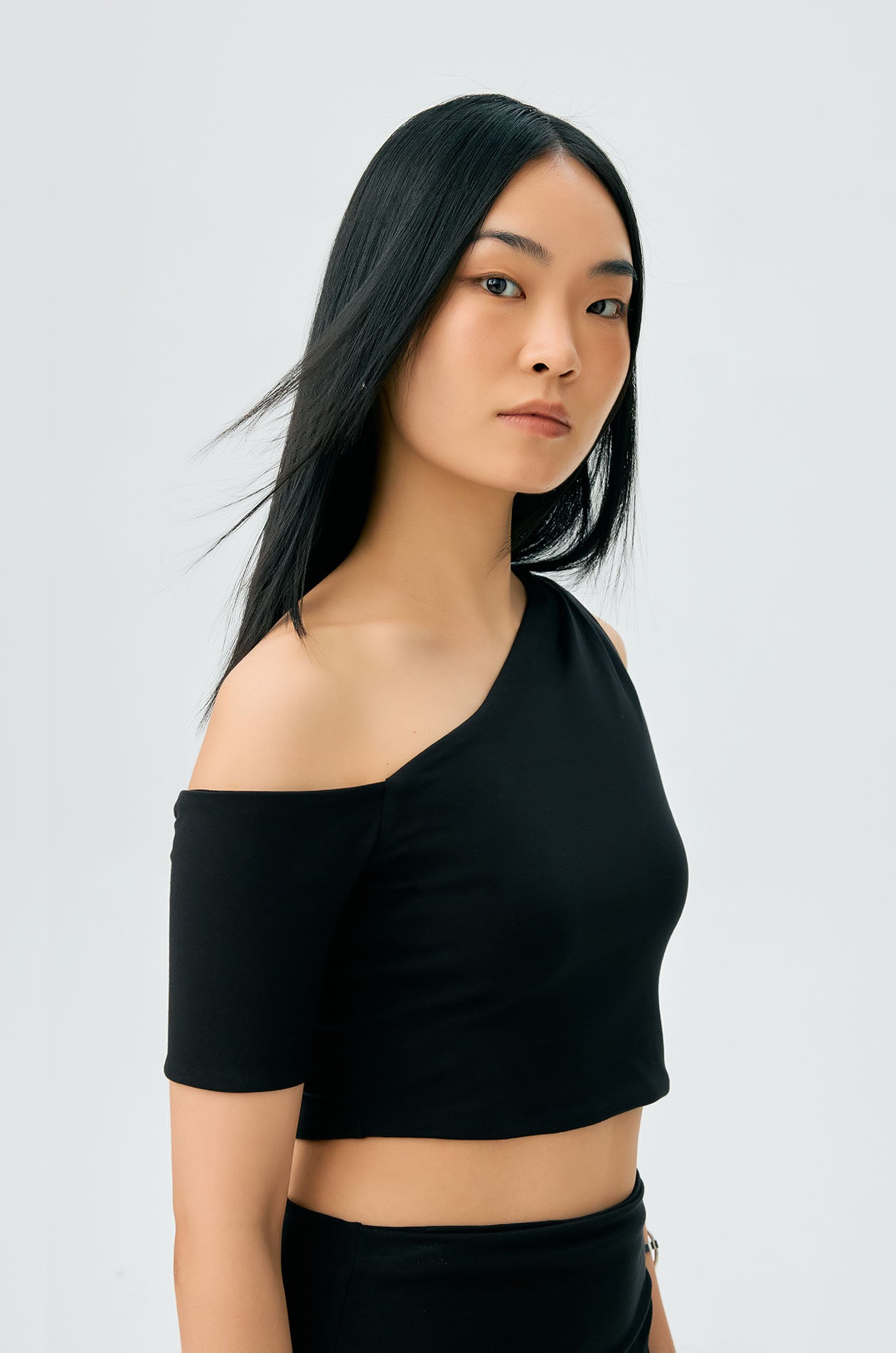 One-shoulder crop top in stretchy jersey fabric. Fitted silhouette with asymmetric design and draped shoulder. Available in black and metal grey.