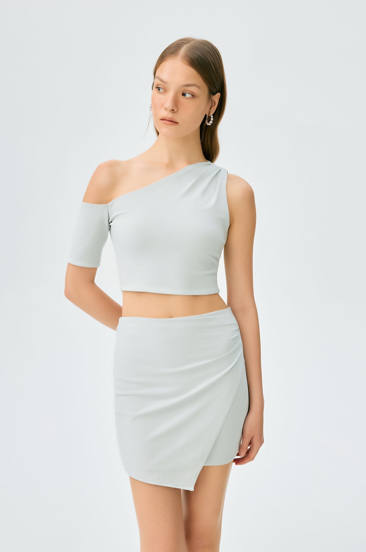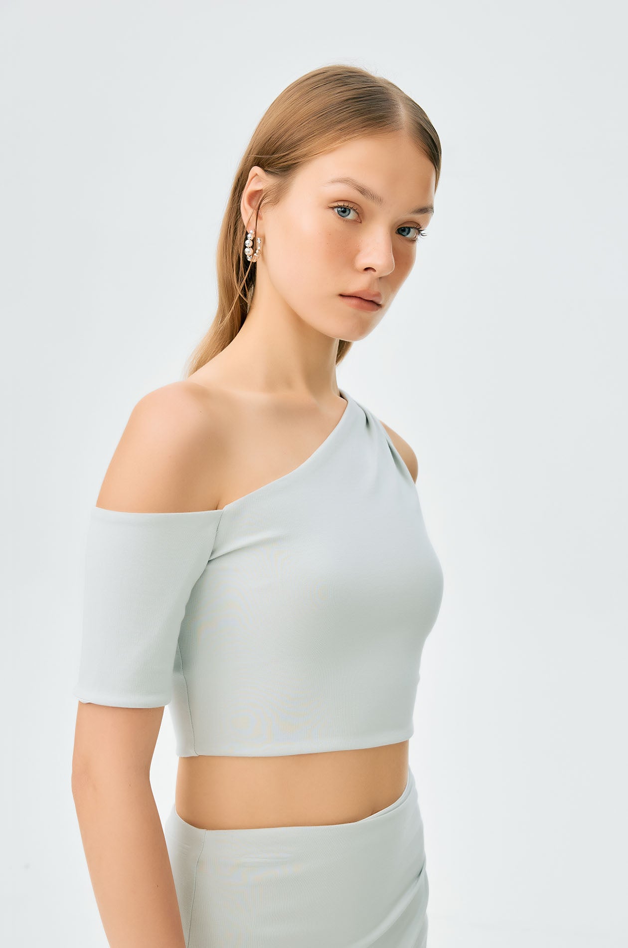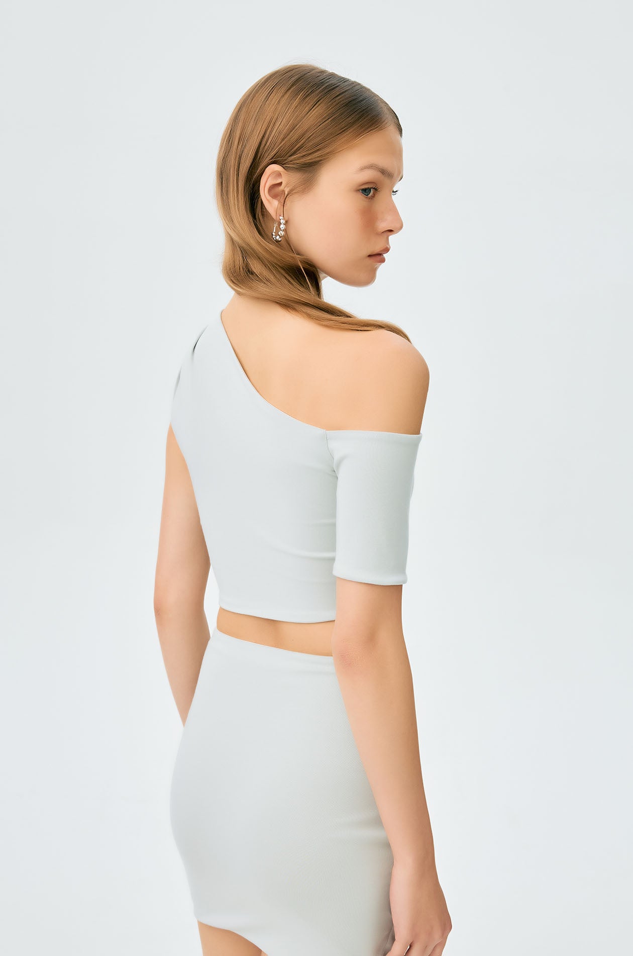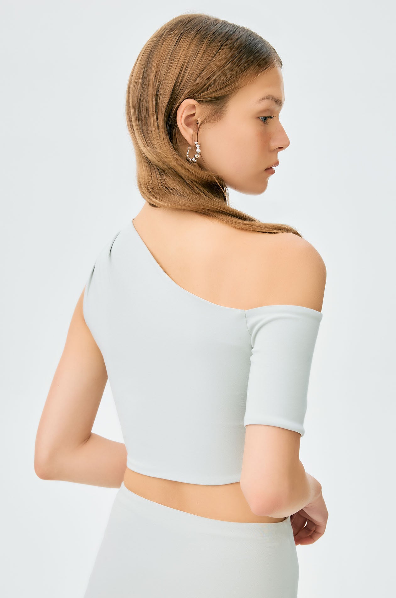 One-shoulder crop top in stretchy jersey fabric. Fitted silhouette with asymmetric design and draped shoulder. Available in black and metal grey.