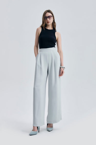 High-rise palazzo pants in crepe fabric. Ultra wide legs with double pleats and side pockets. Back zip closure. Available in black and metal grey.
