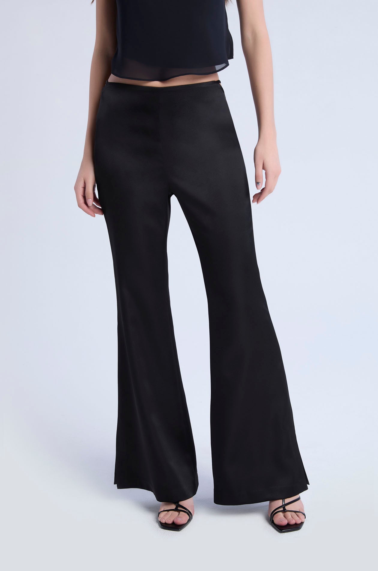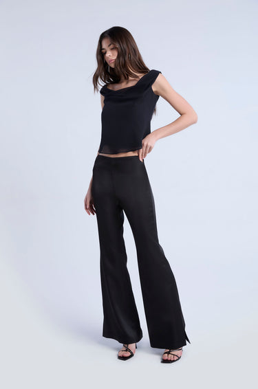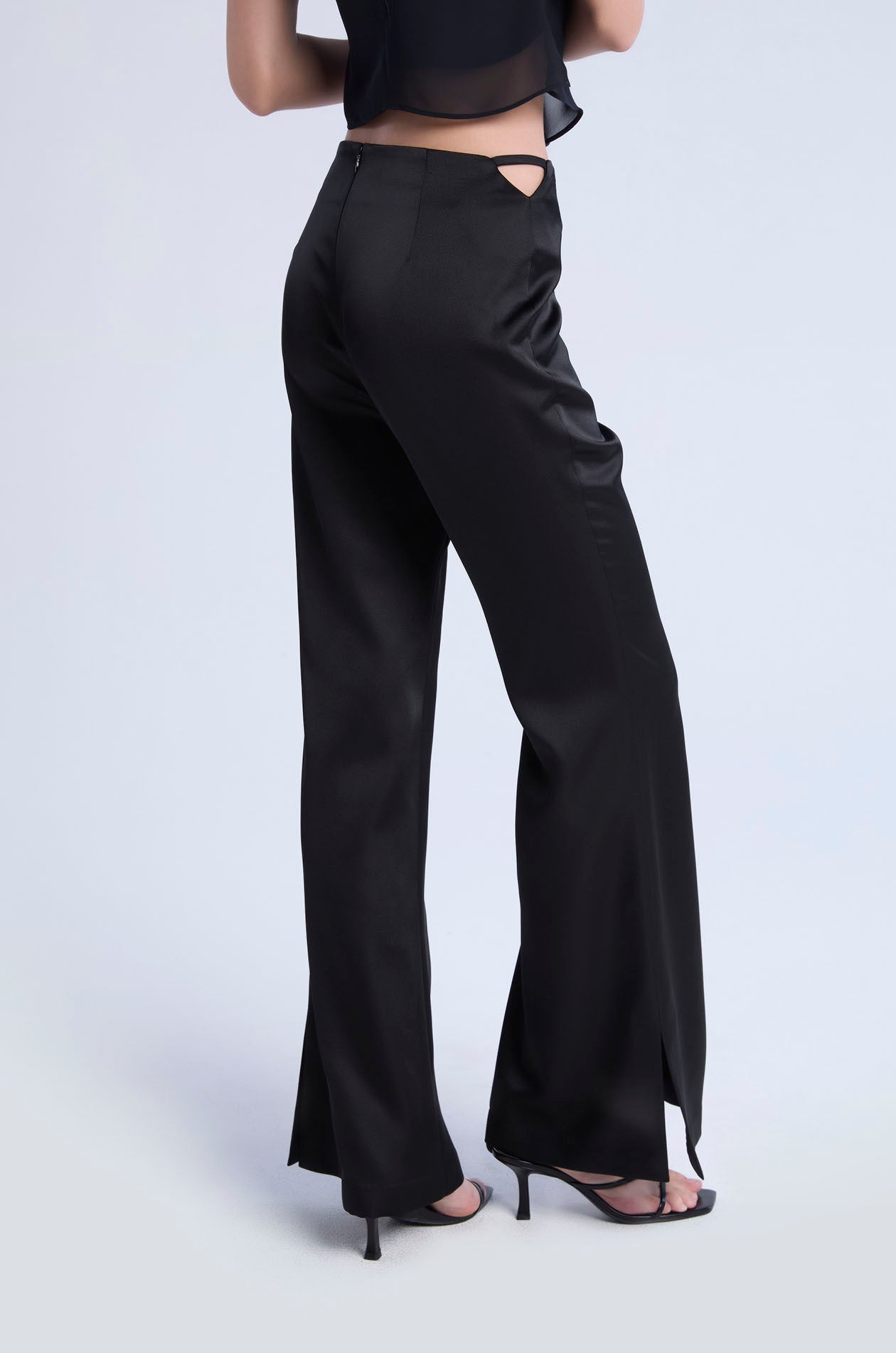 Mid-rise pants in satin. Slightly flare legs with side cut-out accents at the waistband. Back zip closure. Available in black.