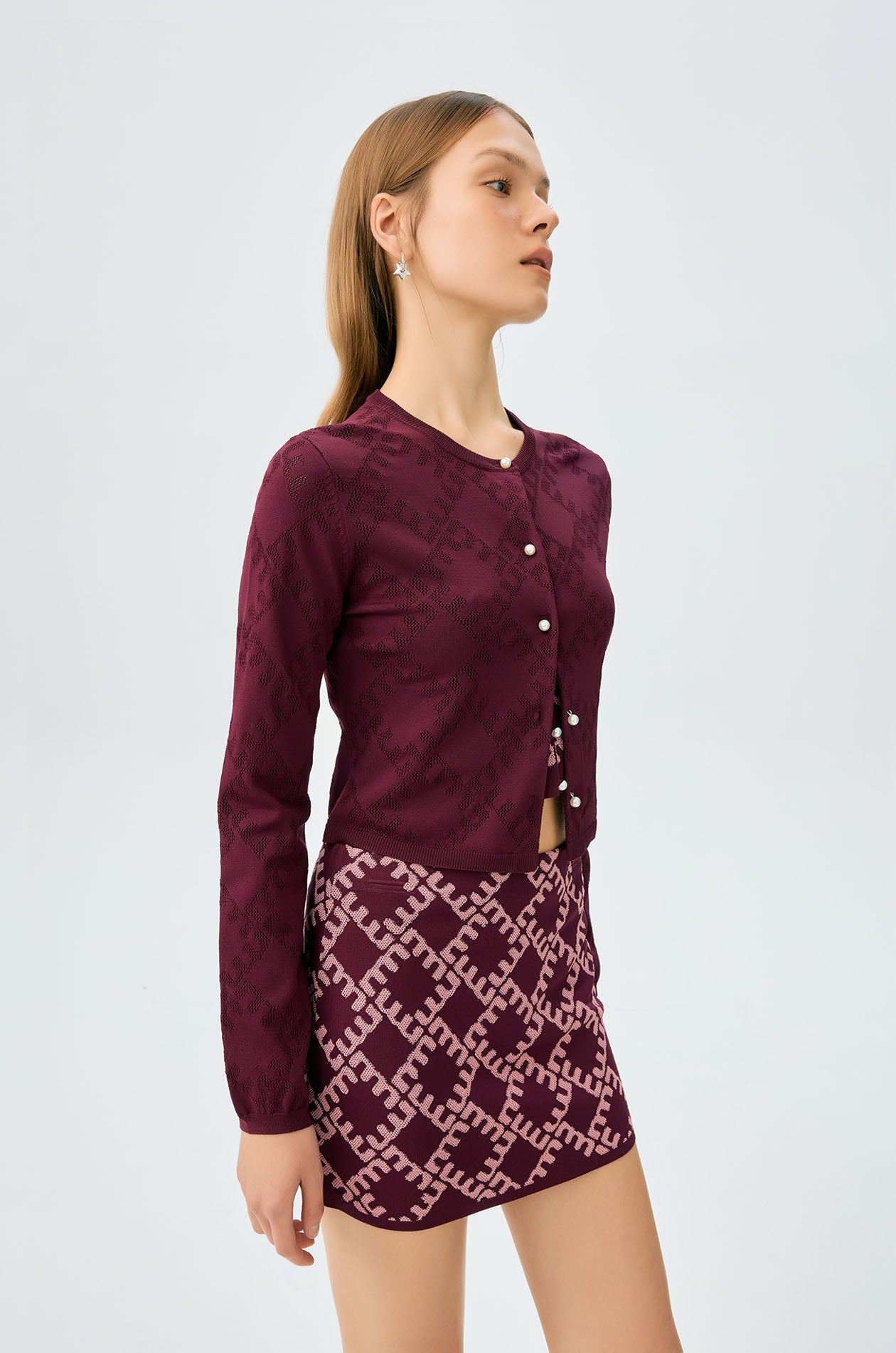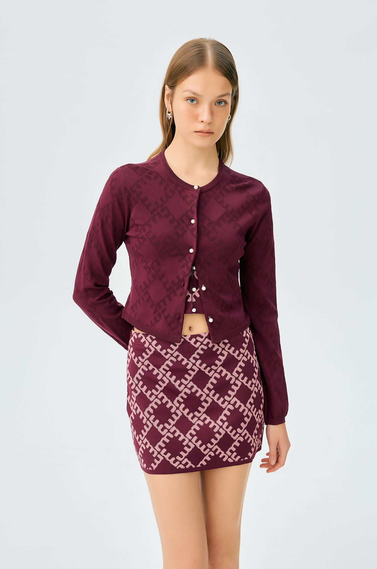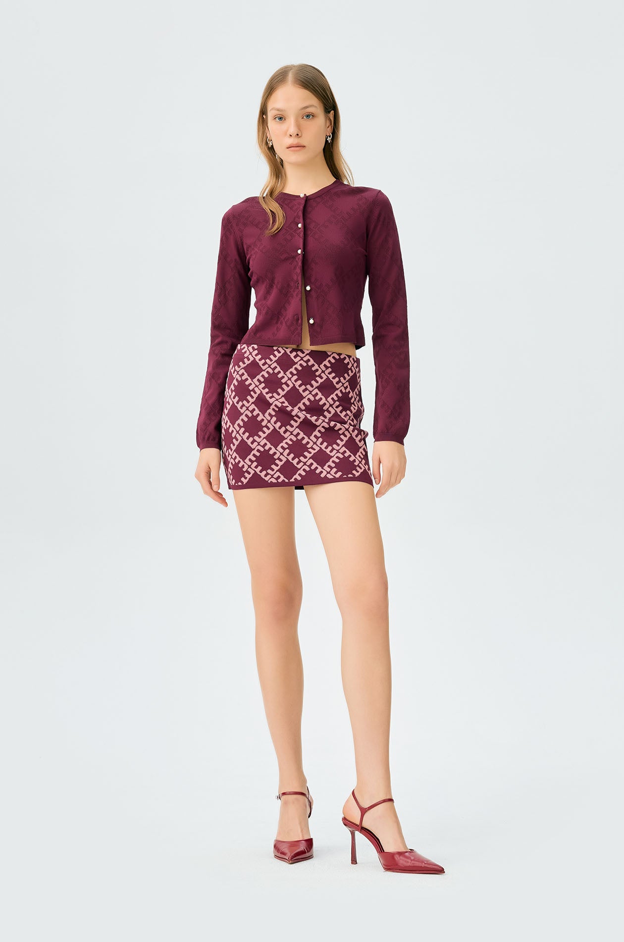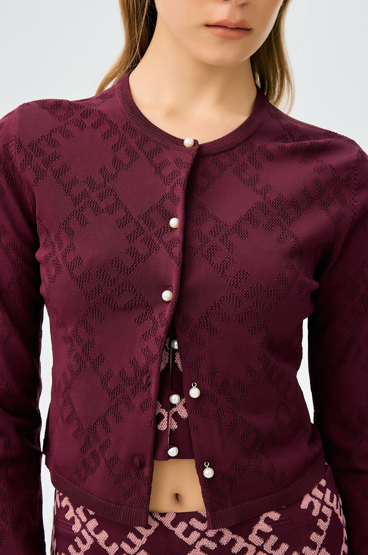 Long-sleeved cropped cardigan in jacquard knit with monogram motif. Slim fit with round neckline and ribbed edges. Front button closure. Available in cherry lacquer, metal grey, and spanish villa.