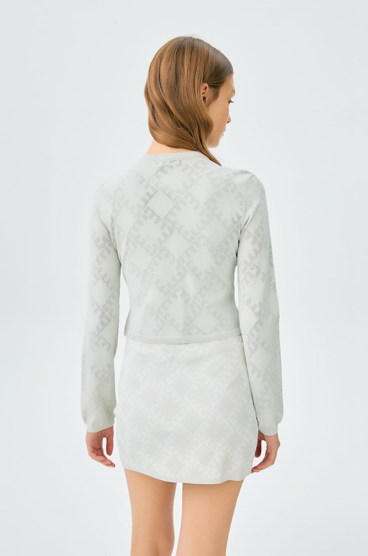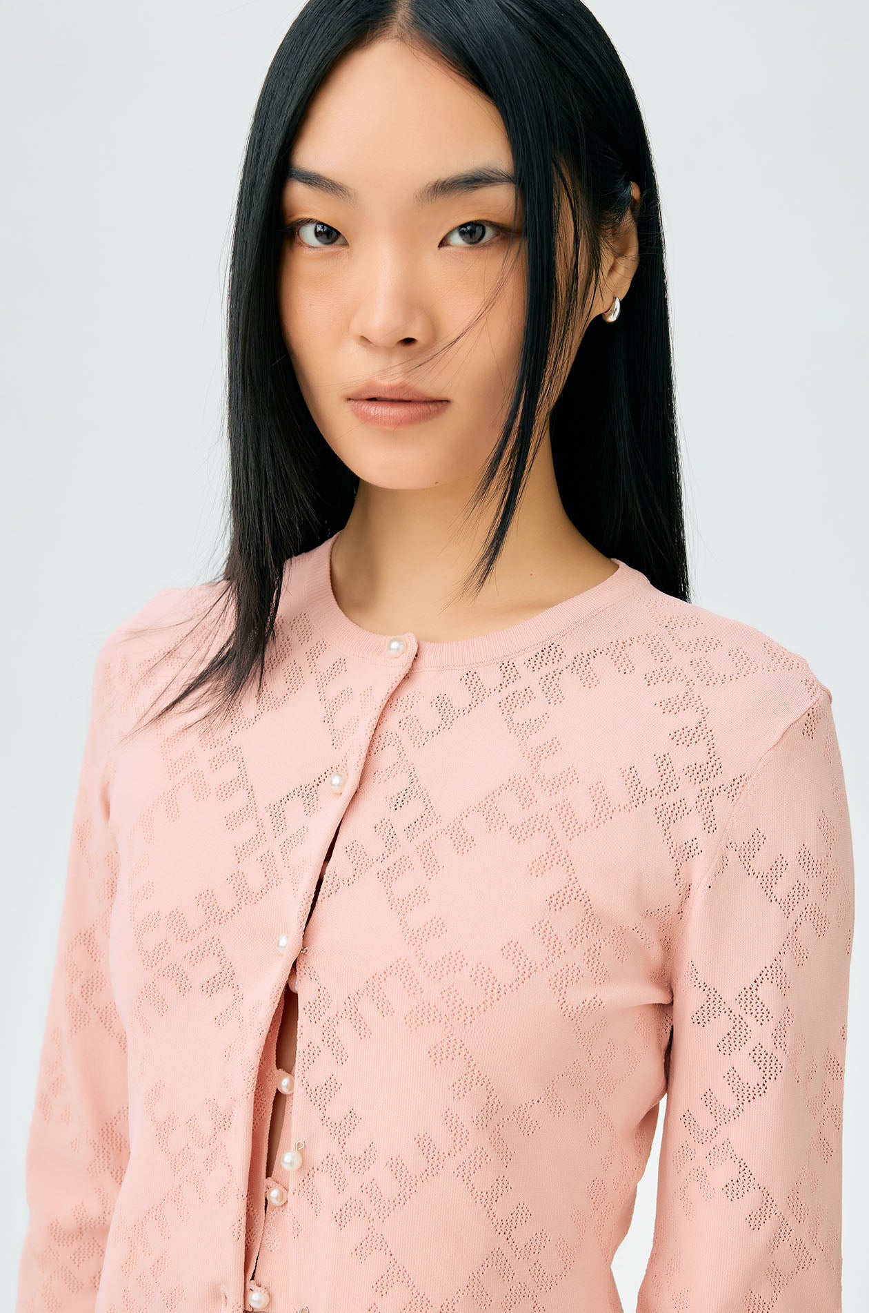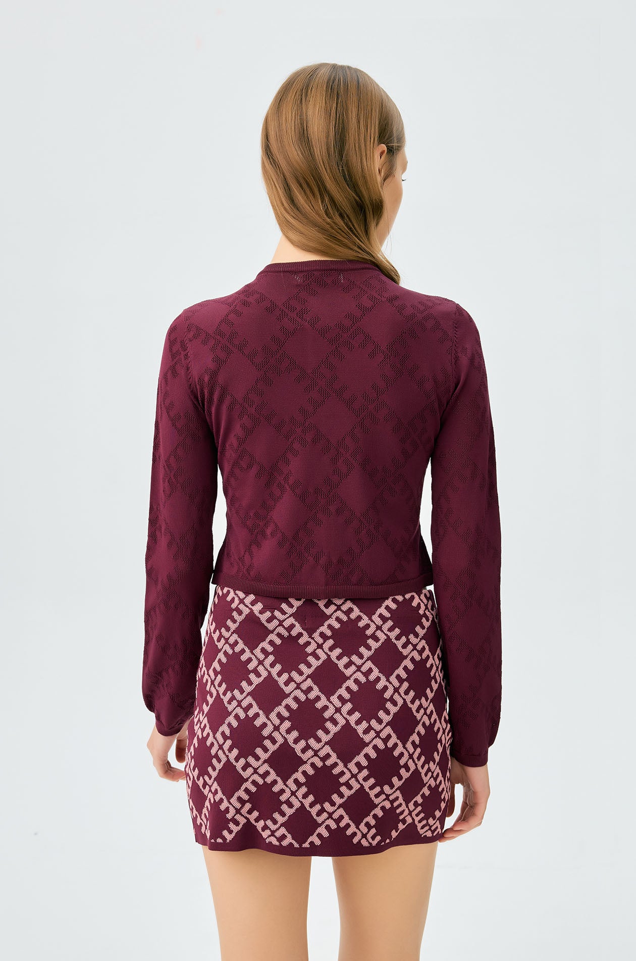Long-sleeved cropped cardigan in jacquard knit with monogram motif. Slim fit with round neckline and ribbed edges. Front button closure. Available in cherry lacquer, metal grey, and spanish villa.