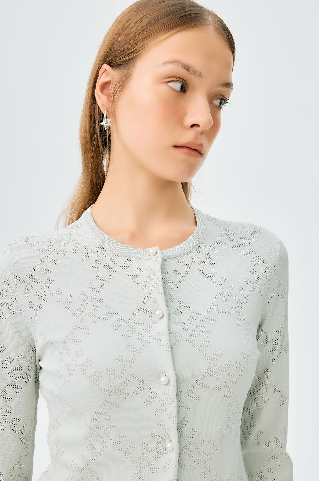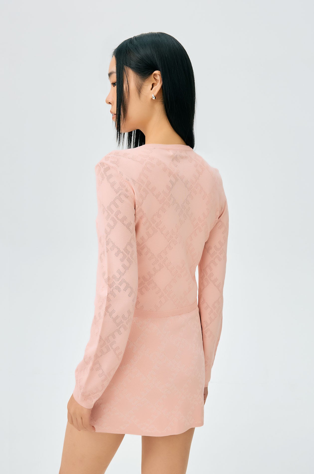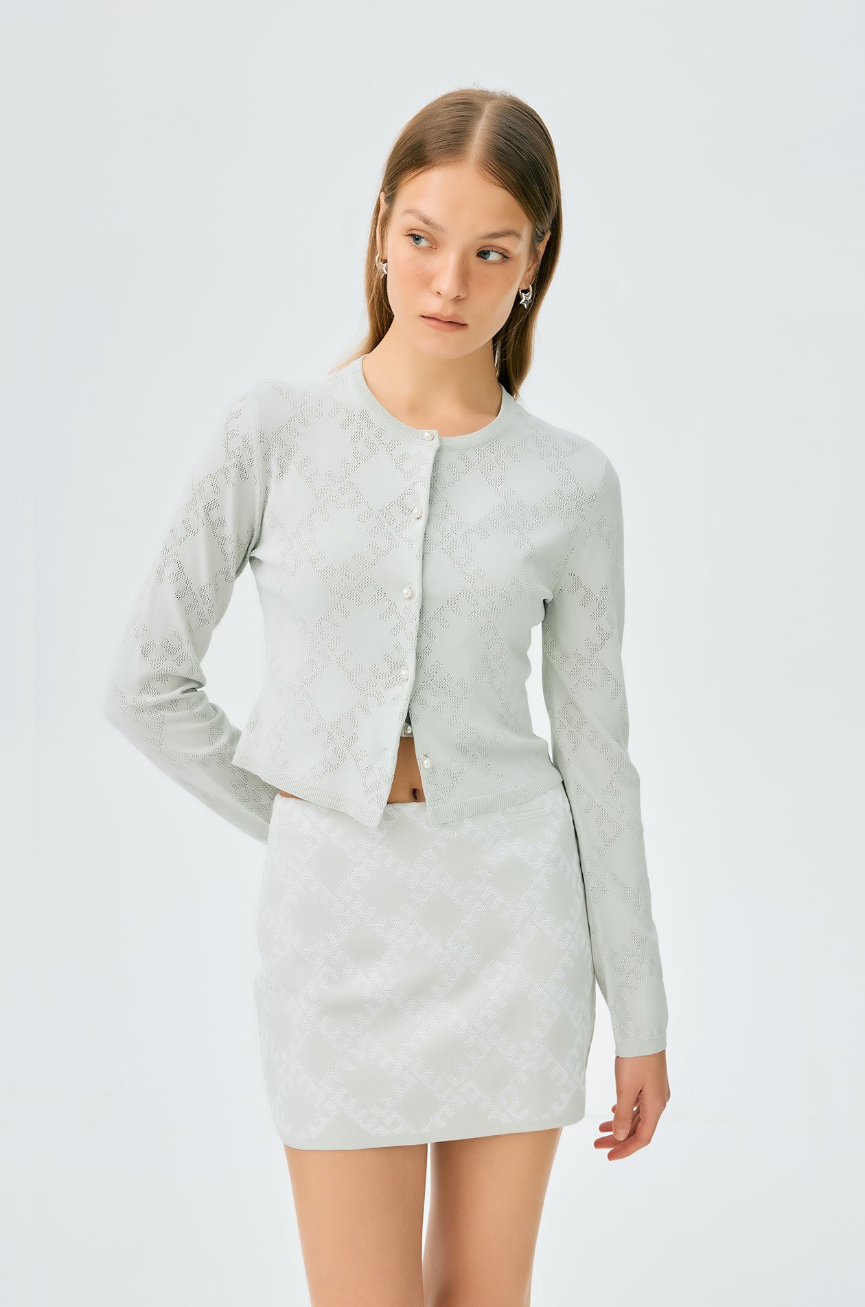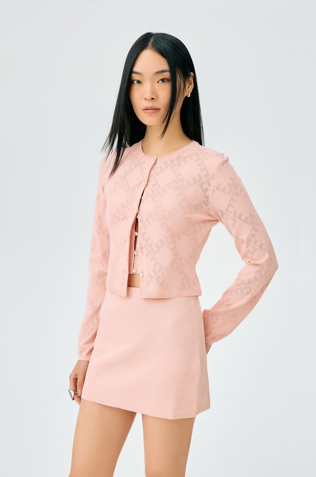 Long-sleeved cropped cardigan in jacquard knit with monogram motif. Slim fit with round neckline and ribbed edges. Front button closure. Available in cherry lacquer, metal grey, and spanish villa.