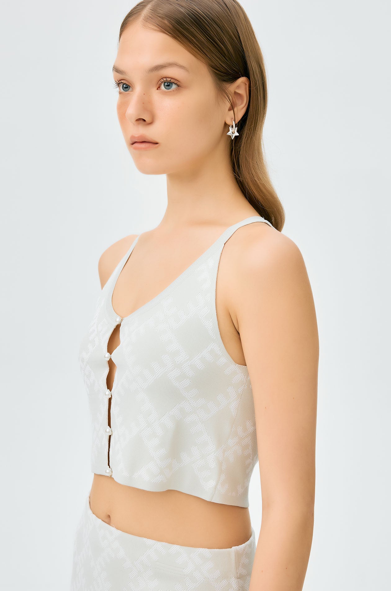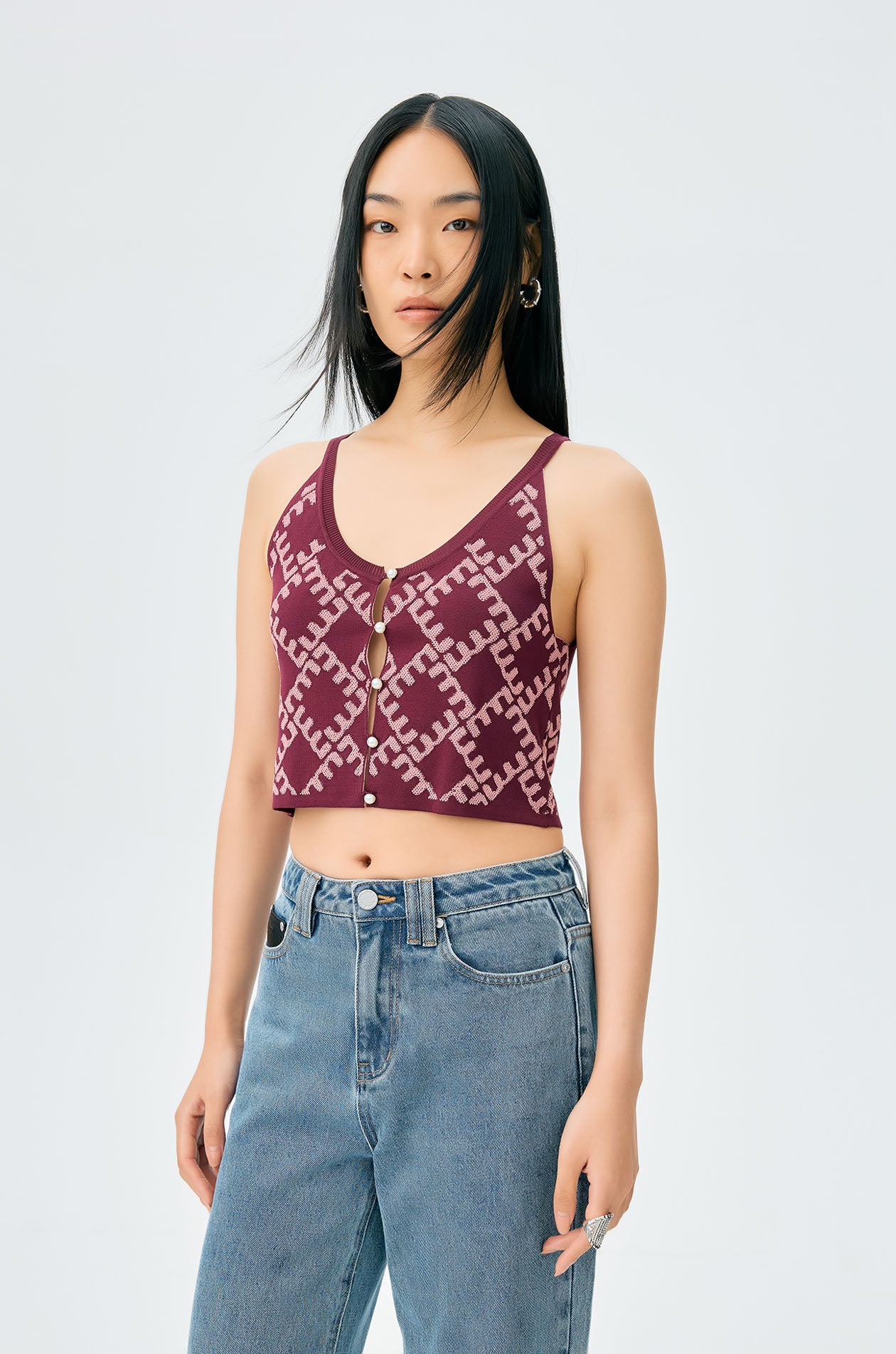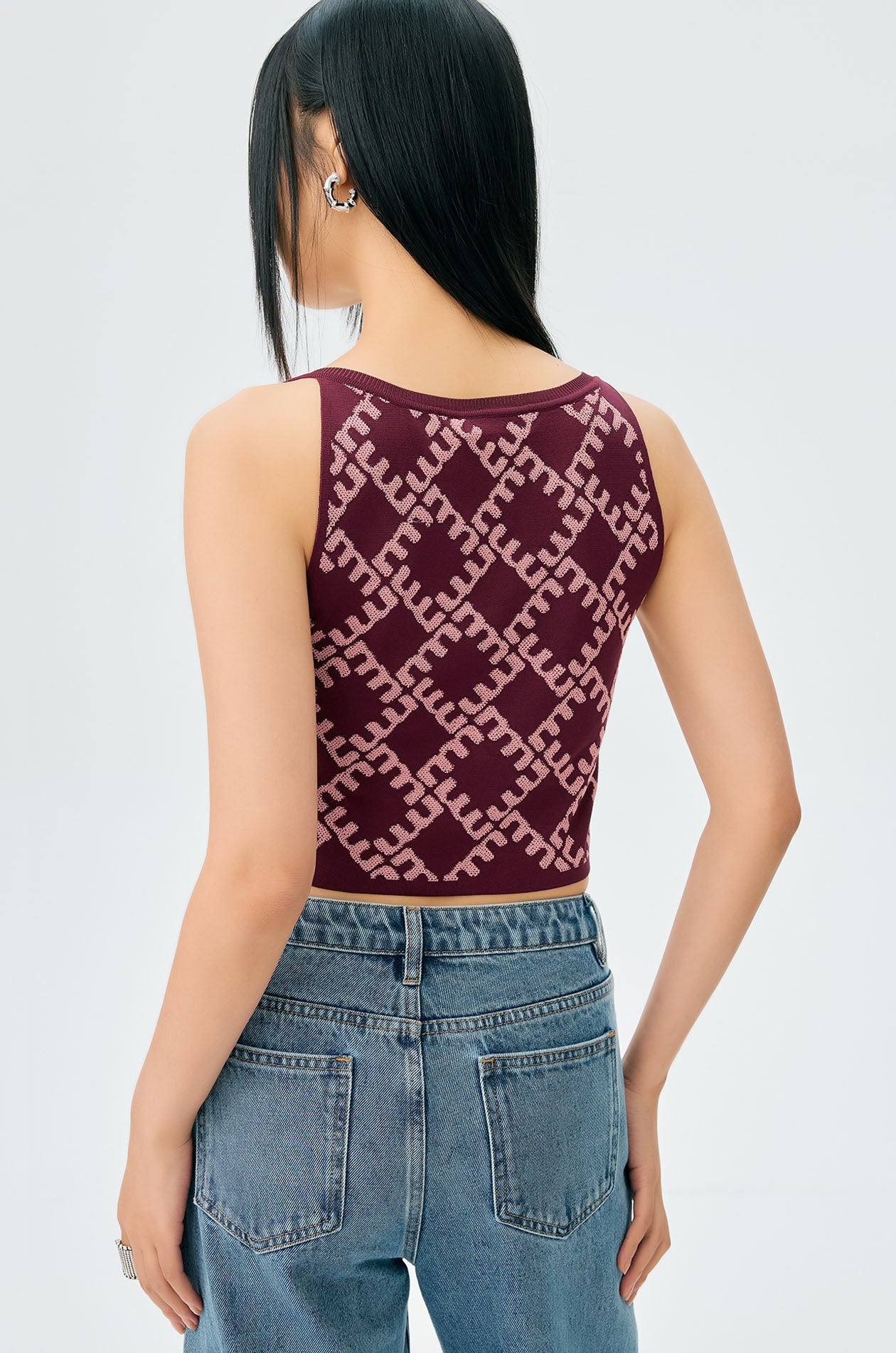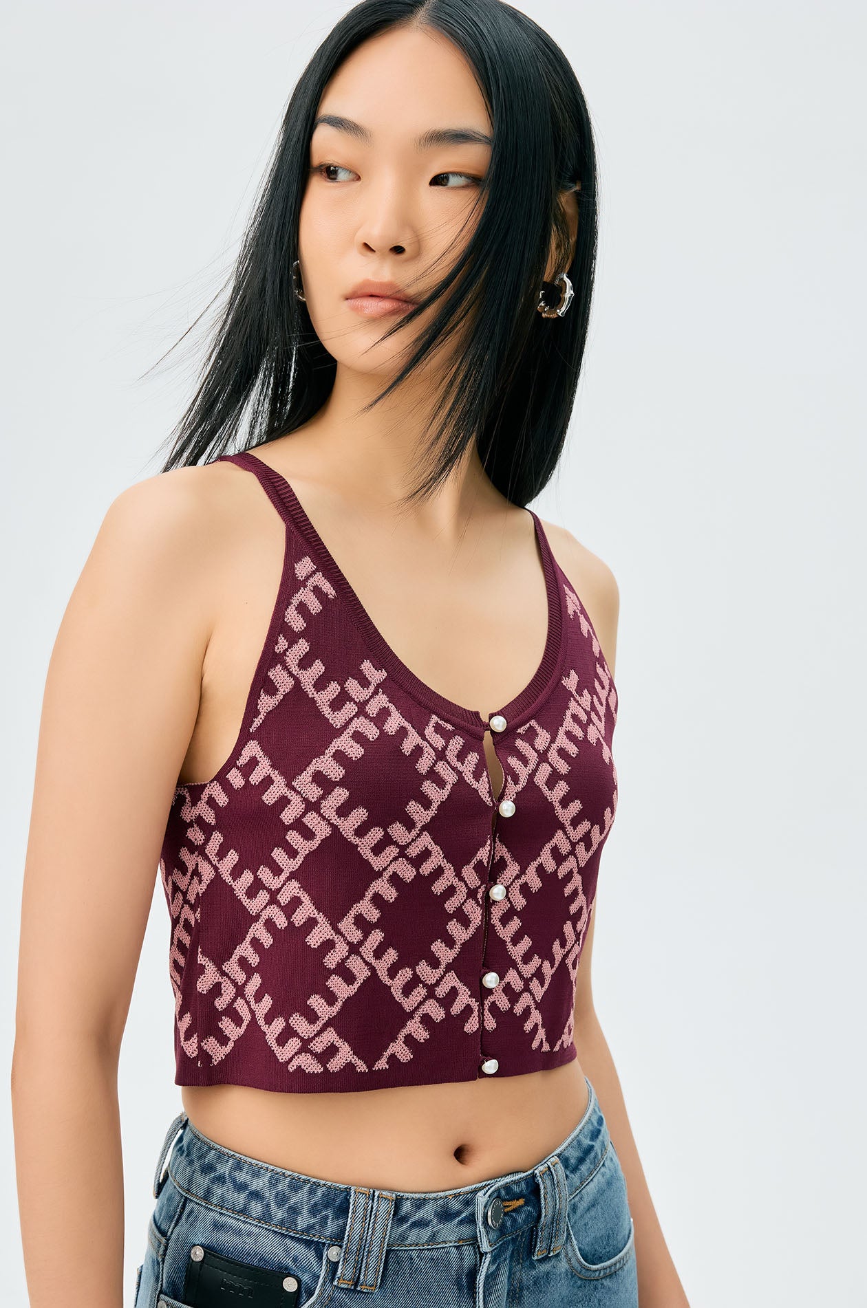 Sleeveless cropped top in jacquard knit with monogram motif. Slim fit with U neckline and ribbed edges. Front button closure. Available in cherry lacquer, metal grey, and spanish villa.