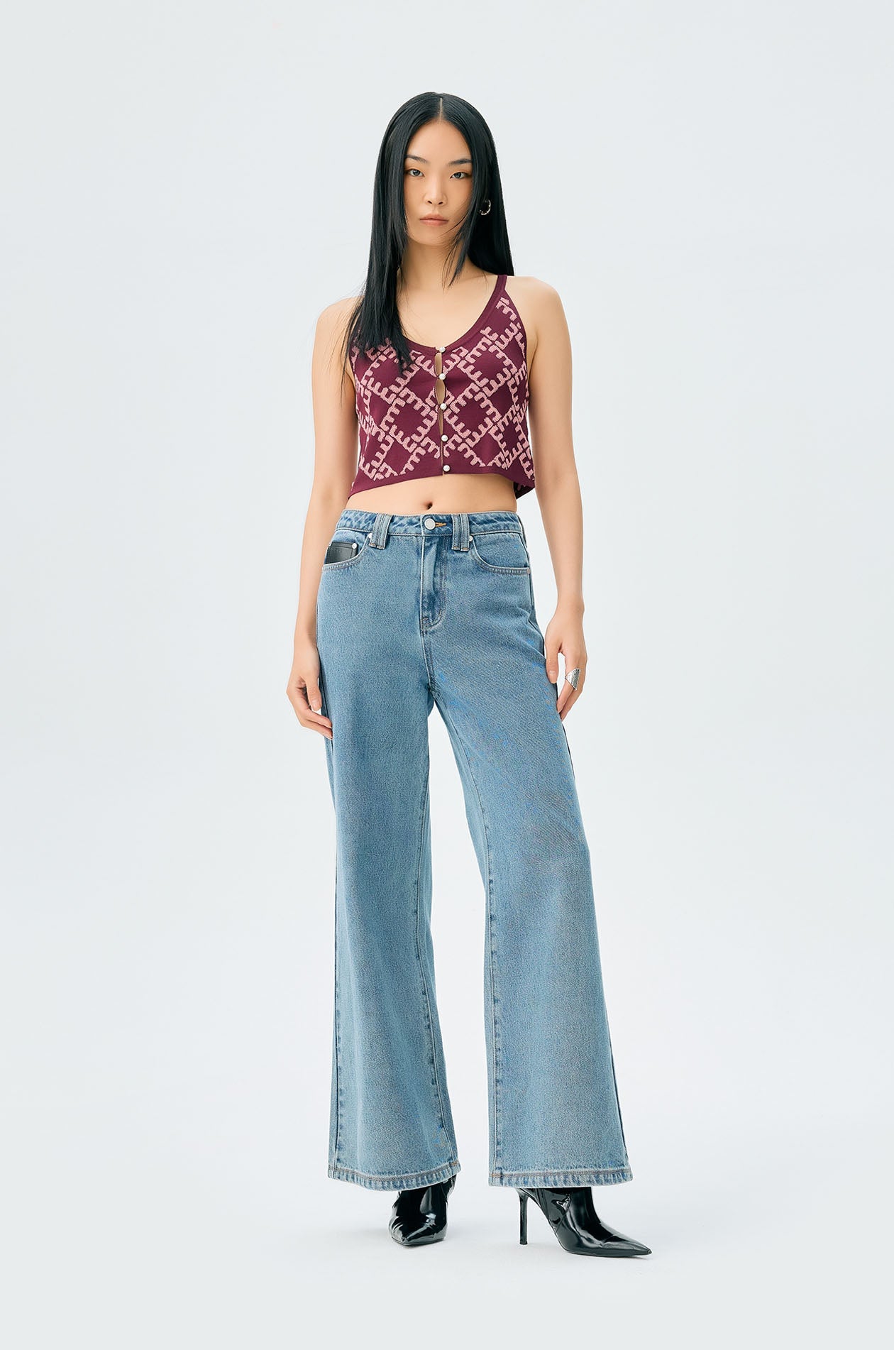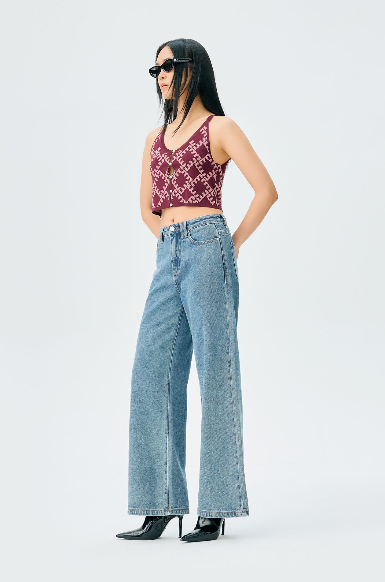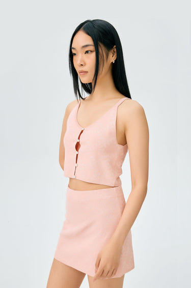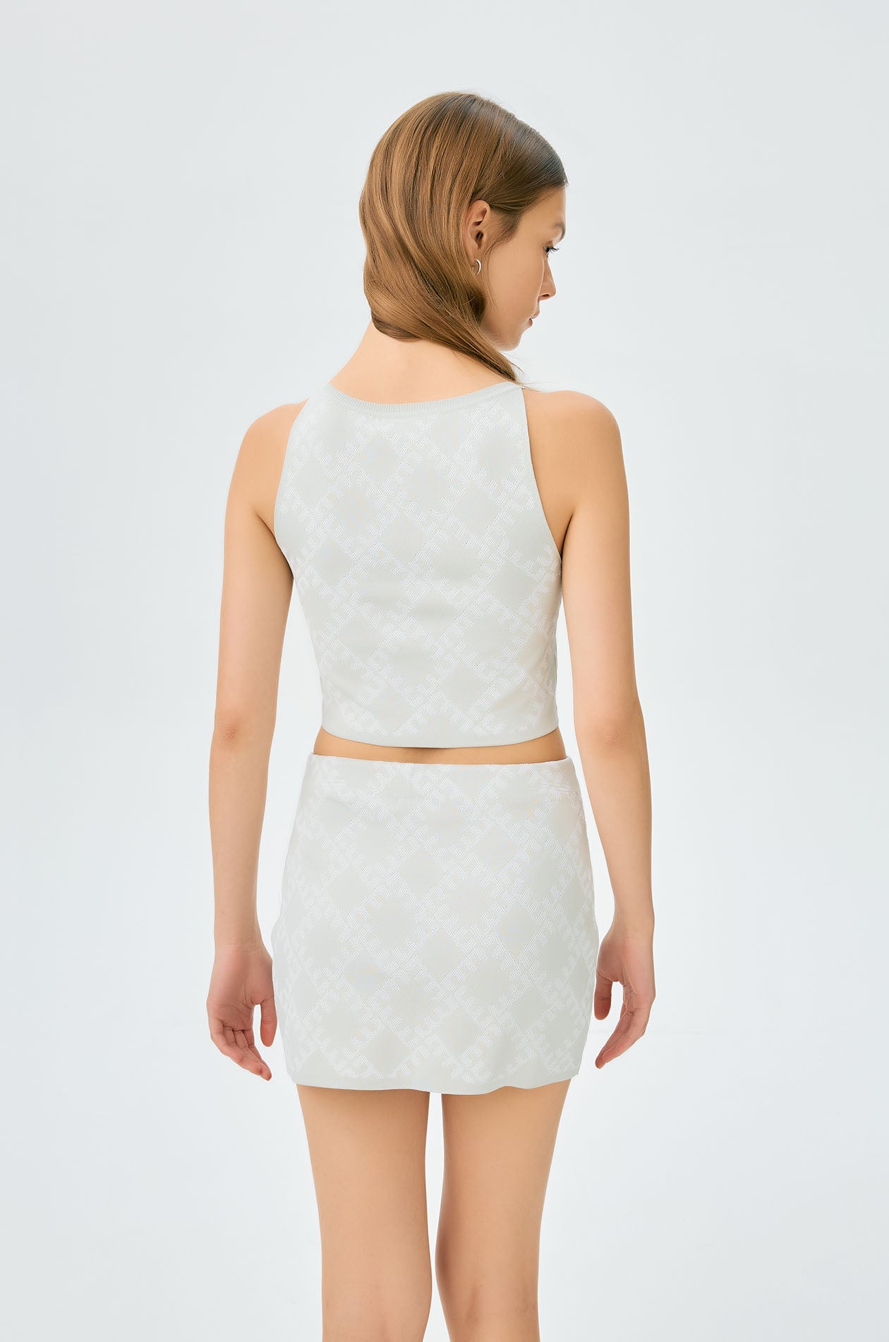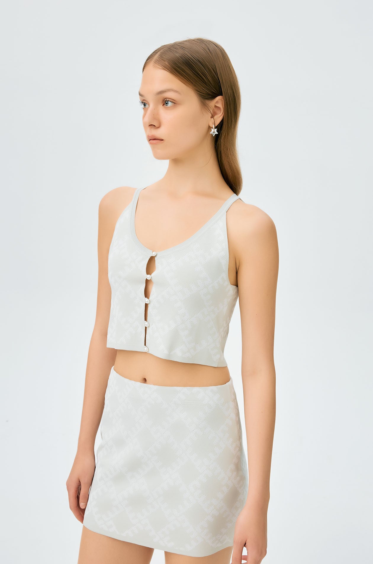 Sleeveless cropped top in jacquard knit with monogram motif. Slim fit with U neckline and ribbed edges. Front button closure. Available in cherry lacquer, metal grey, and spanish villa.