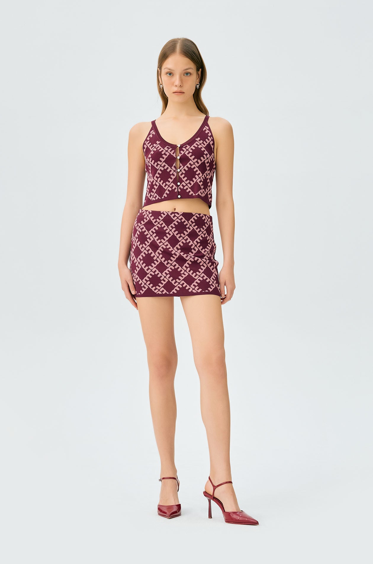 Mid-rise mini skirt in jacquard knit with monogram motif. Pencil silhouette with elastic waistband. Available in cherry lacquer, metal grey, and spanish villa.