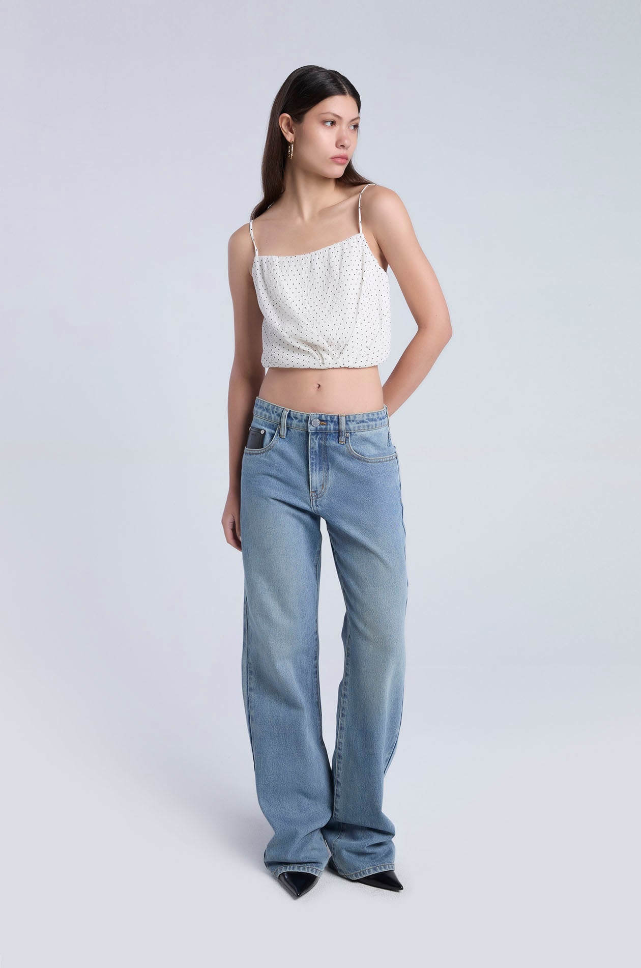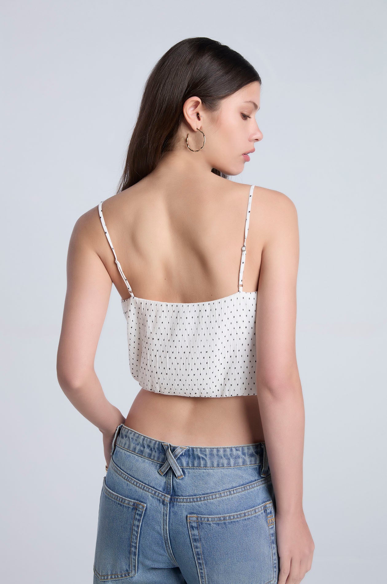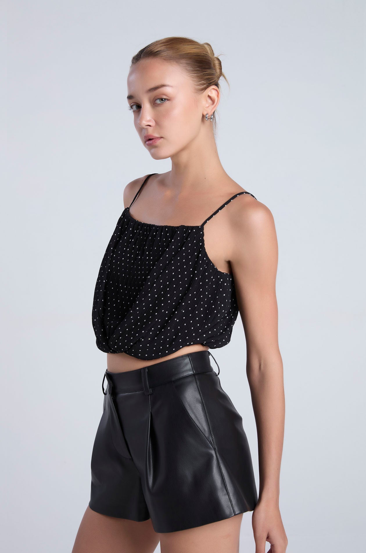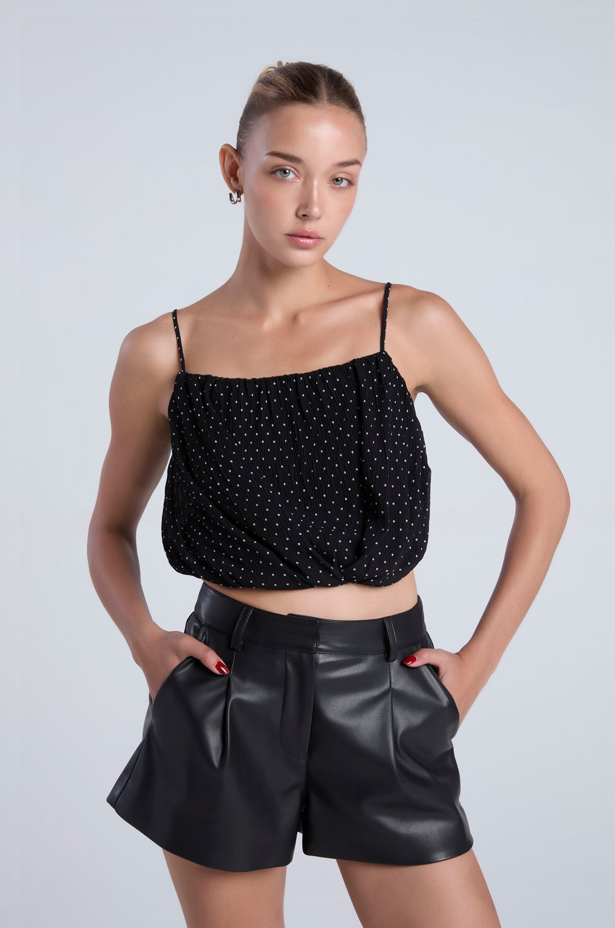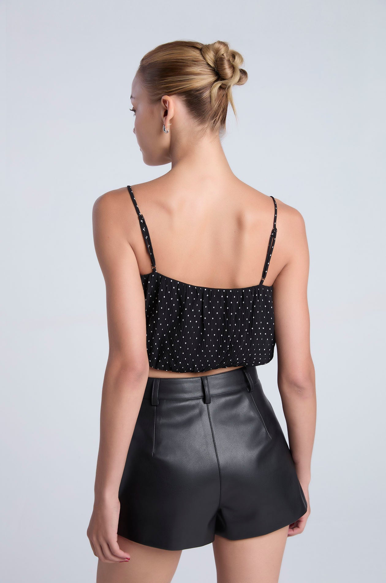 Strappy crop top in plissé chiffon with contrast dot. Straight neckline, adjustable camisole straps, and cinched hemline. Available in black and light taupe.