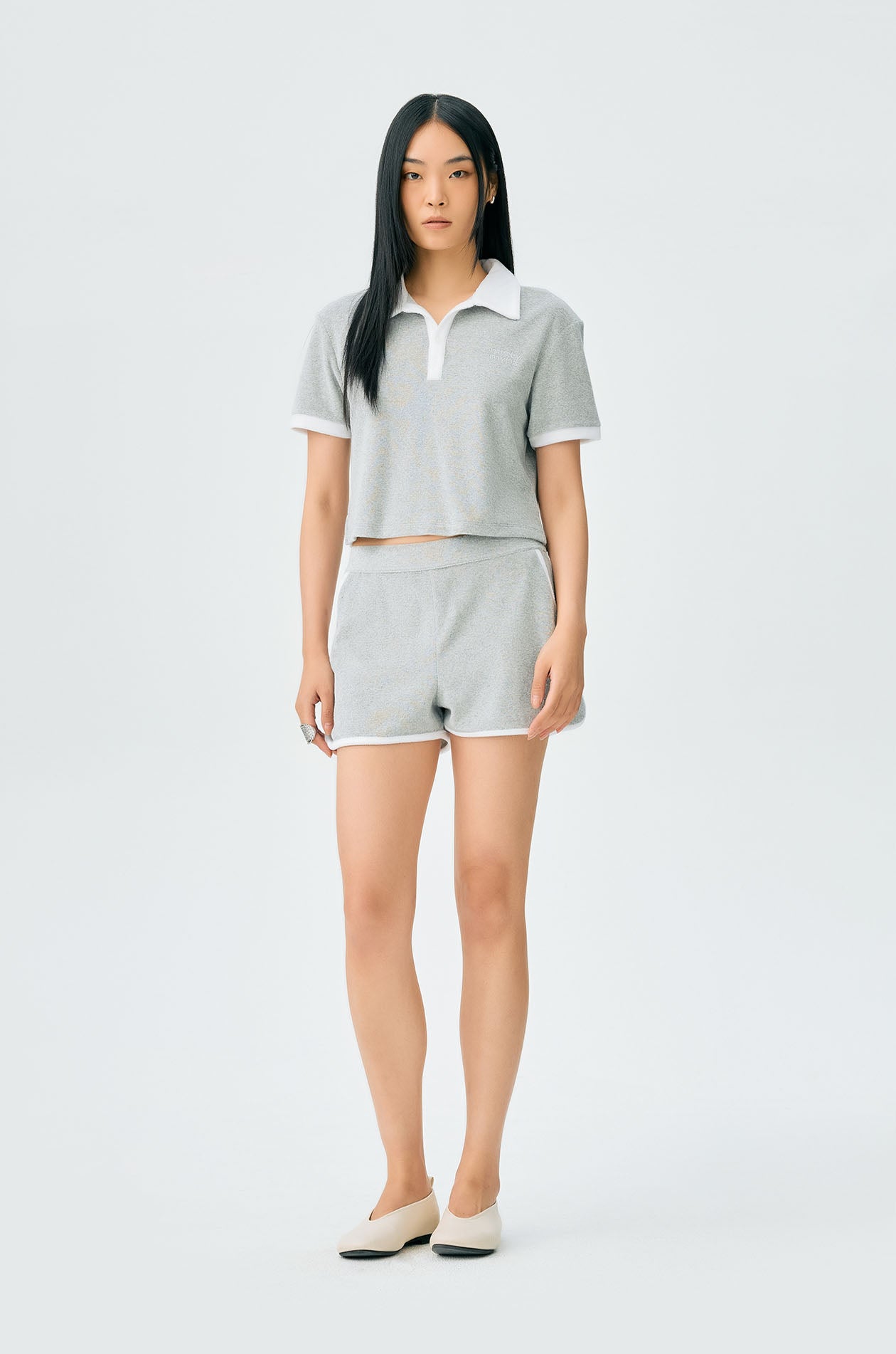 Mid-rise micro sweatshorts in towelling fabric. Side pockets, contrast edges, and curve hems with logo embroidery. Elastic waistband. Available in grey and strawberry ice.