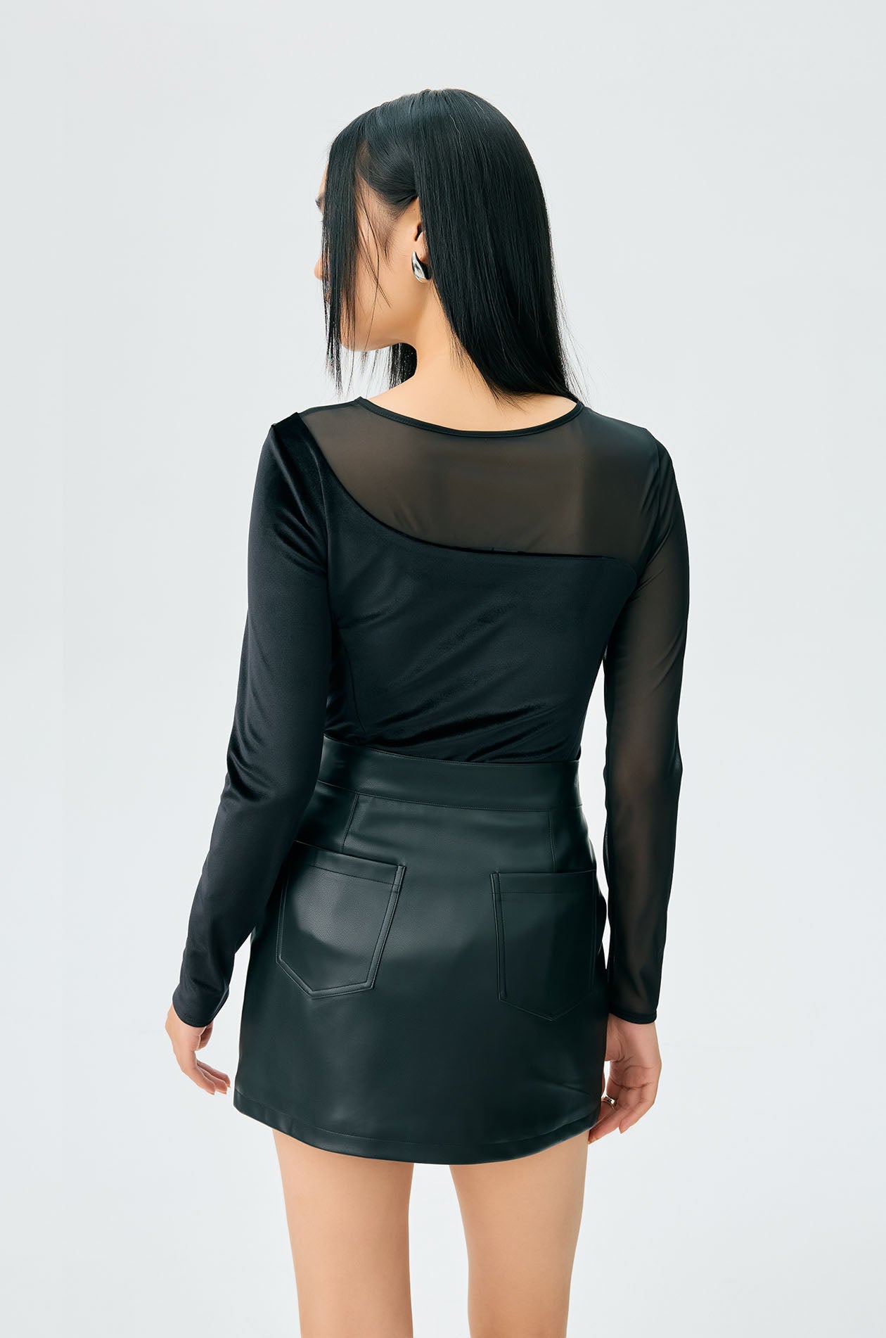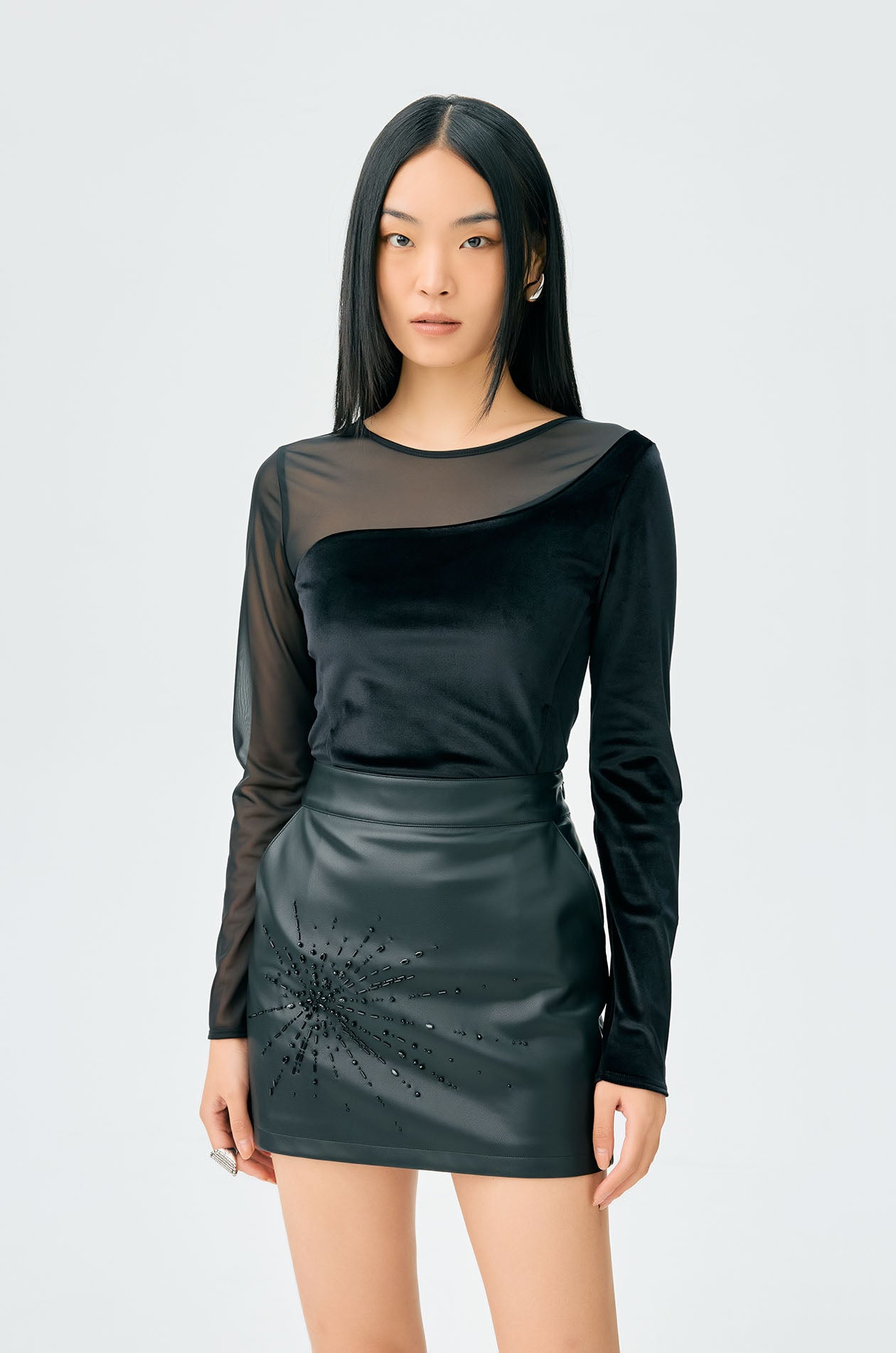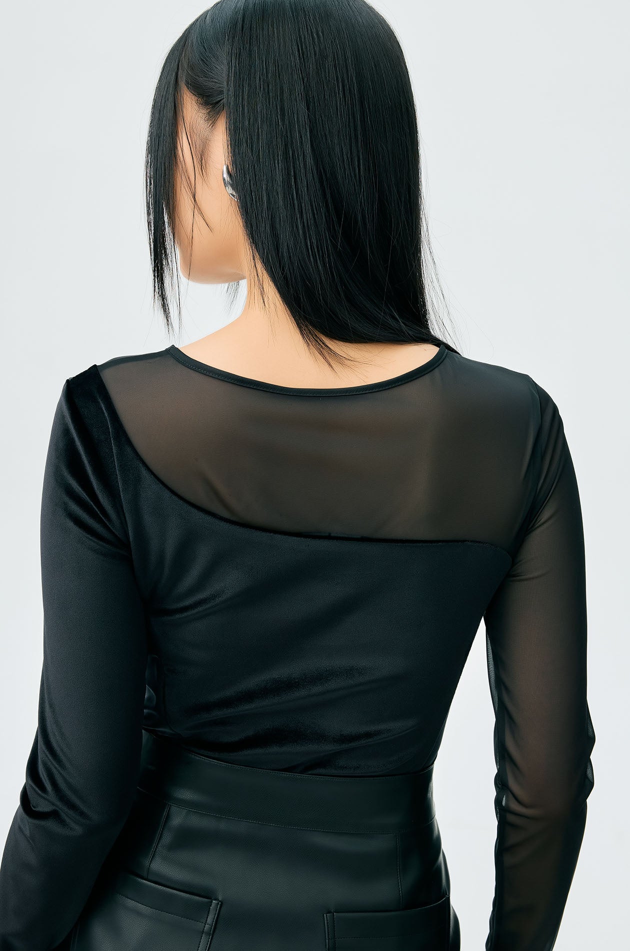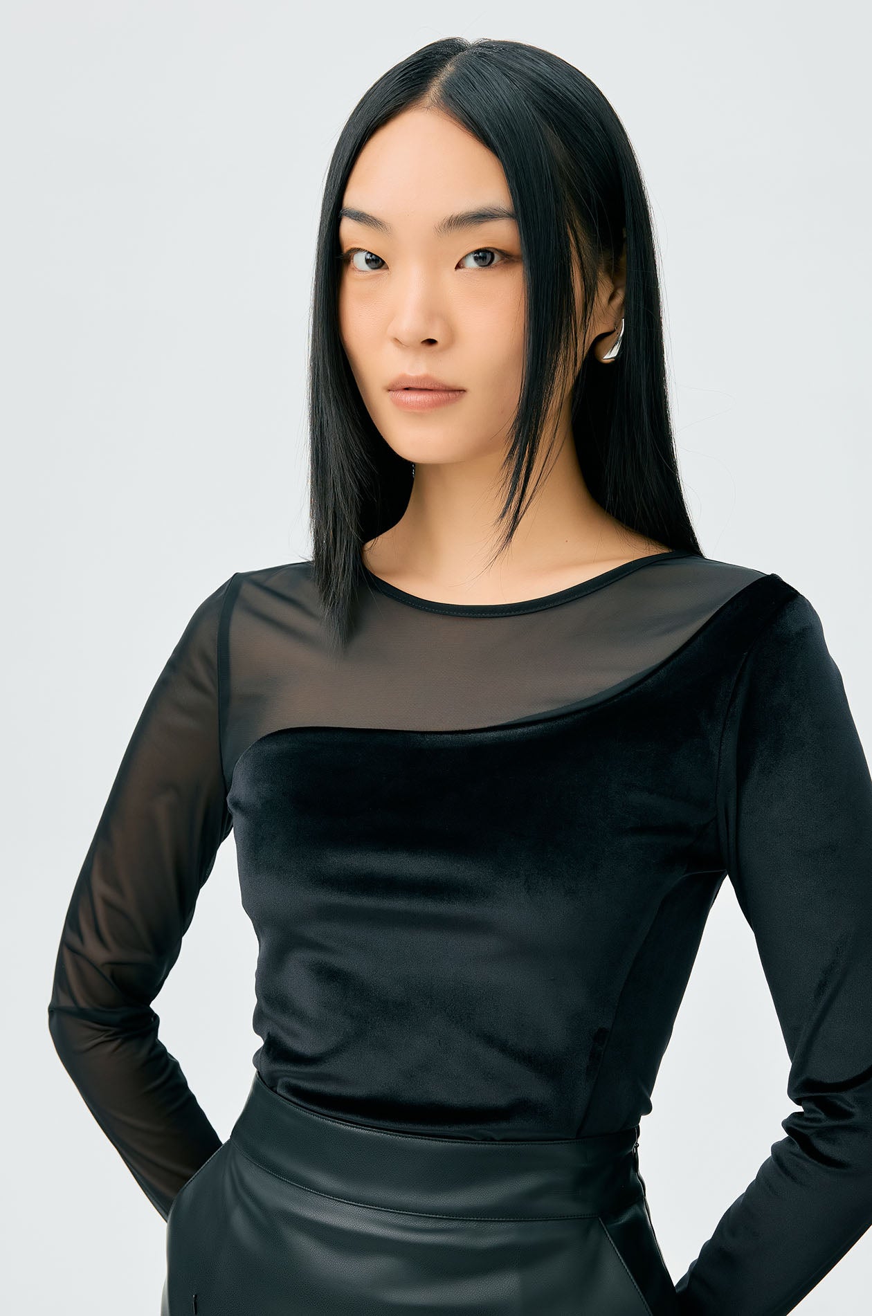 Long-sleeved top in velvet with sheer panel. Slim fit with boat neckline. Available in black.