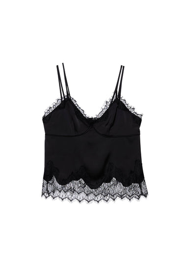 Strappy cami top in satin with lace trim. Plunging neckline and twin straps. Available in black and white.