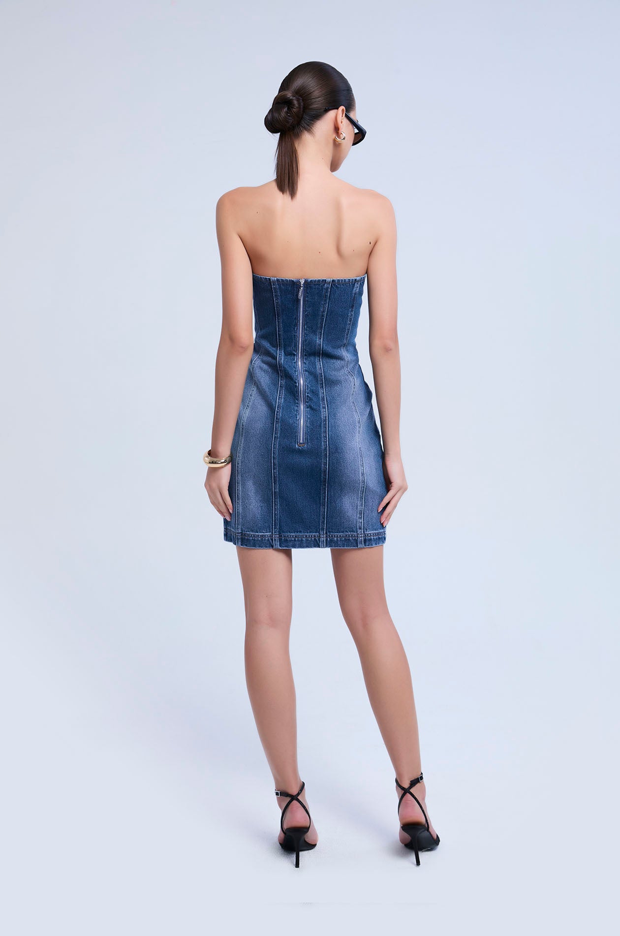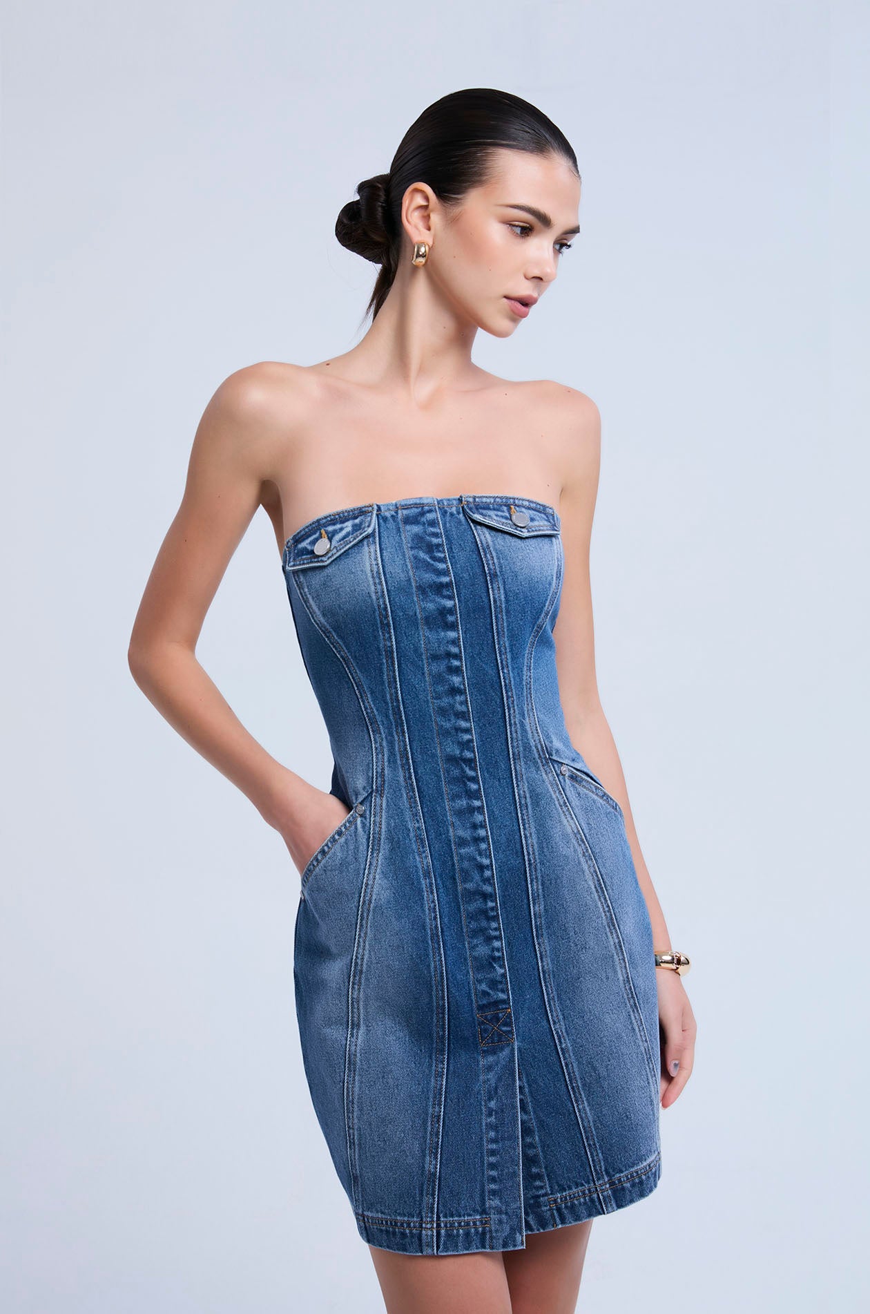 Mini tube dress crafted from structured cotton denim. Designed in a body-con silhouette that contours the figure, featuring trucker-jacket–inspired pocket detailing for a bold yet refined statement. Available in stone wash.
