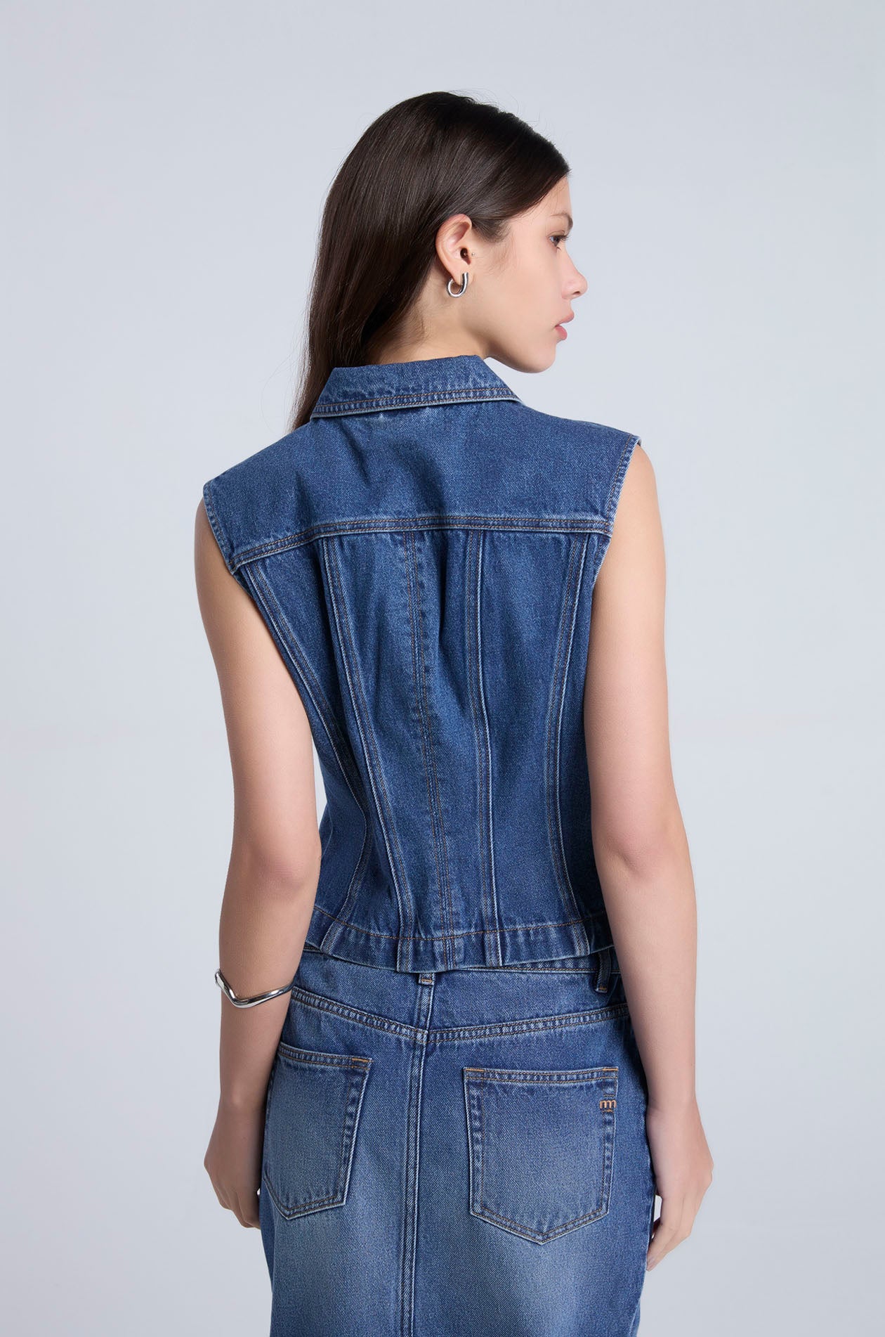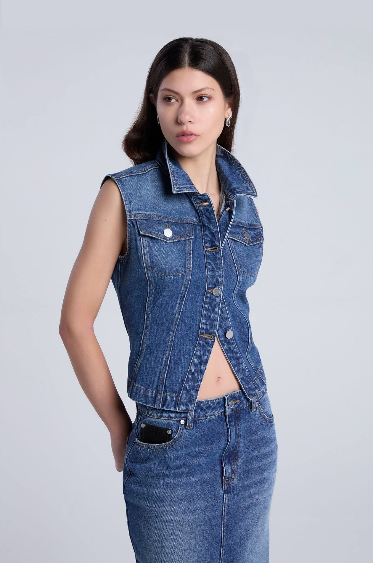 Sleeveless to in cotton denim. Slim fit with classic collar, tapered waistline, and chest pockets. Front button closure. Available in dark blue.