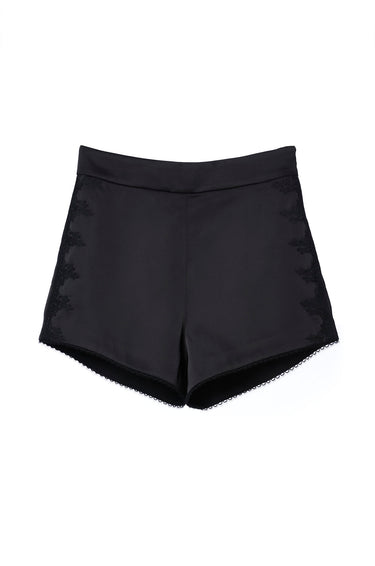 High-rise micro shorts in satin, adorned with delicate floral lace appliqué running down both legs. Side zip closure. Available in black.