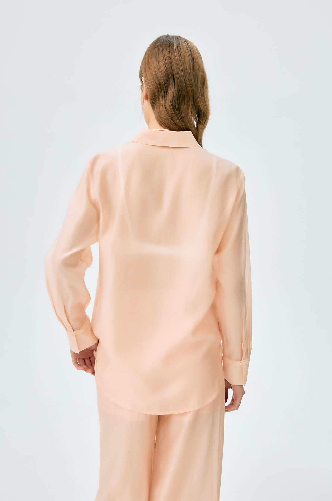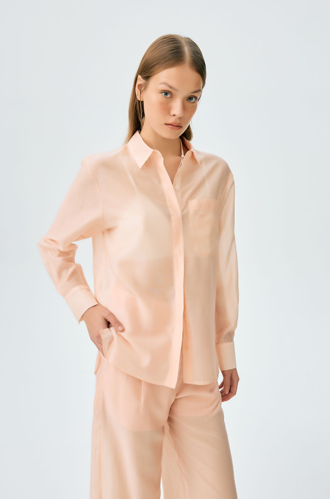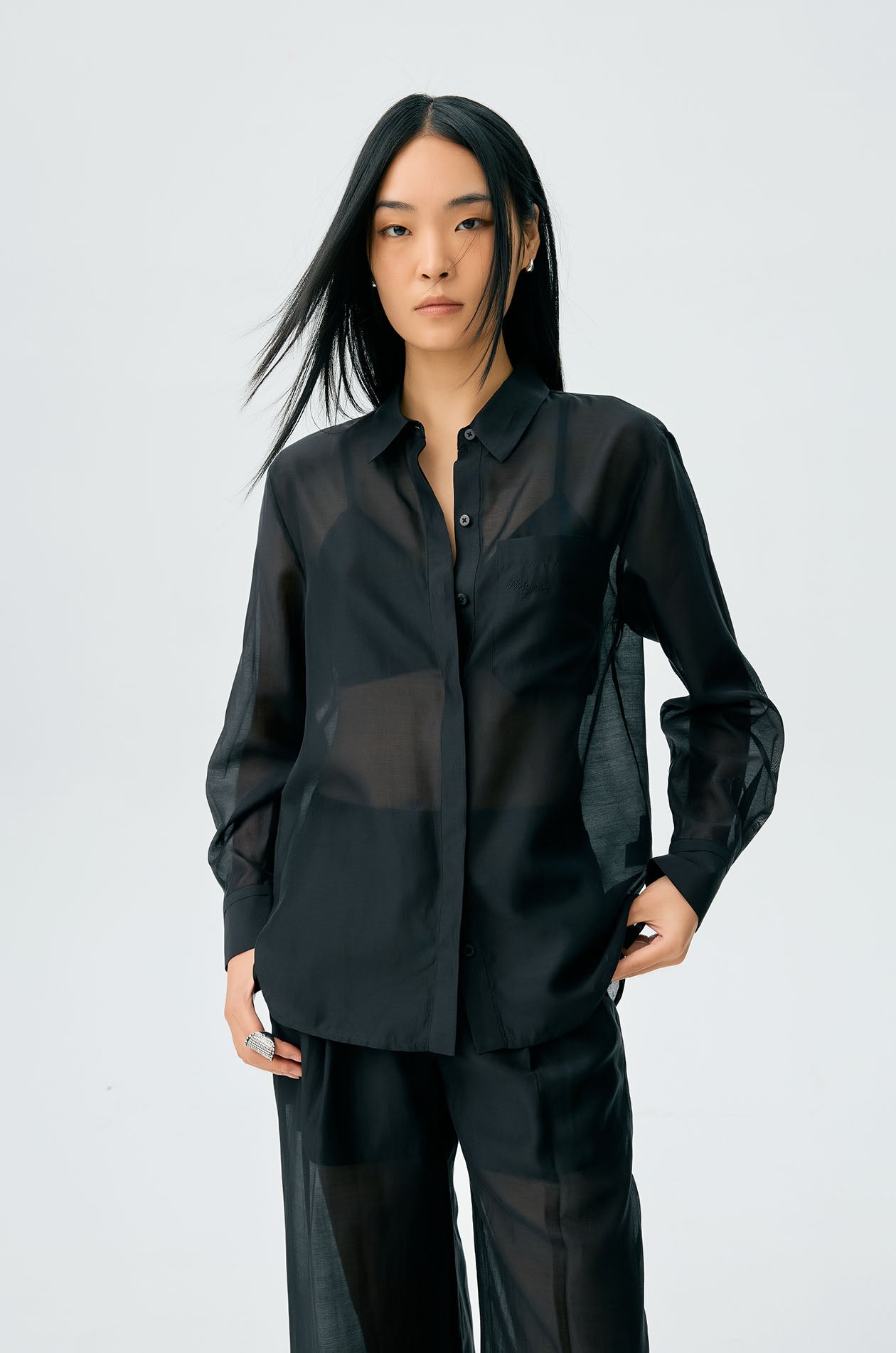 Long-sleeved shirt in sheer fabric. Regular fit with classic collar, chest pocket with logo, and buttoned cuffs. Front button closure. Available in black and spanish villa.