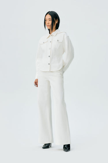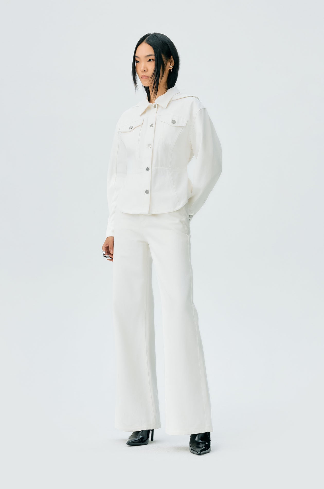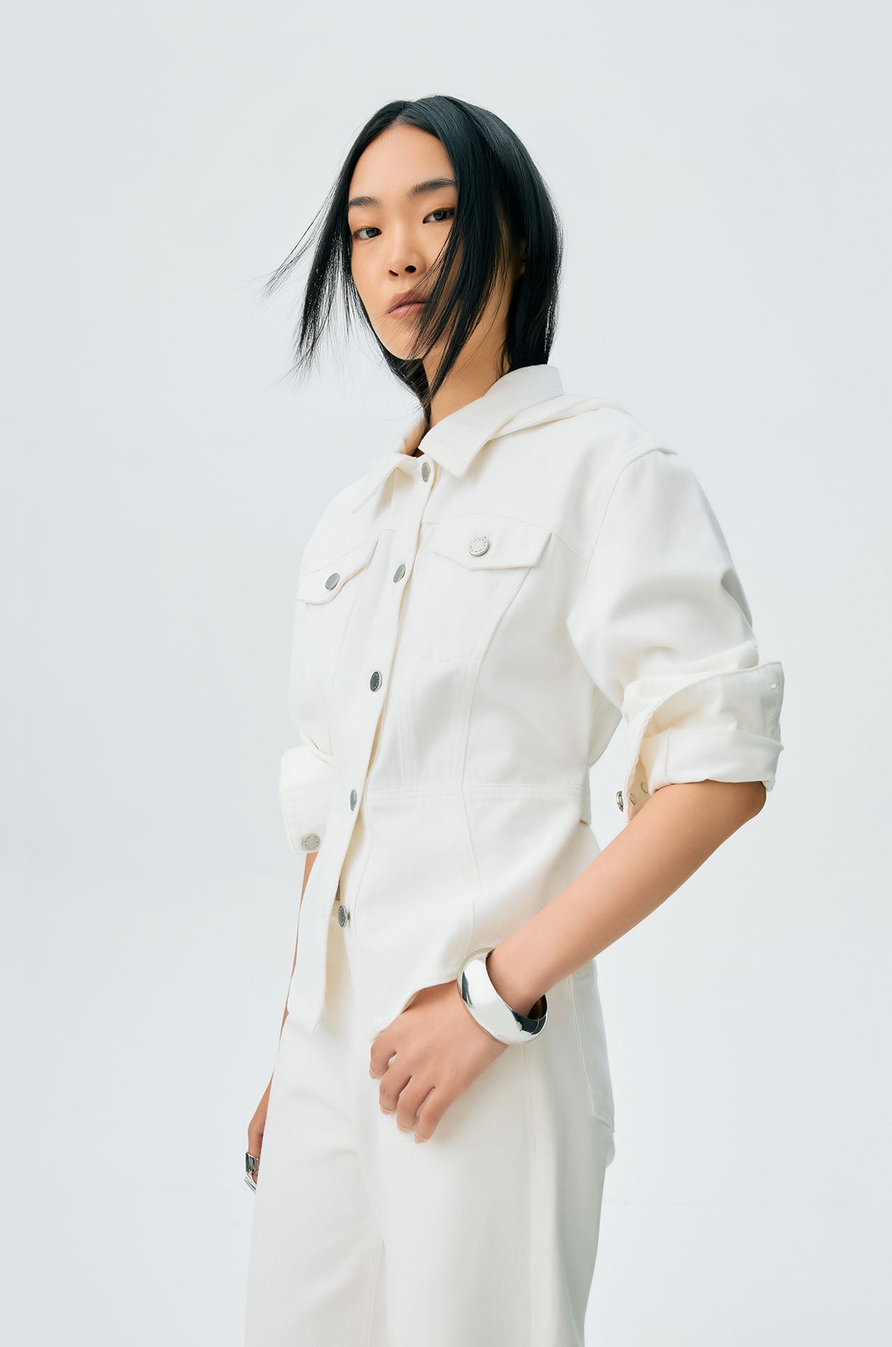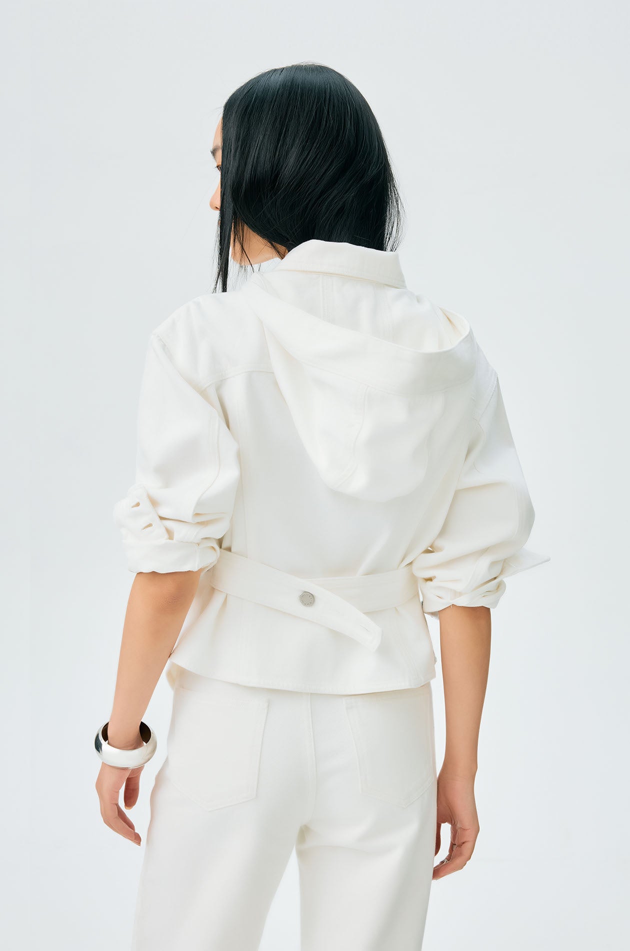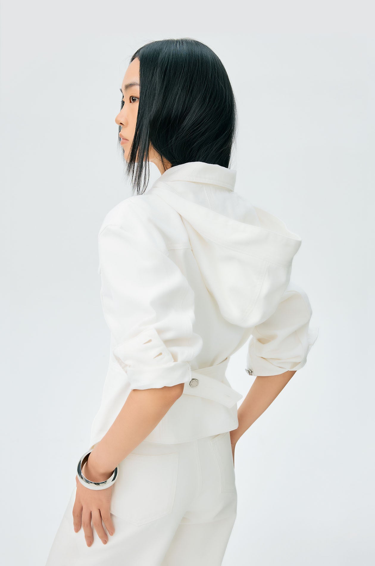 Long-sleeved trucker jacket in cotton denim. Waist-defining design with classic collar and hood. Front button closure. Available in white.