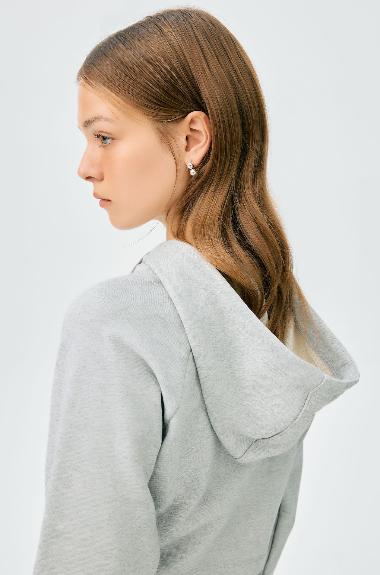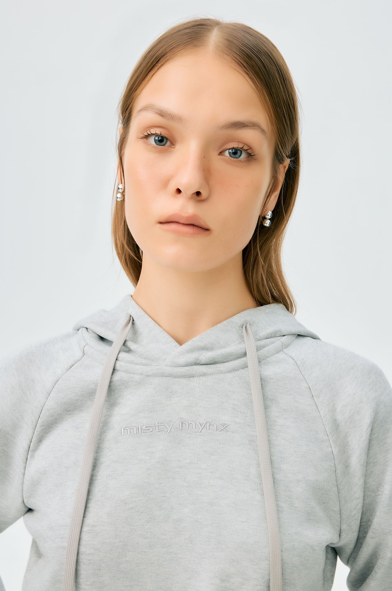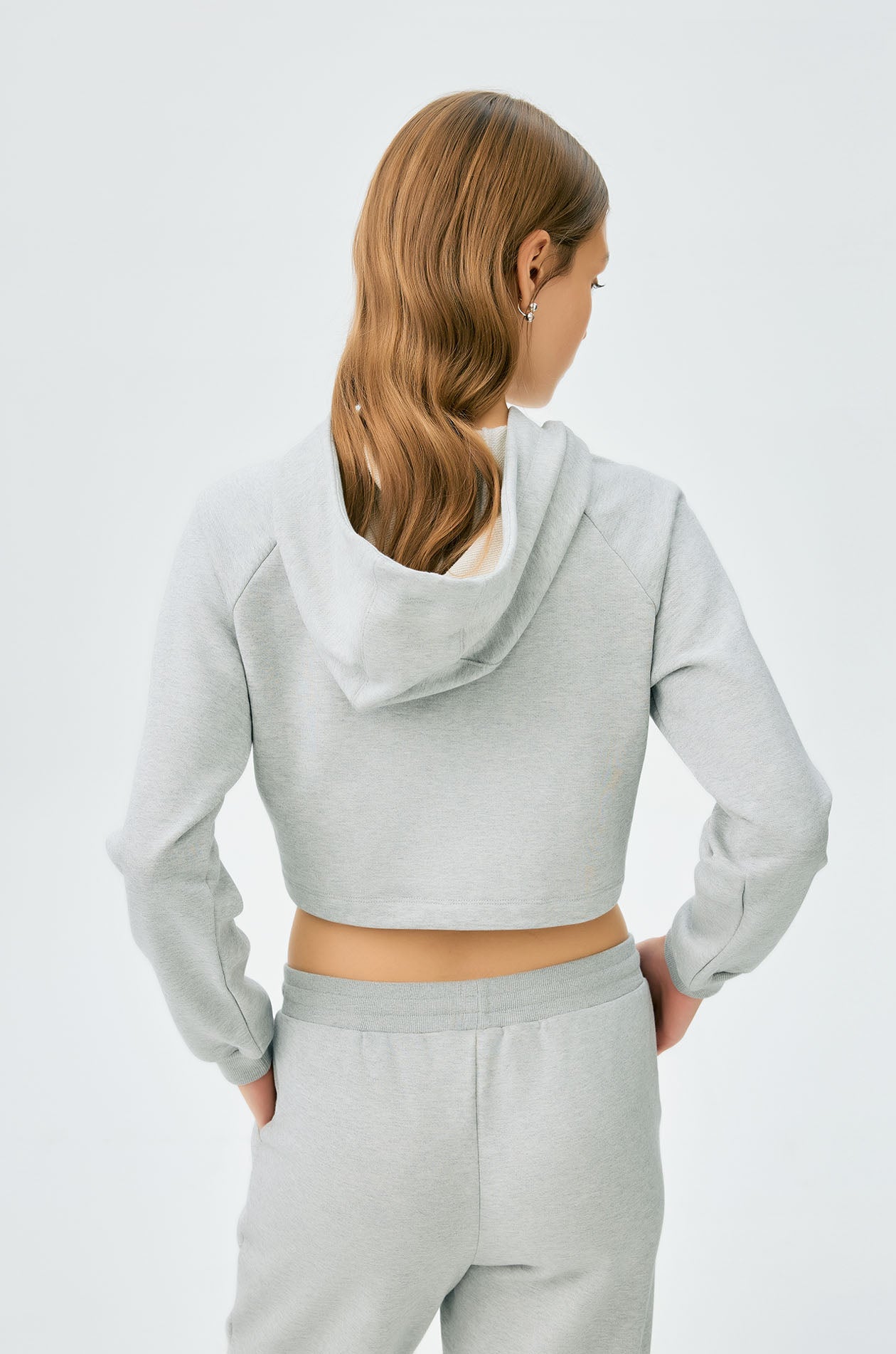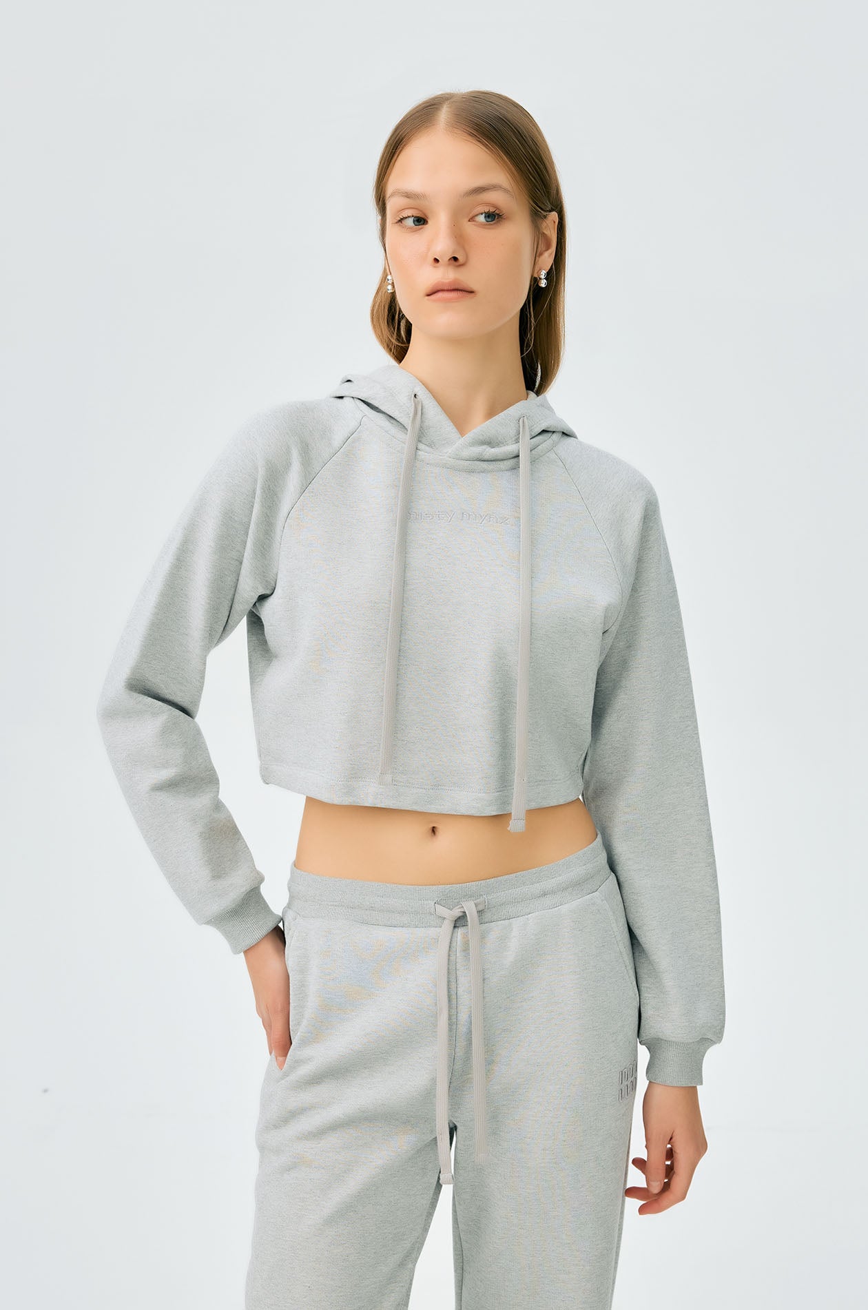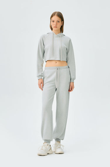 Long-sleeved cropped hoodie in French terry. Embroidered lettering logo at the front, drawstring hood, and elastic cuffs. Available in grey.