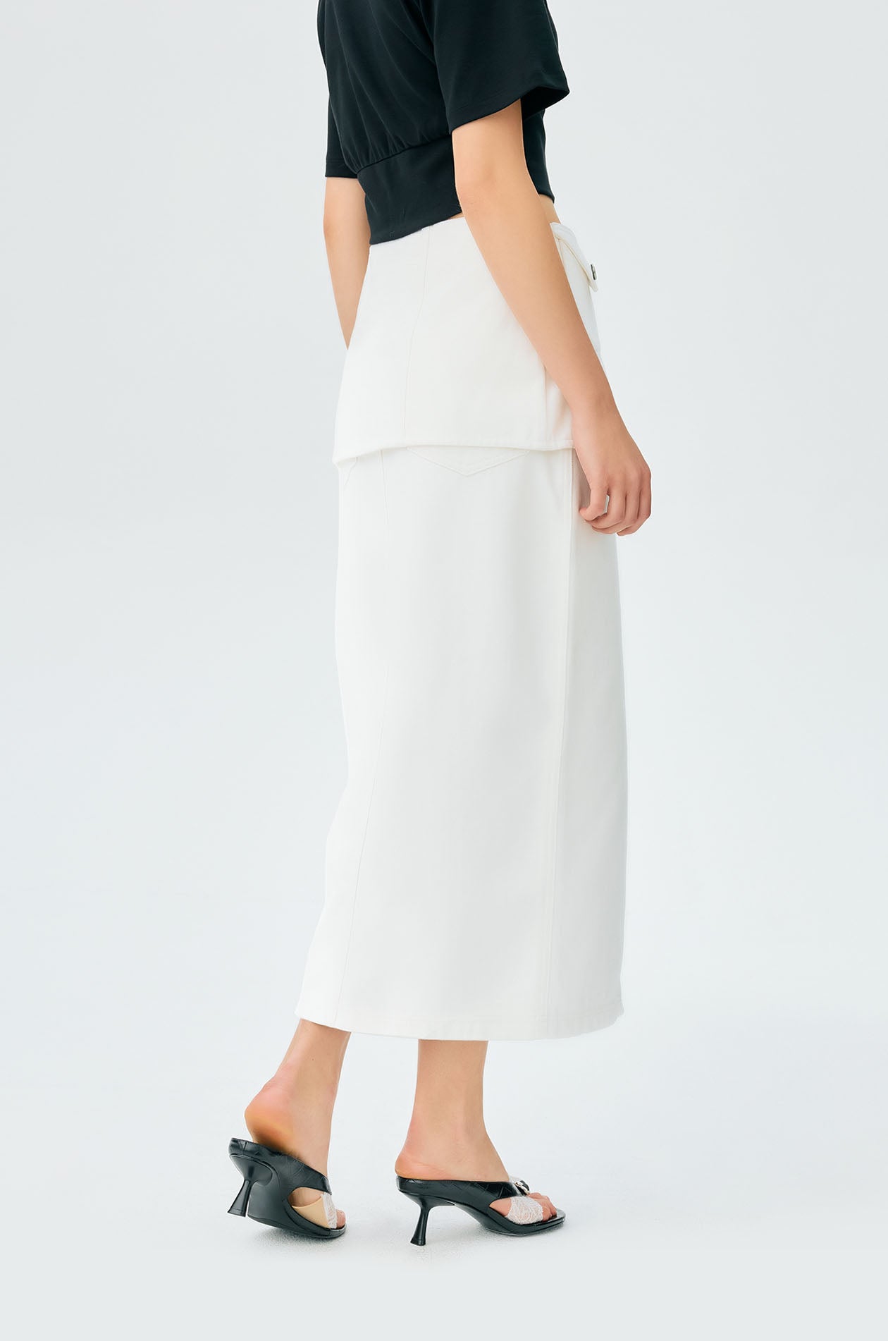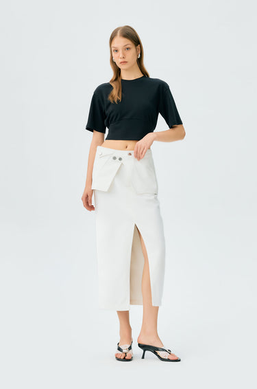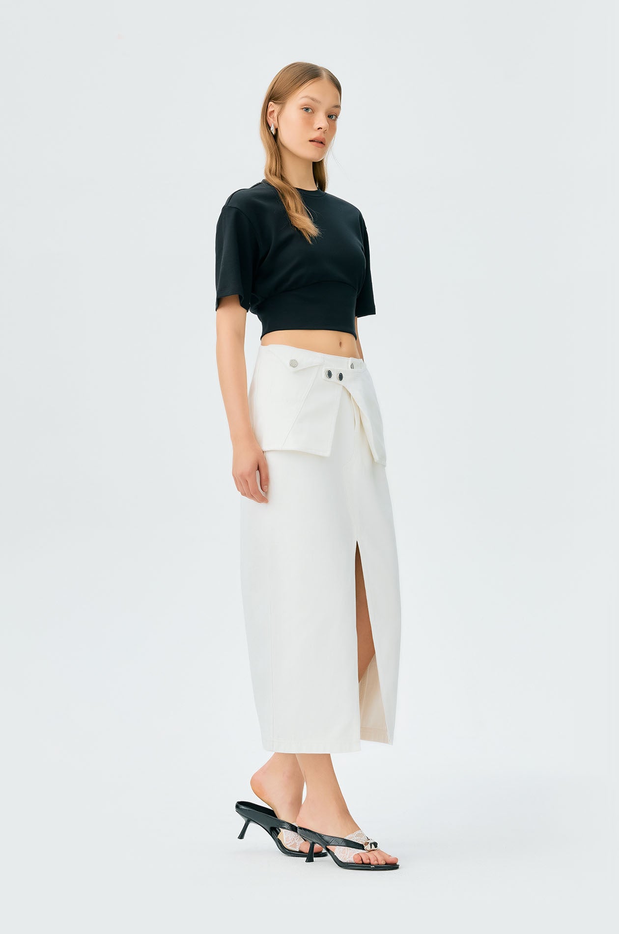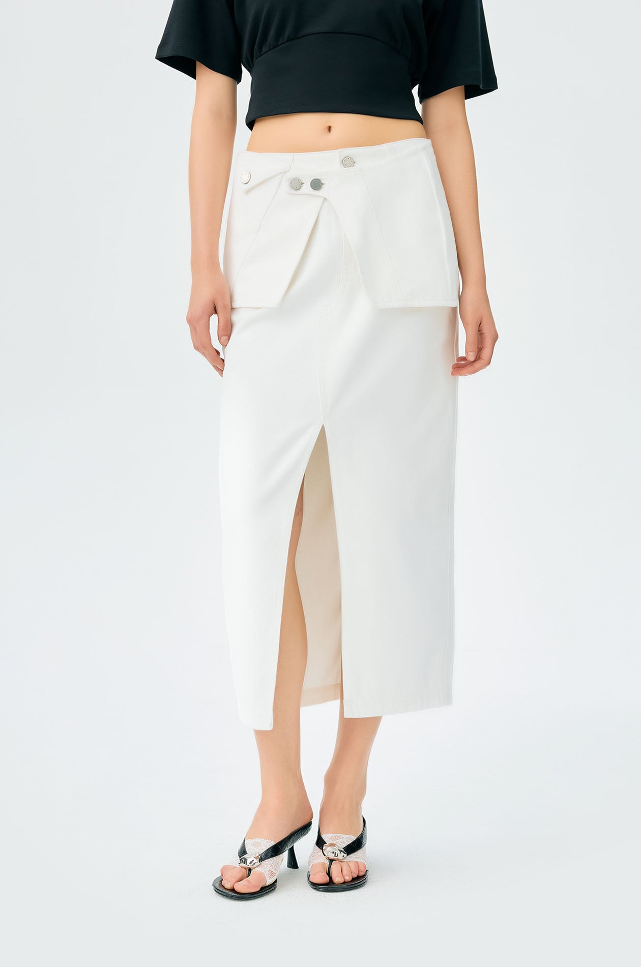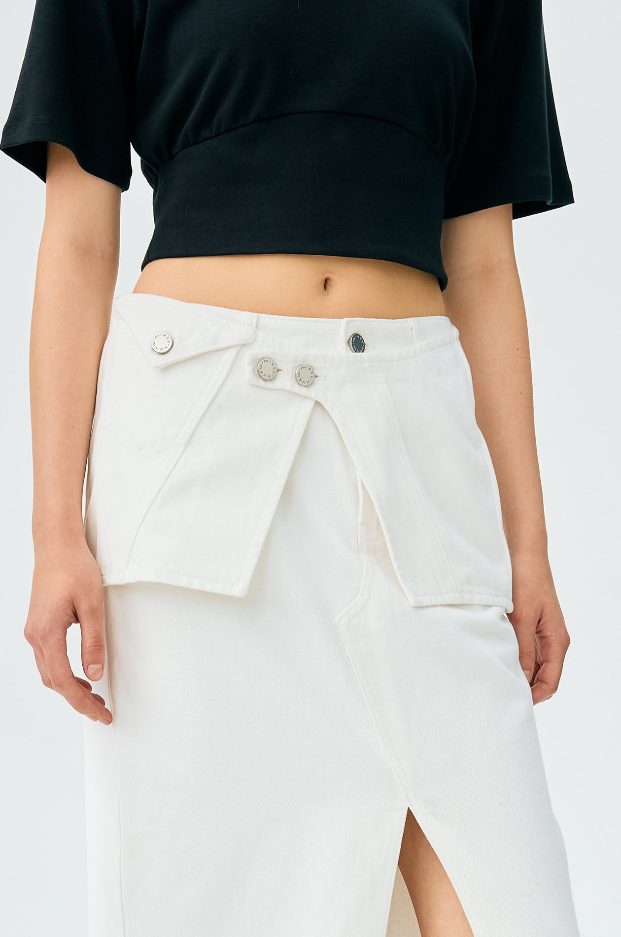 Mid-rise midi skirt in cotton denim. Pencil silhouette with front slit and removable matching flap panel. Front button and zip closure. Available in white.