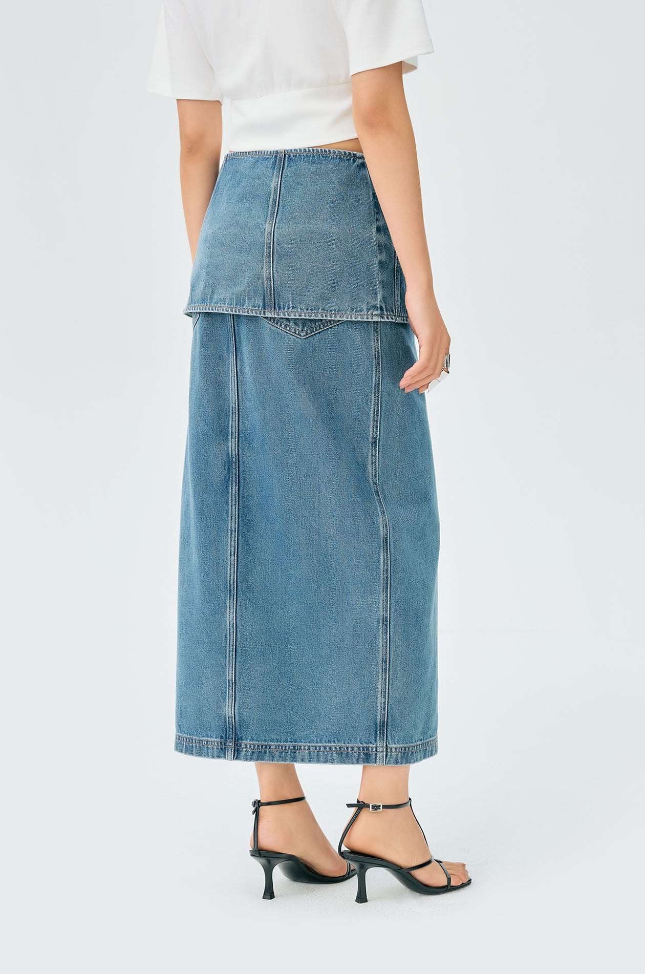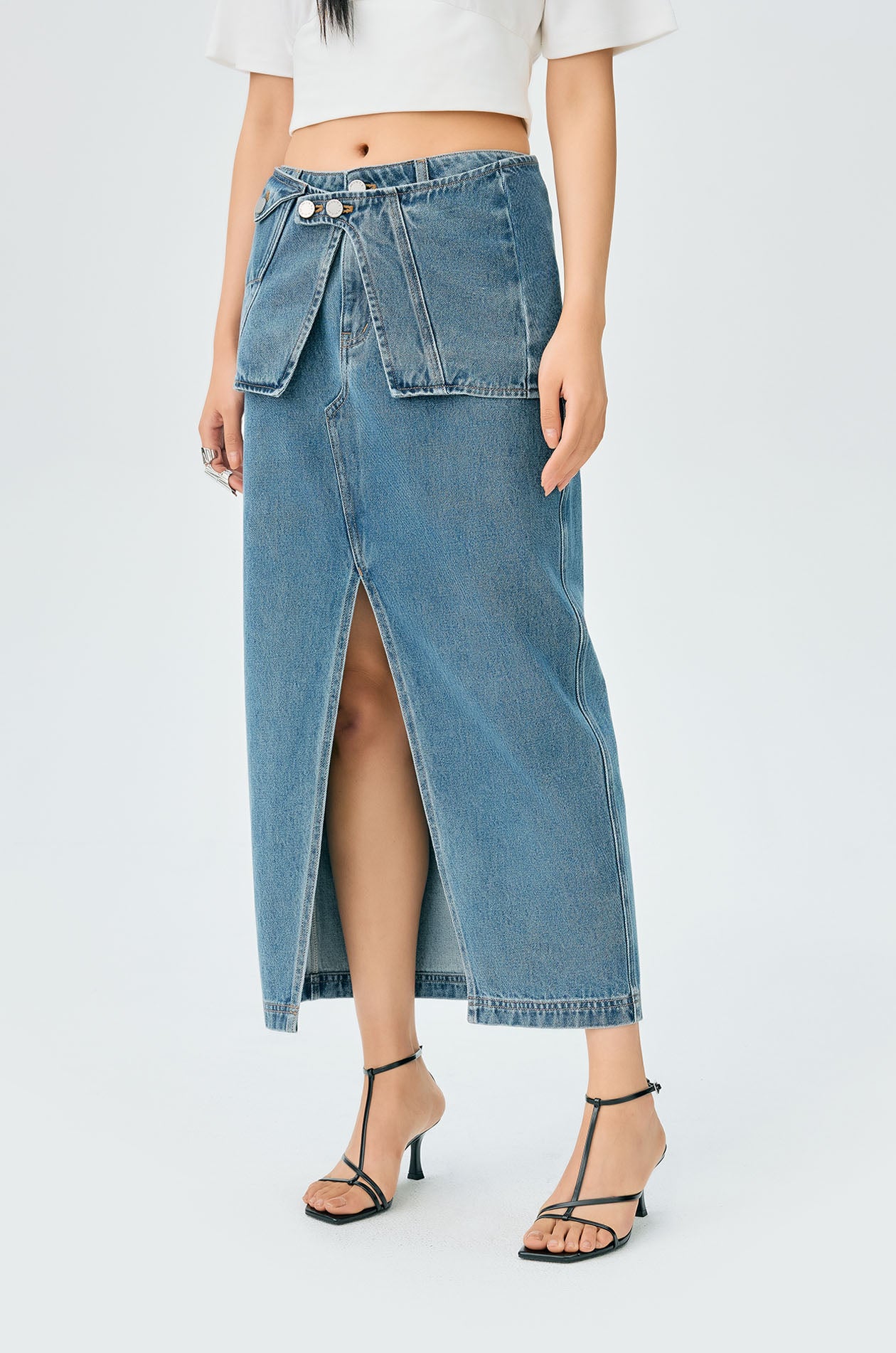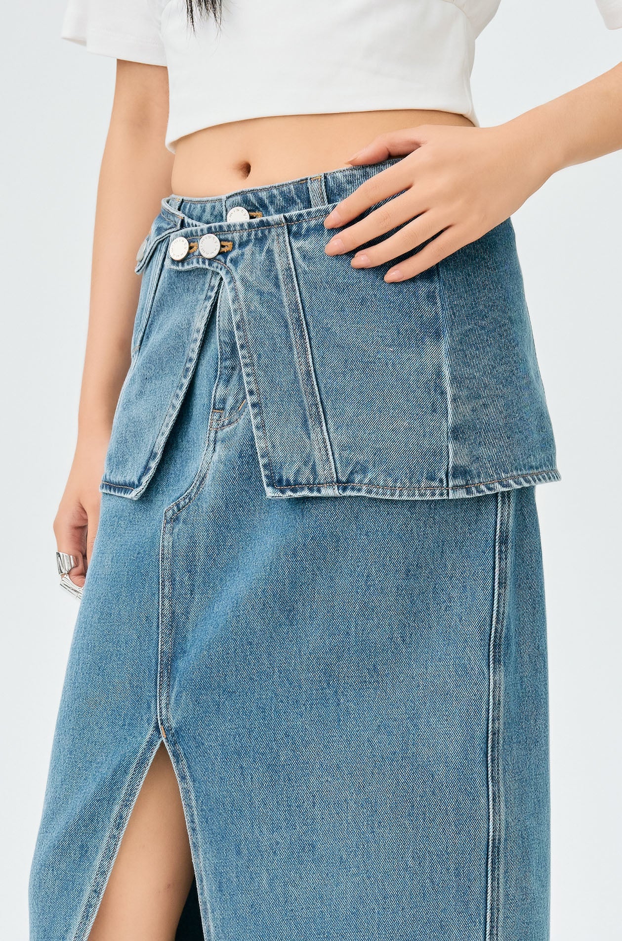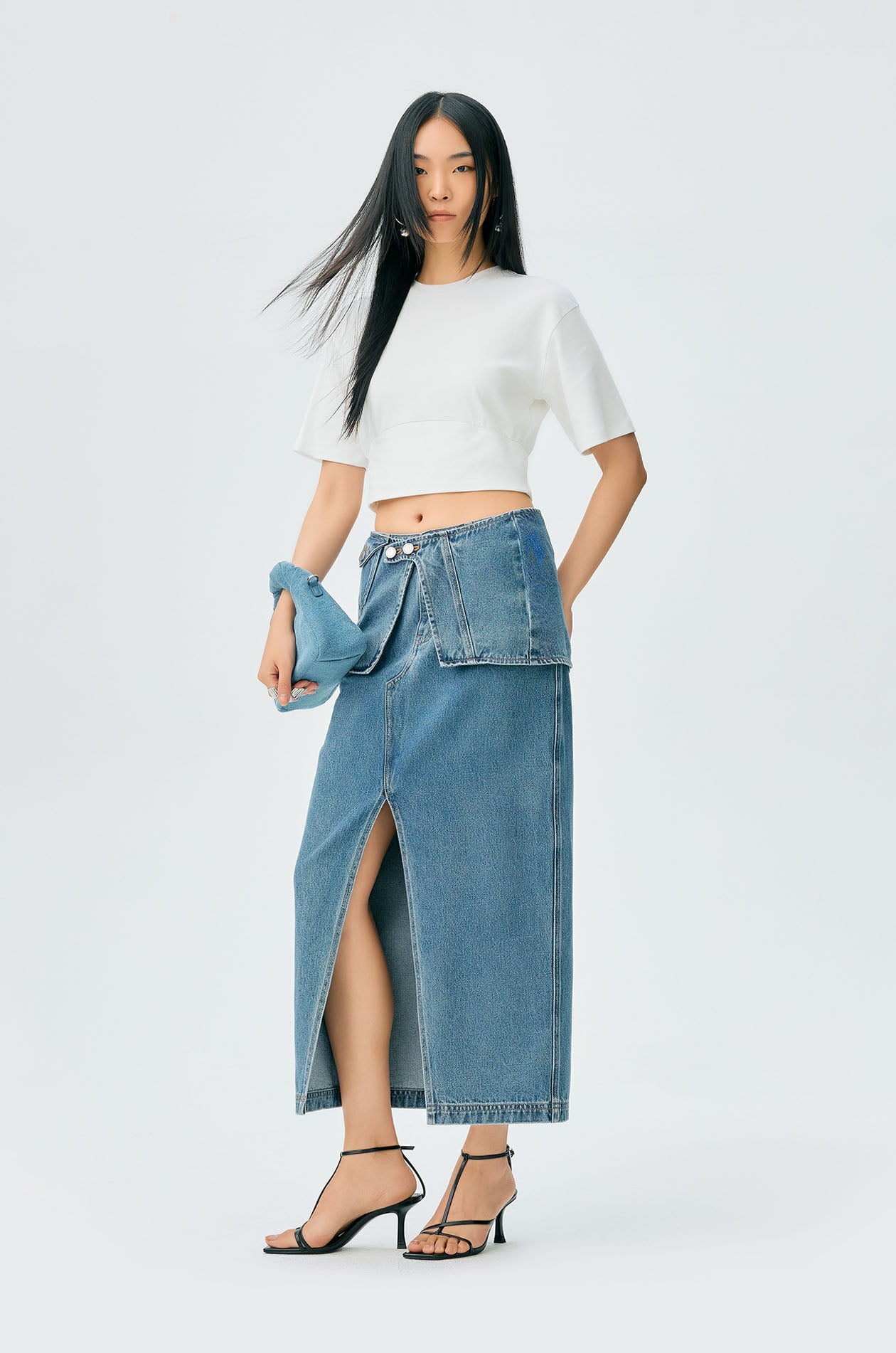 Mid-rise midi skirt in cotton denim. Pencil silhouette with front slit and removable matching flap panel. Front button and zip closure. Available in blue.
