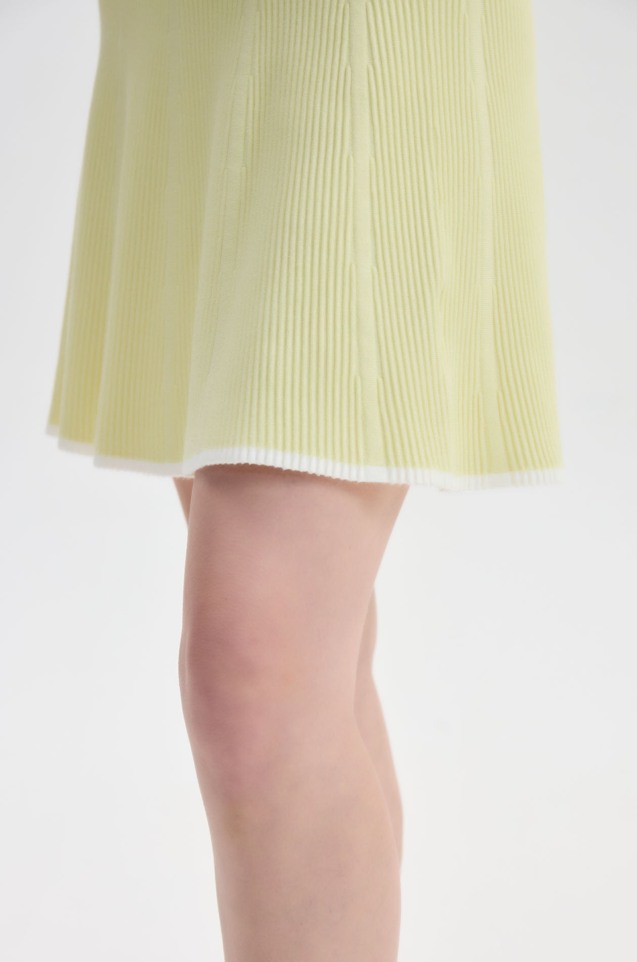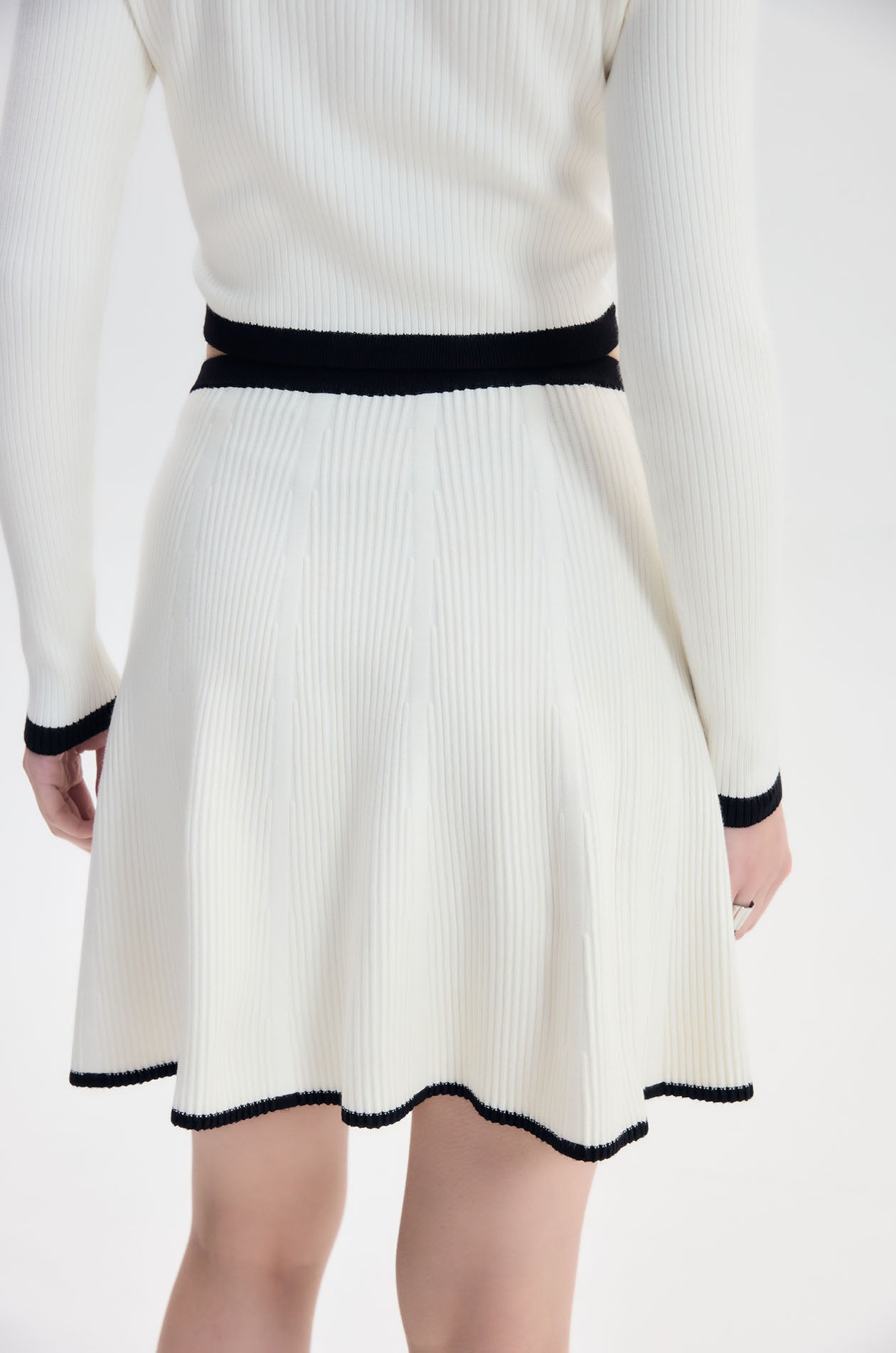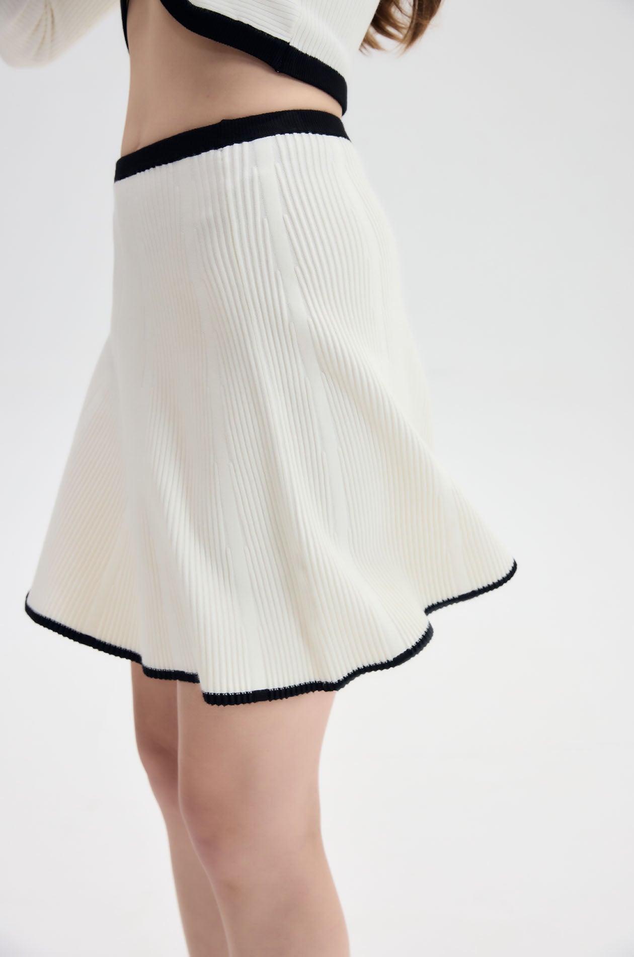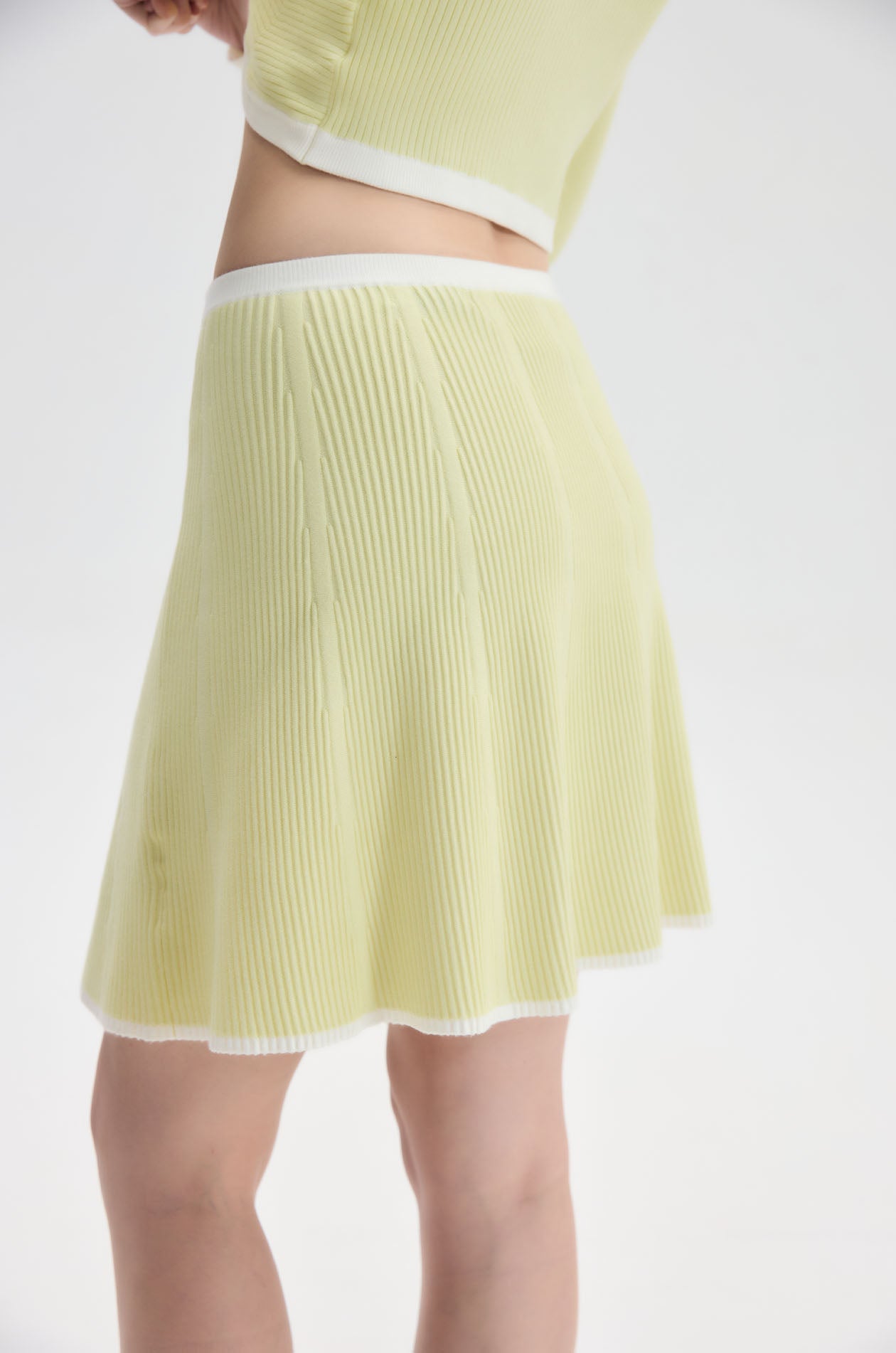 Mid-rise mini skirt in ribbed knit fabric. Flare silhouette with elastic waistband and contrast edges. Available in black, white, and celestial yellow.