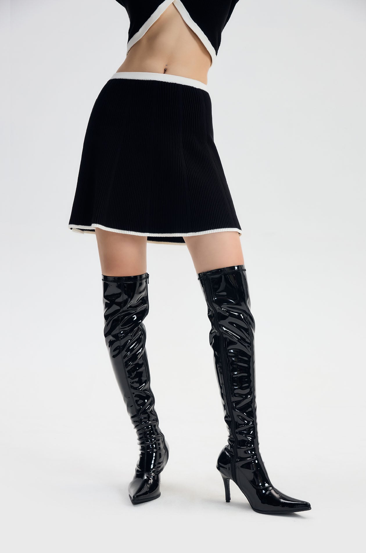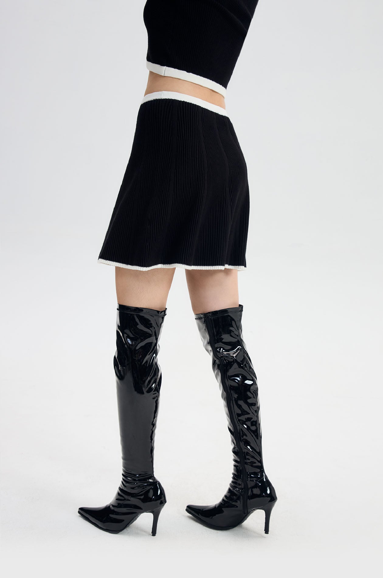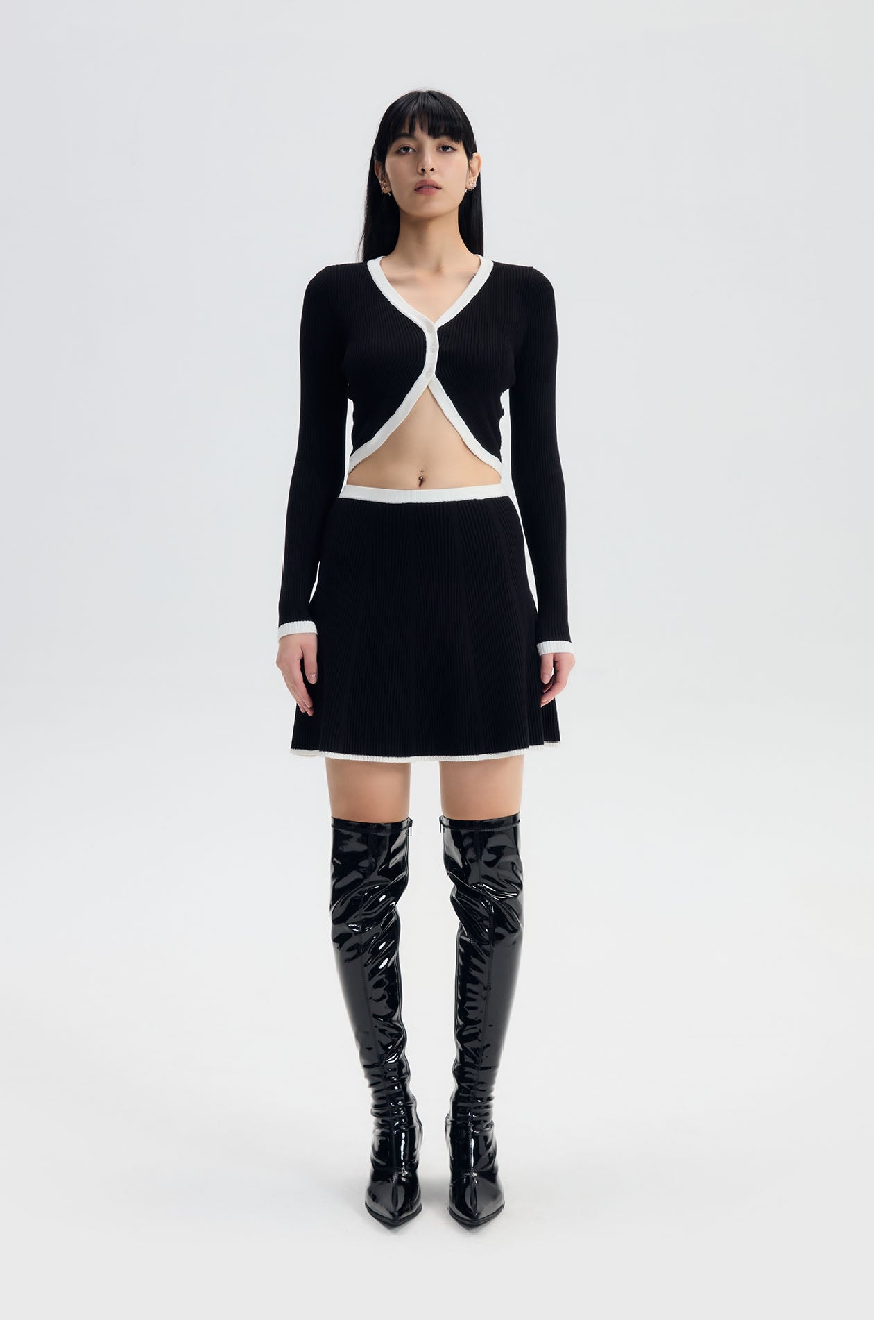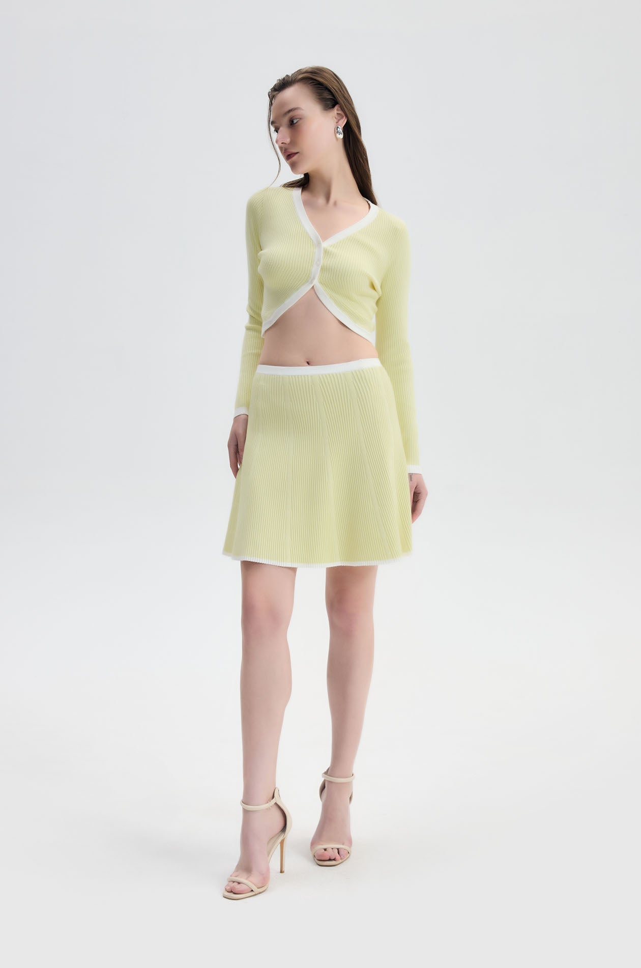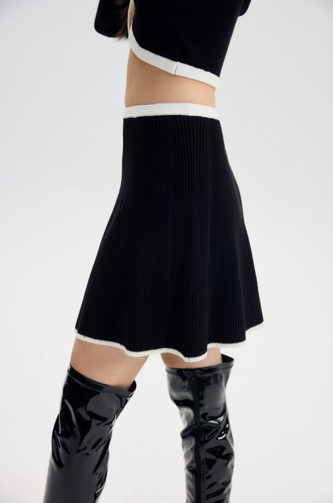 Mid-rise mini skirt in ribbed knit fabric. Flare silhouette with elastic waistband and contrast edges. Available in black, white, and celestial yellow.