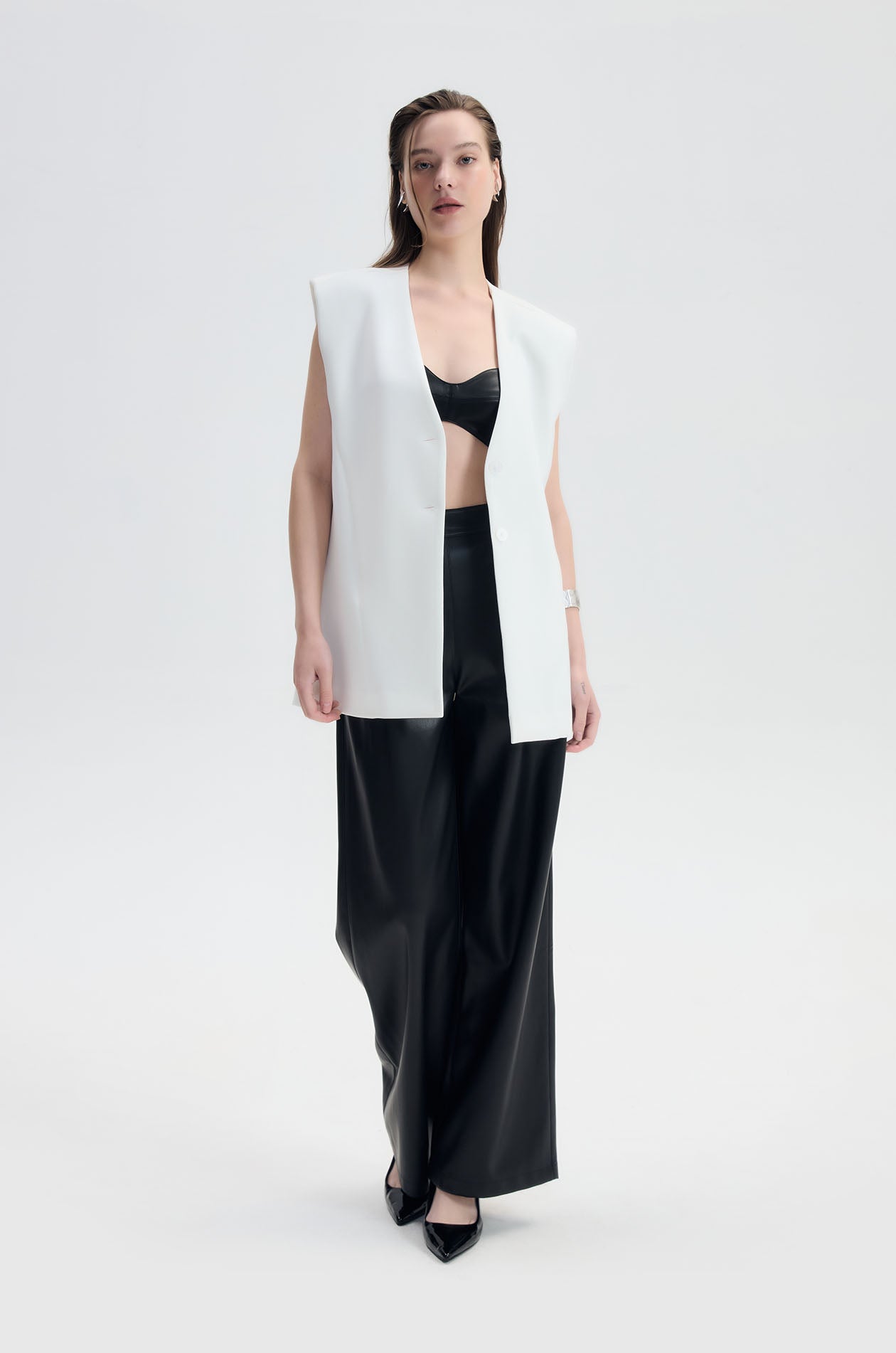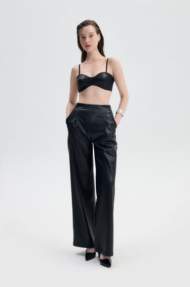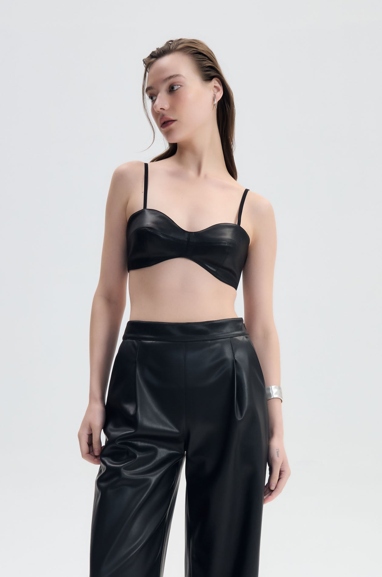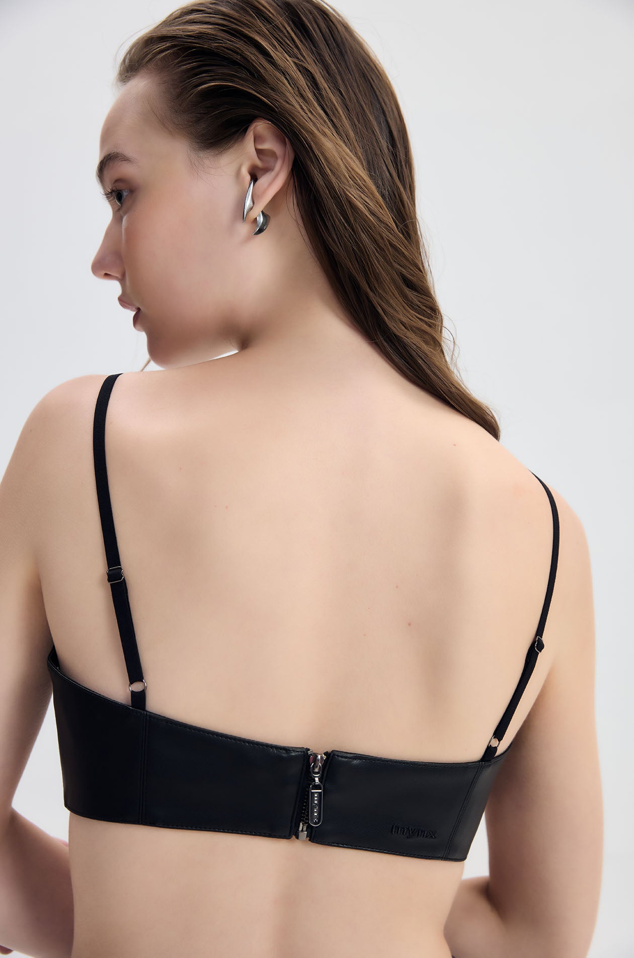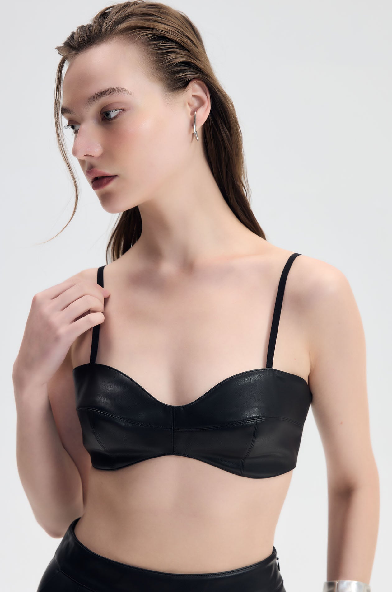 Strappy bra top in faux leather. Bandeau design with adjustable spaghetti straps. Back zip closure. Available in black.