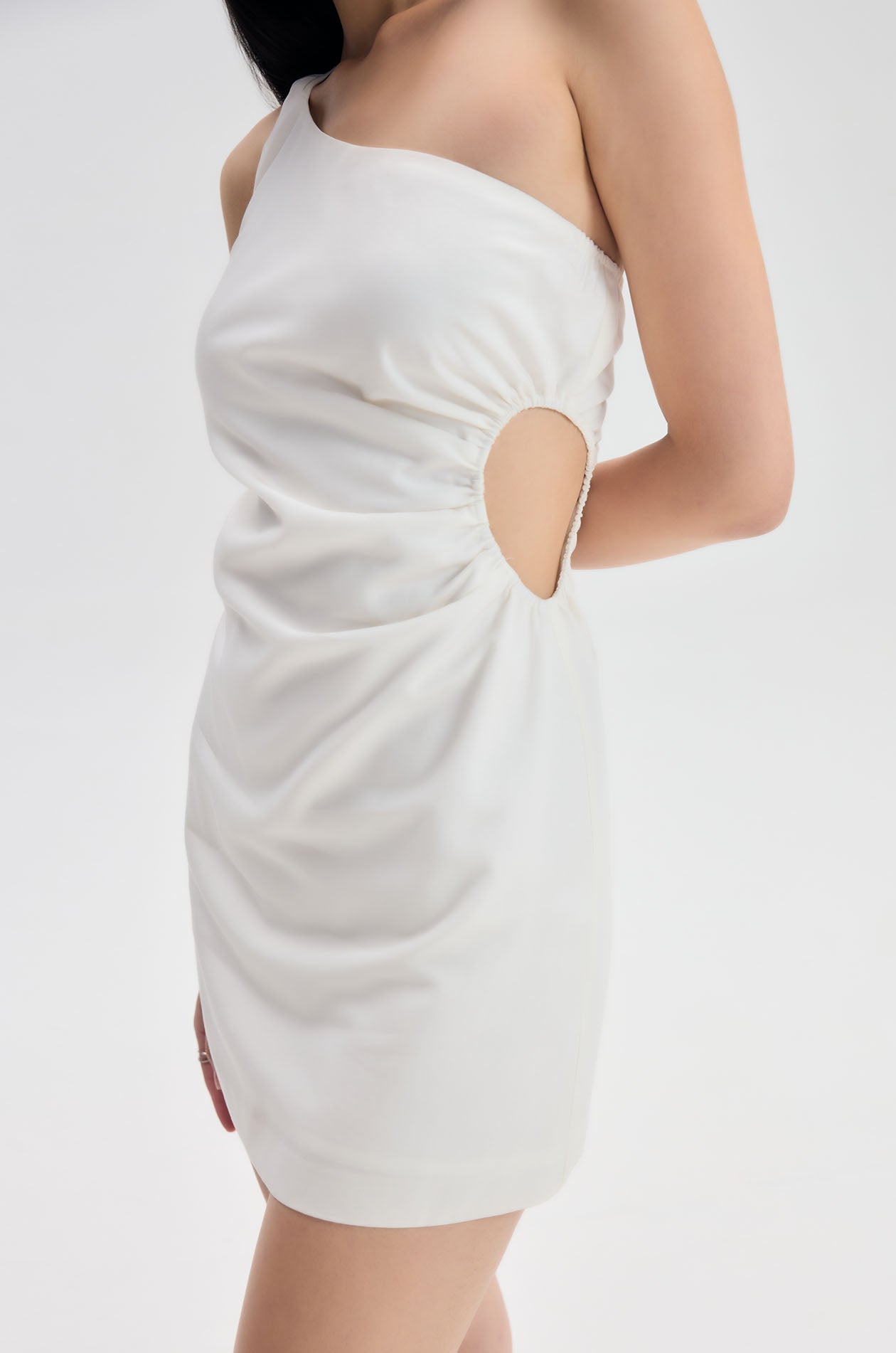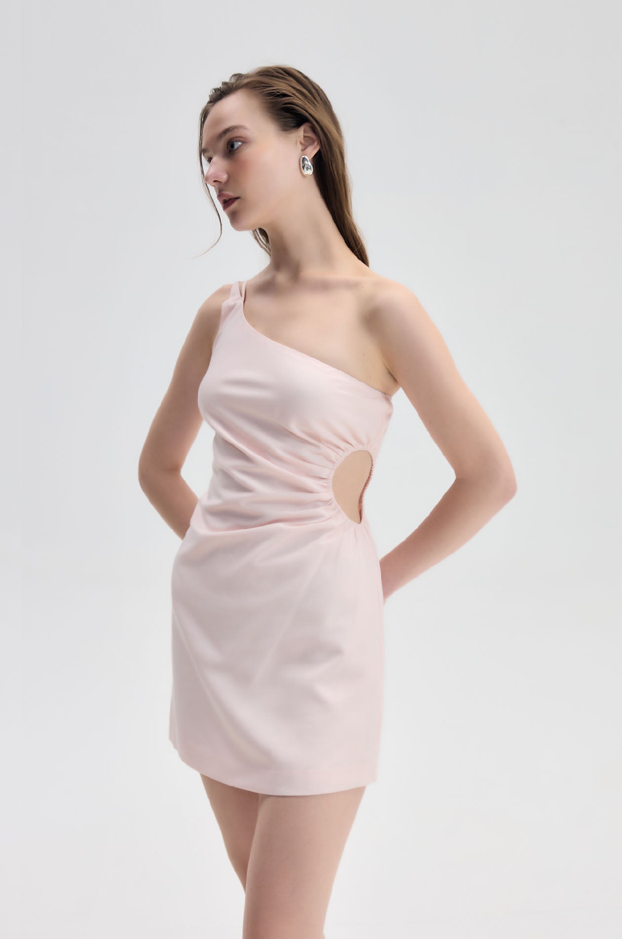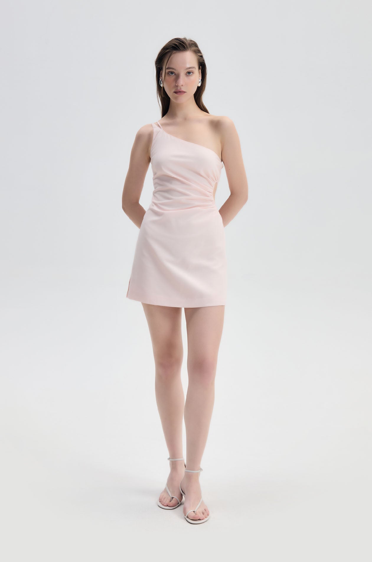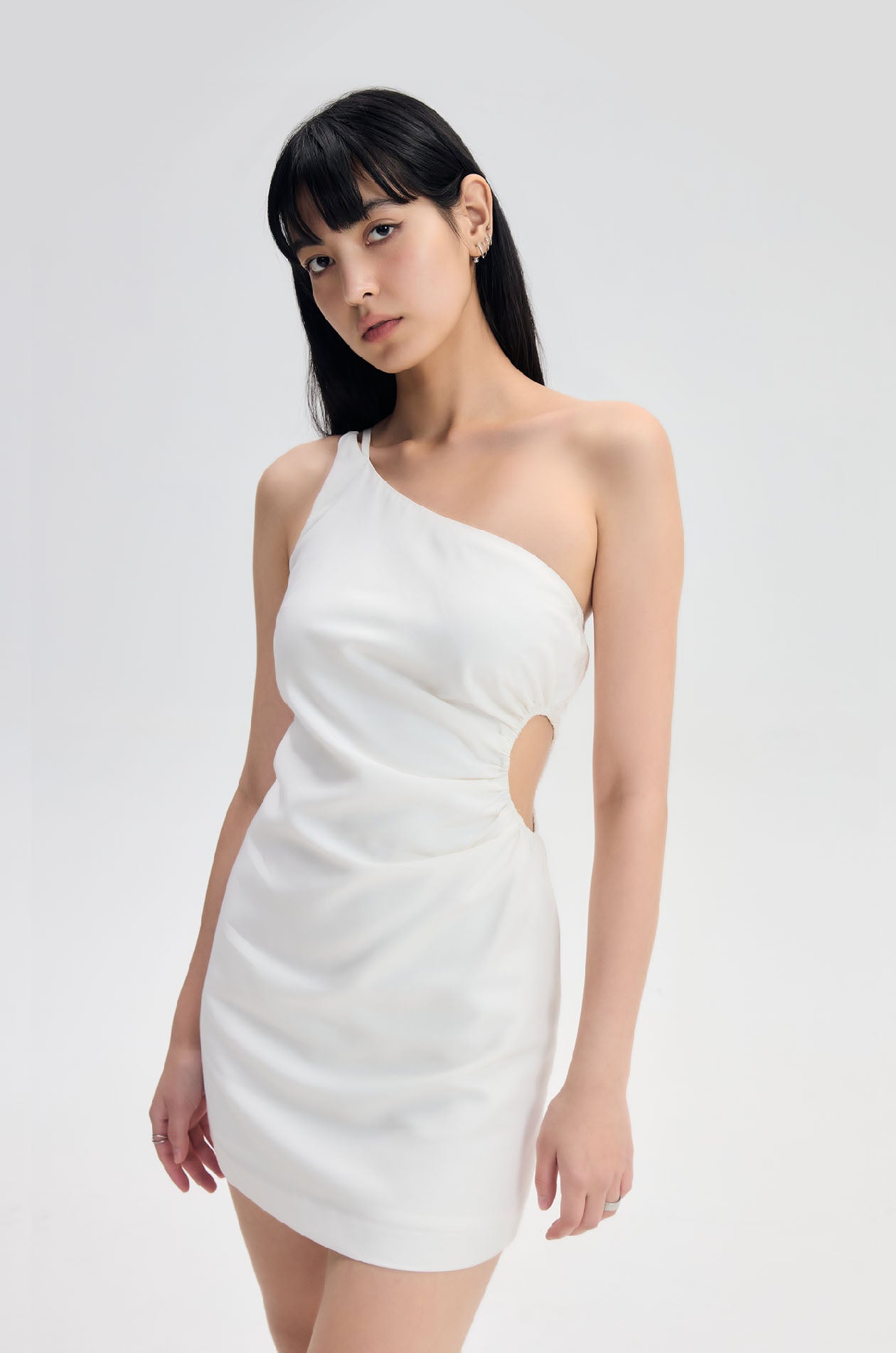 One-shoulder mini dress in textured fabric, crafted from sustainable lyocell and linen blend. Sheath silhouette with side slit and cut-out detail at the left waist. Back zip closure. Available in egret and peach blush.